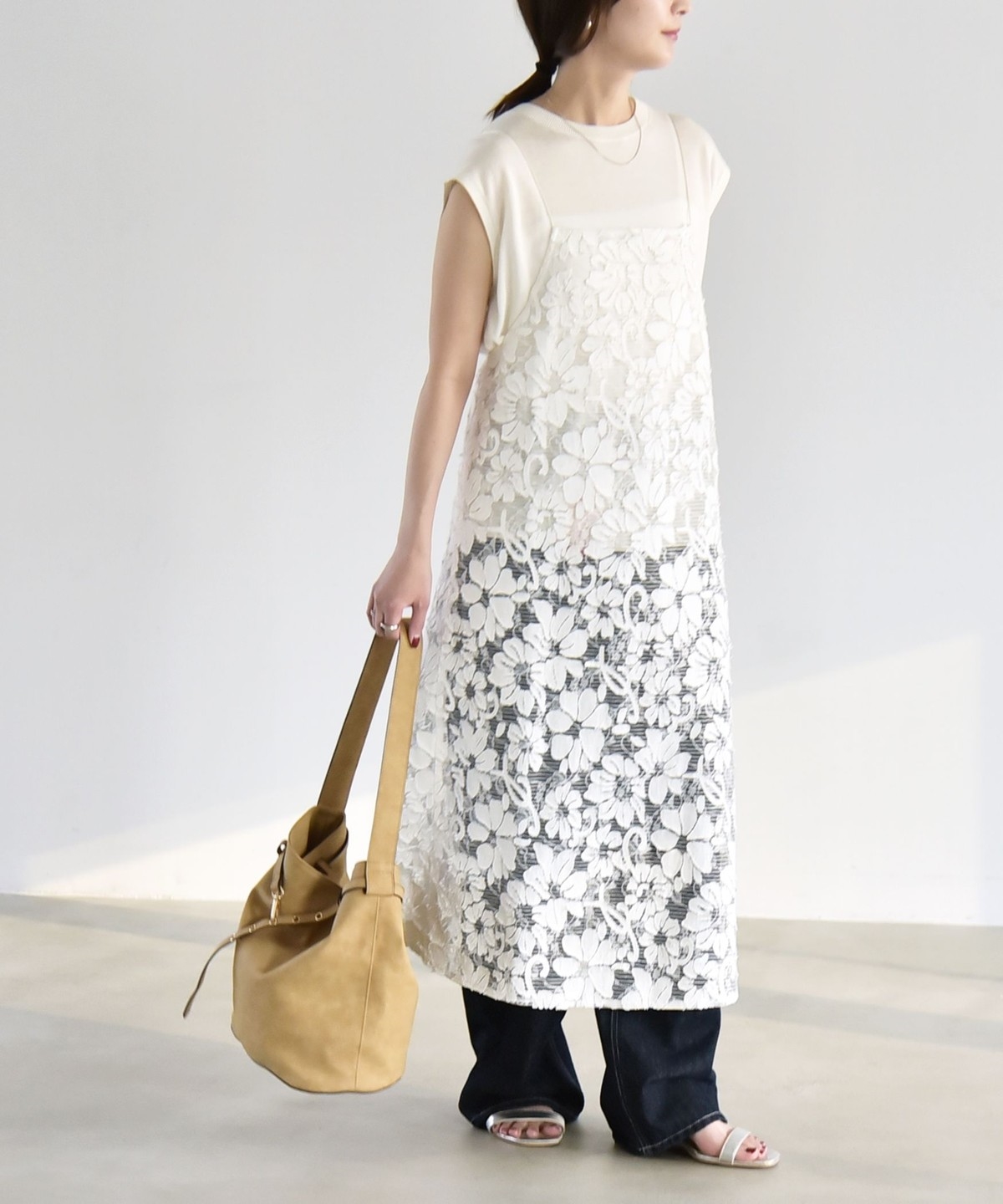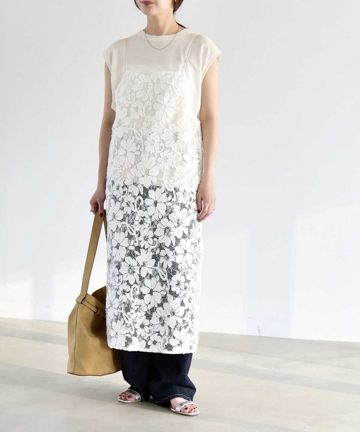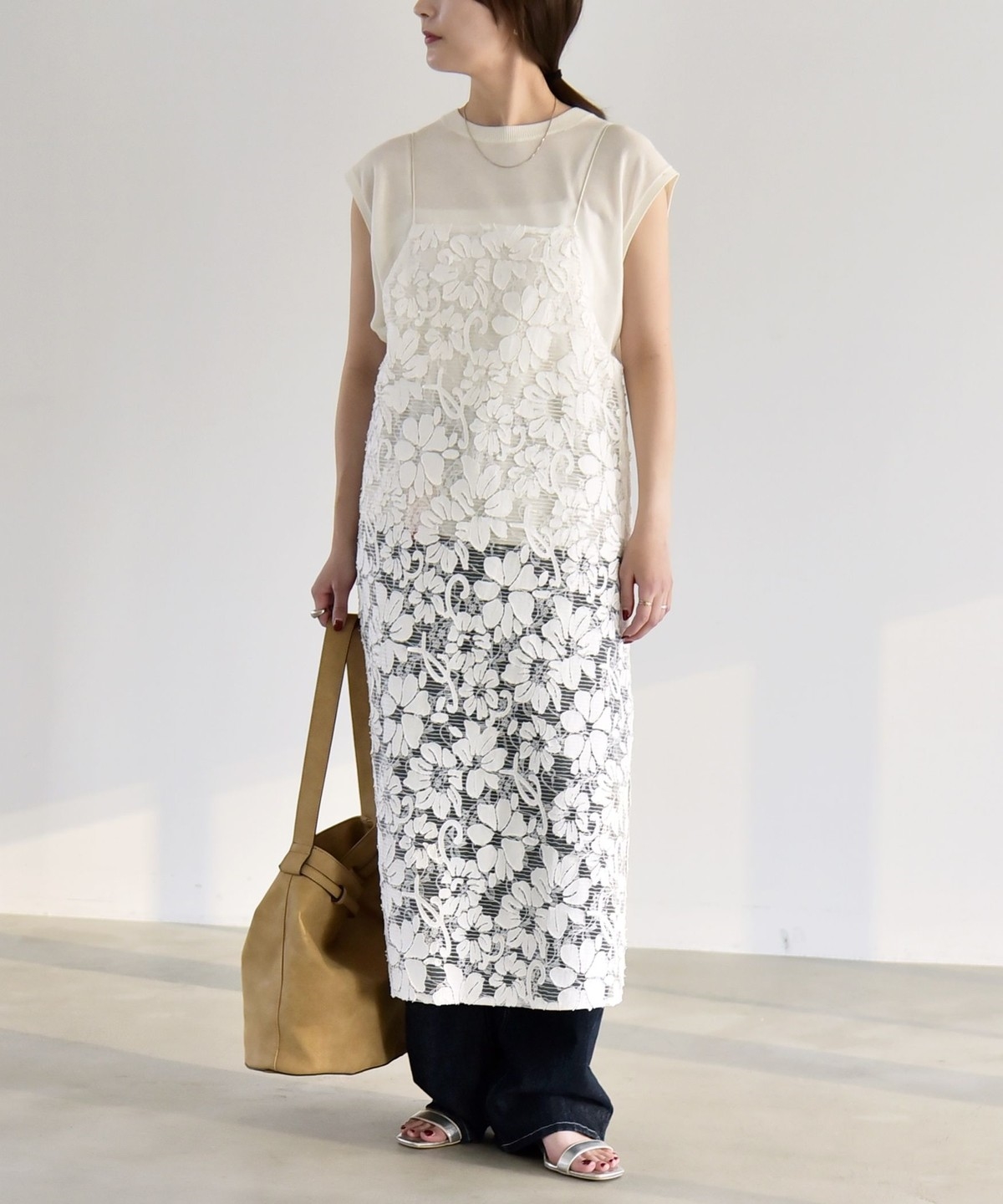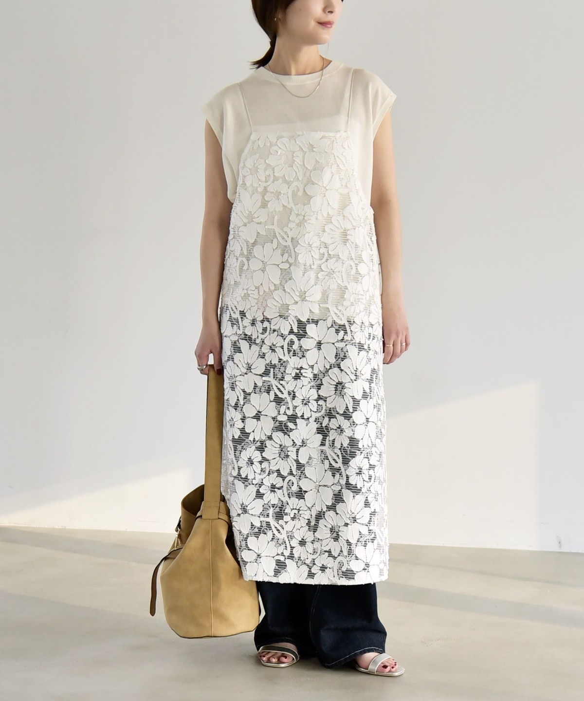 2. 《予約》quaranciel:〈手洗い可能〉デニム フラワー レース キャミ ワンピース オフホワイト