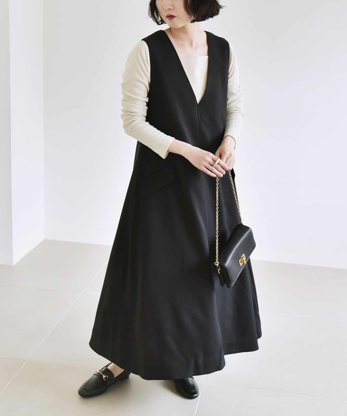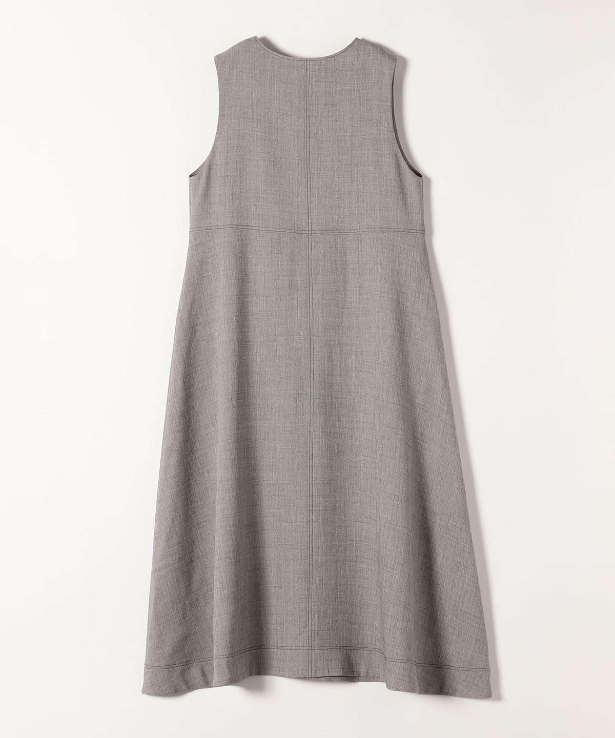 すっきりと開いたVネックラインとステッチが印象的なジャンパースカート。
