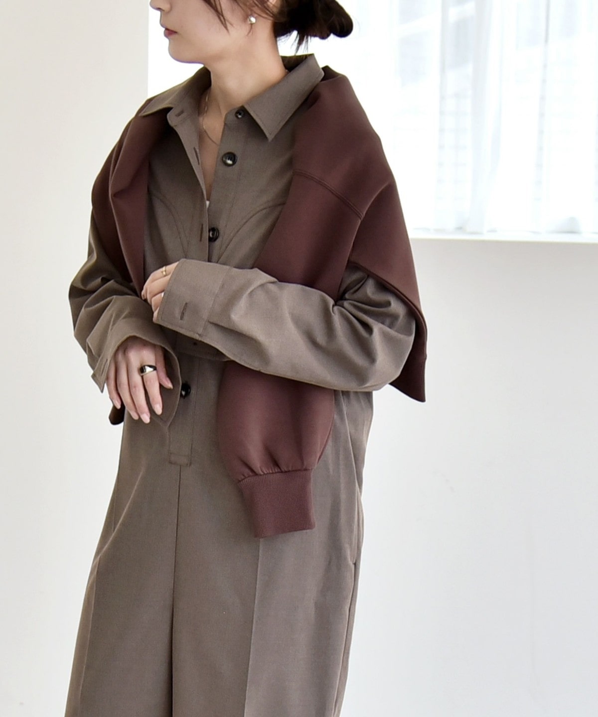 シャツカラーなので、ジャケットを羽織ったり、ニットやスウェットを着て襟や袖を出した着こなしもおすすめ。