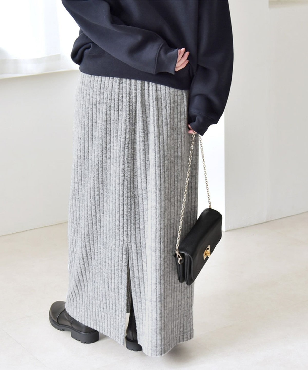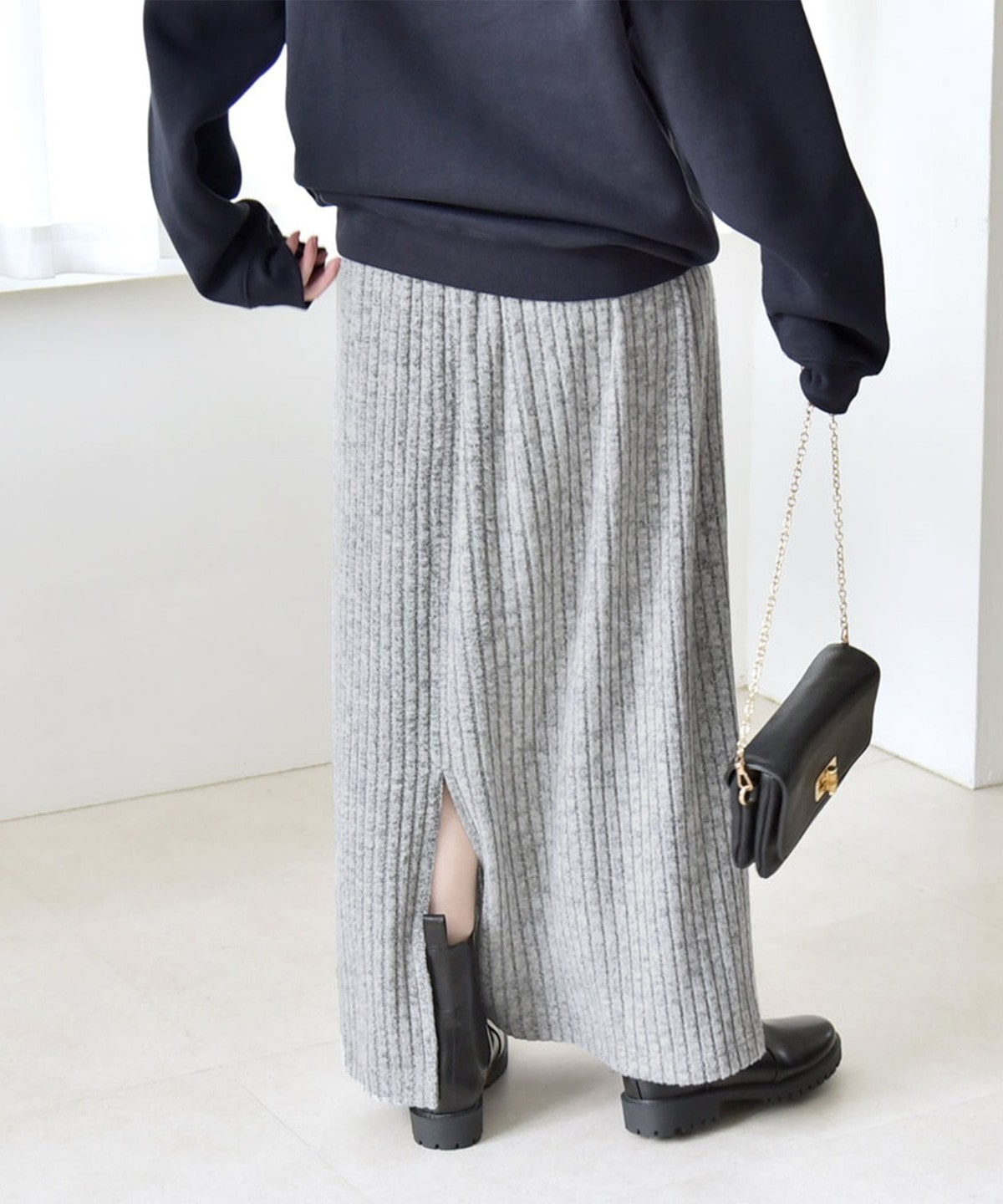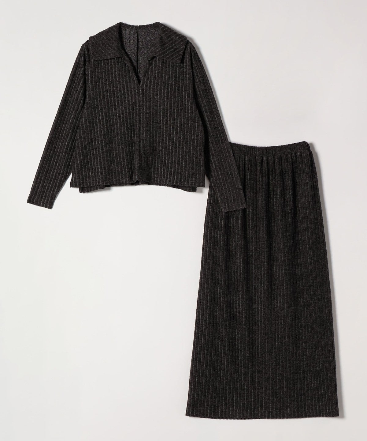 起毛感があり、柔らかく着心地の良いリブニット素材のトップス×スカートセットアップ。