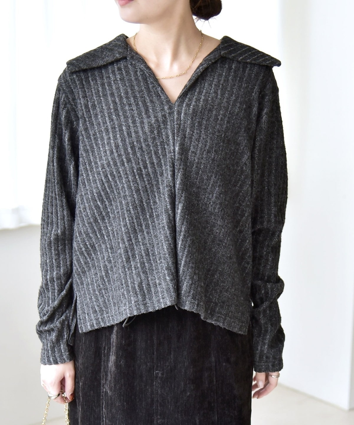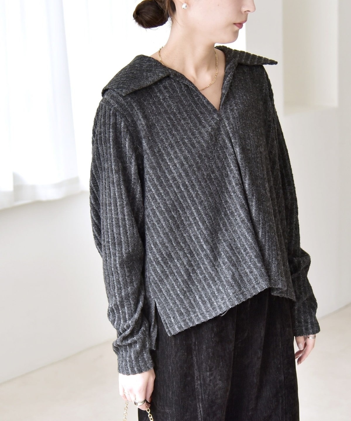 トップスはVネックに開いたスキッパーデザインのプルオーバー。