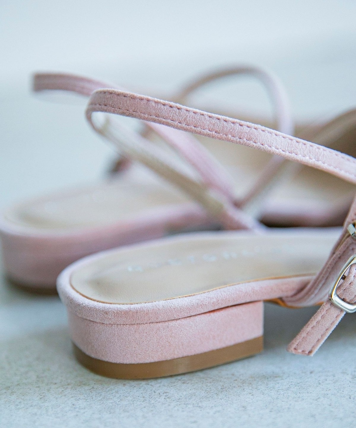 フラットヒールで楽な履き心地ながら、華奢なストラップで女性らしい足元を演出します。
