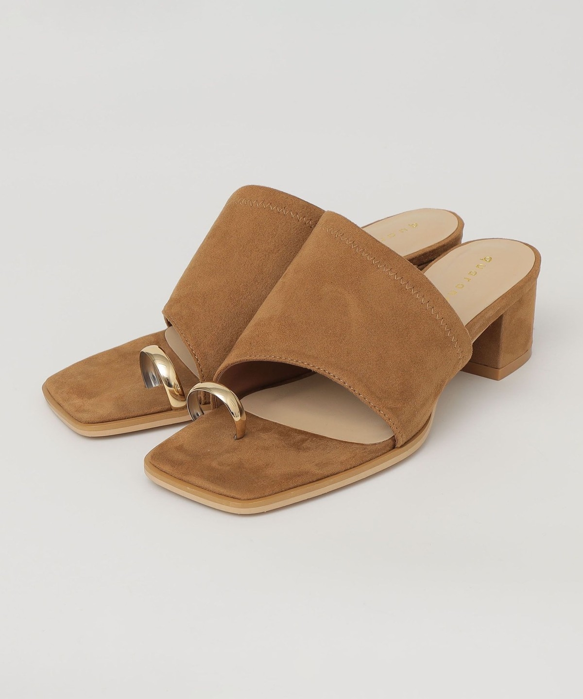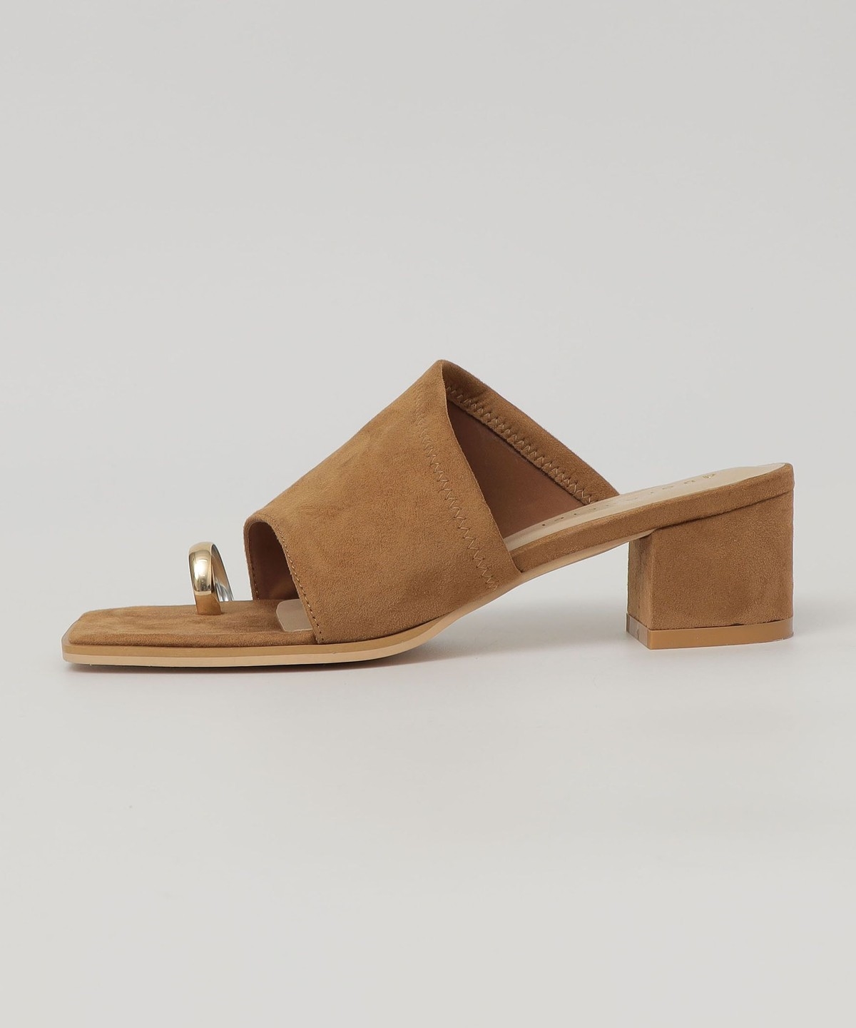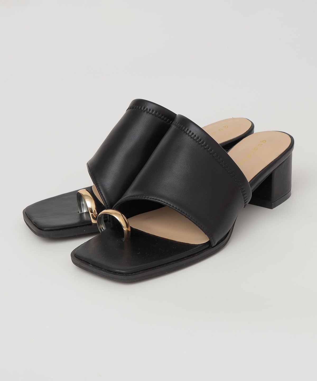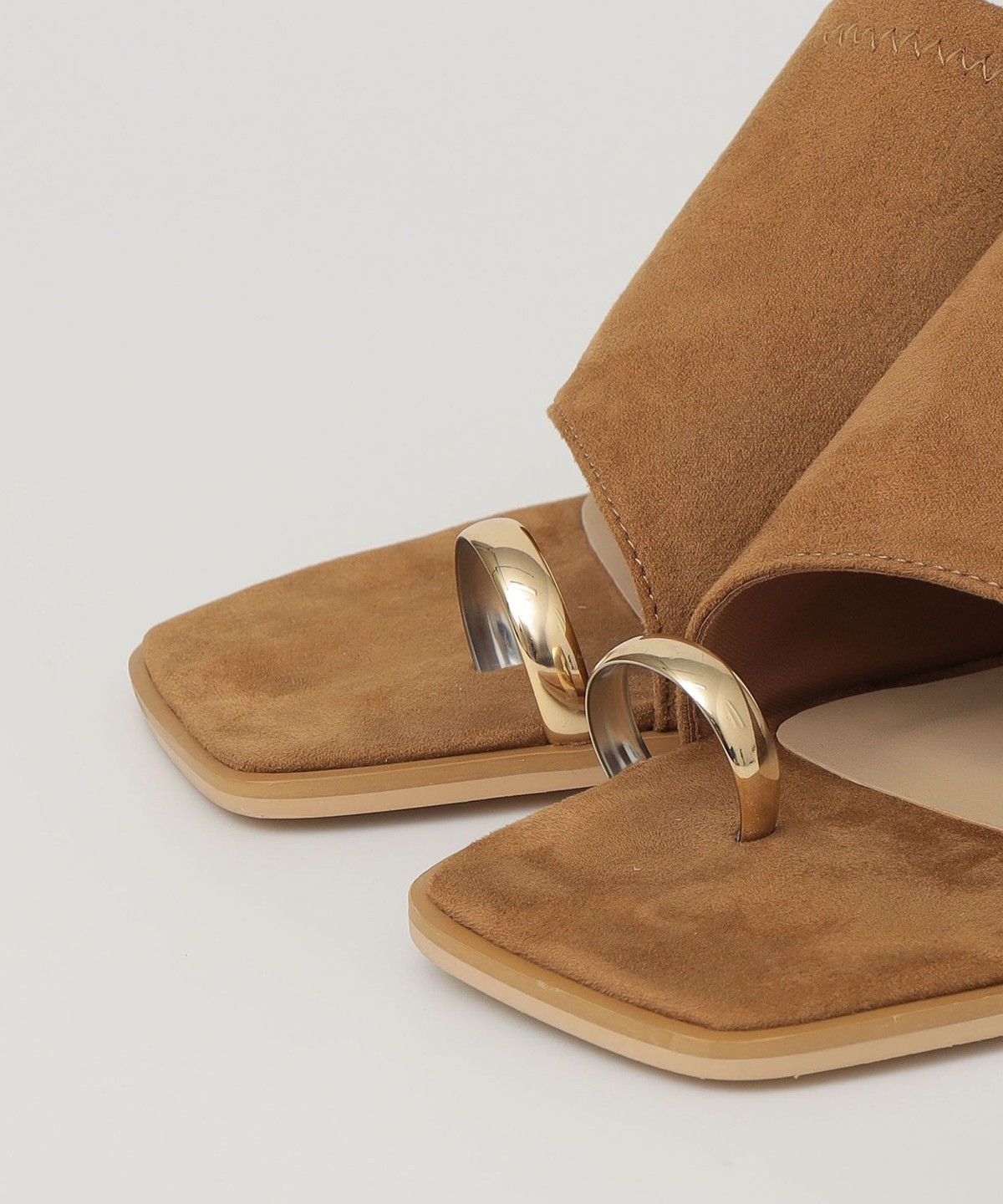親指部分のゴールドのサムリングデザインが目を惹く、ヒールのスライドサンダル。