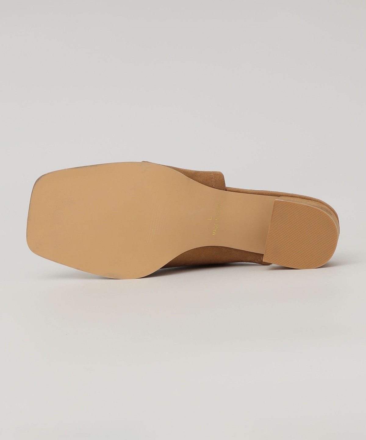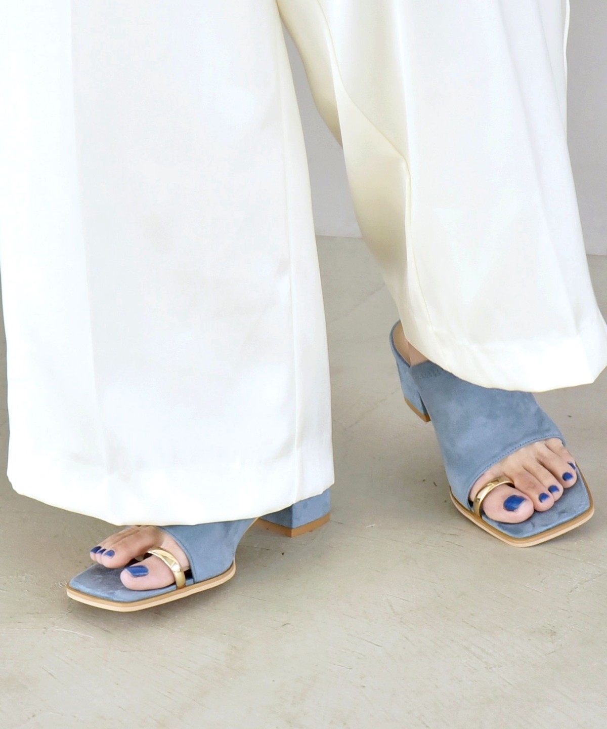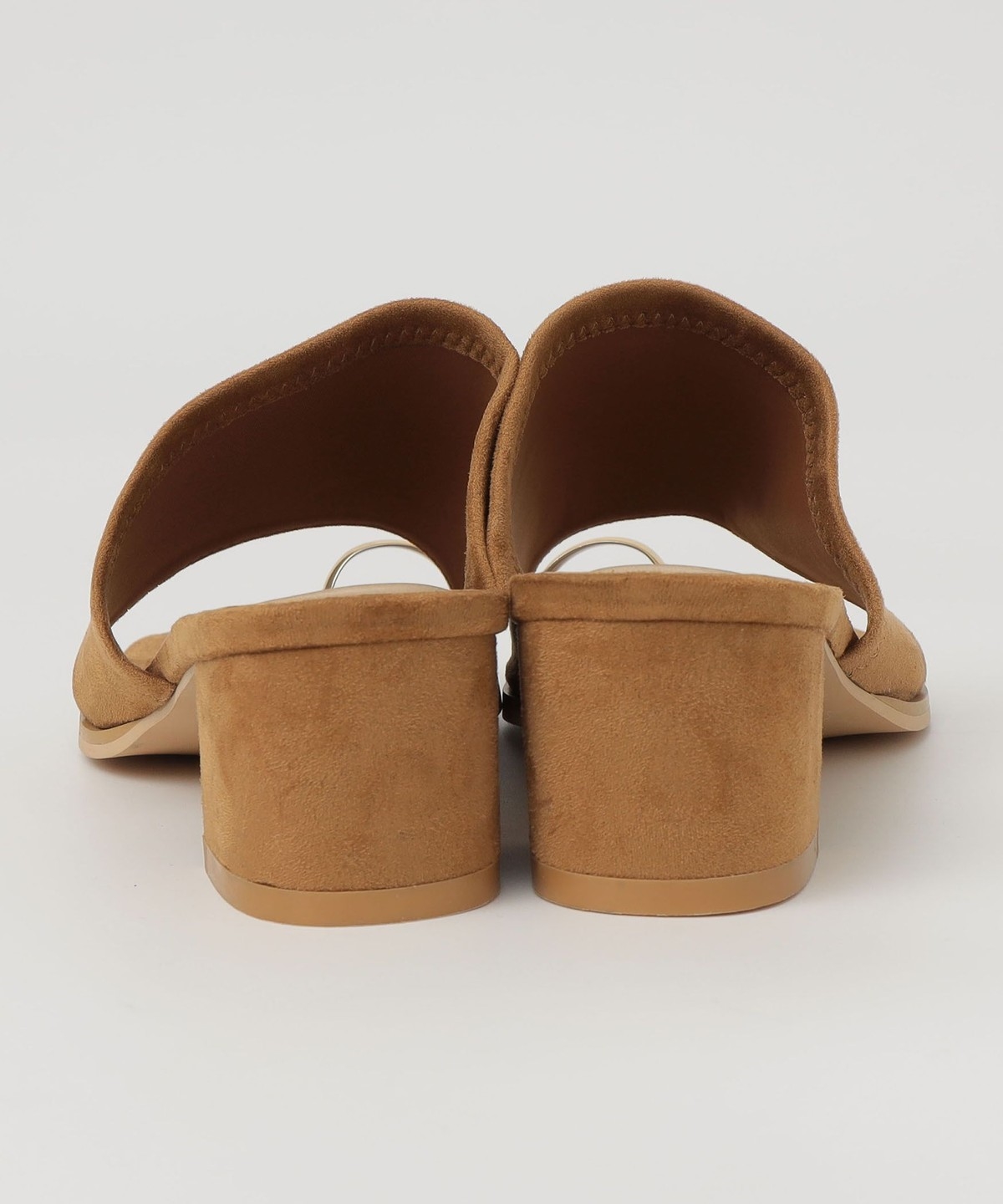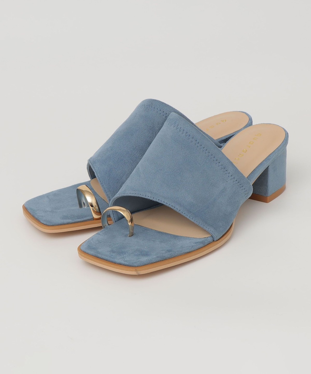 親指部分のゴールドのサムリングデザインが目を惹く、ヒールのスライドサンダル。