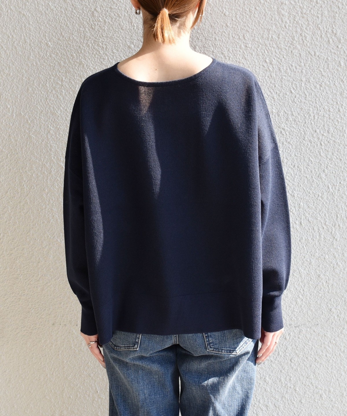 Vネックとクルーネックの前後2wayで着られるシアーニットプルオーバー。