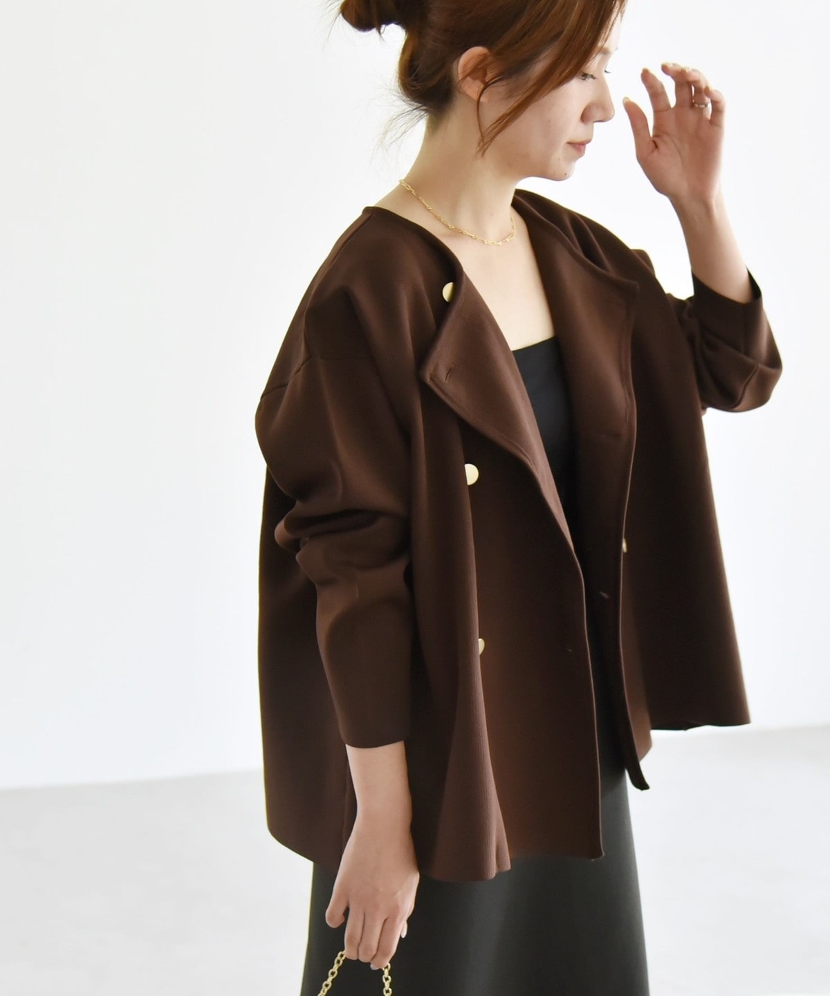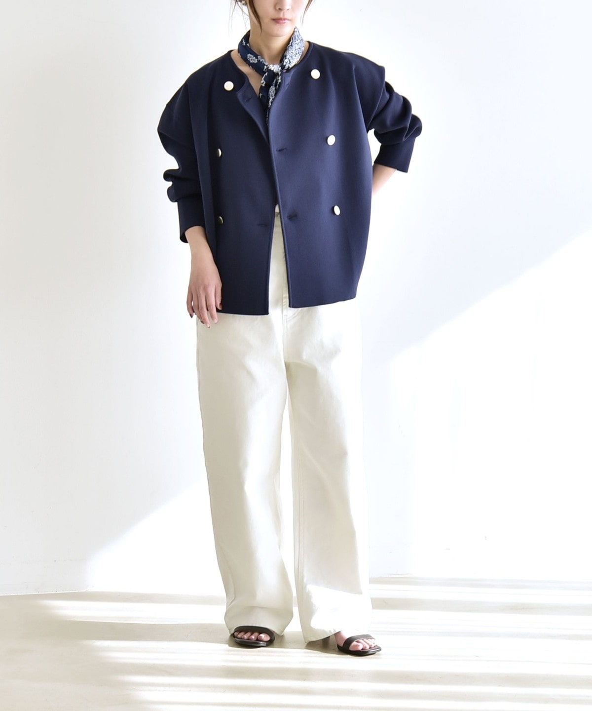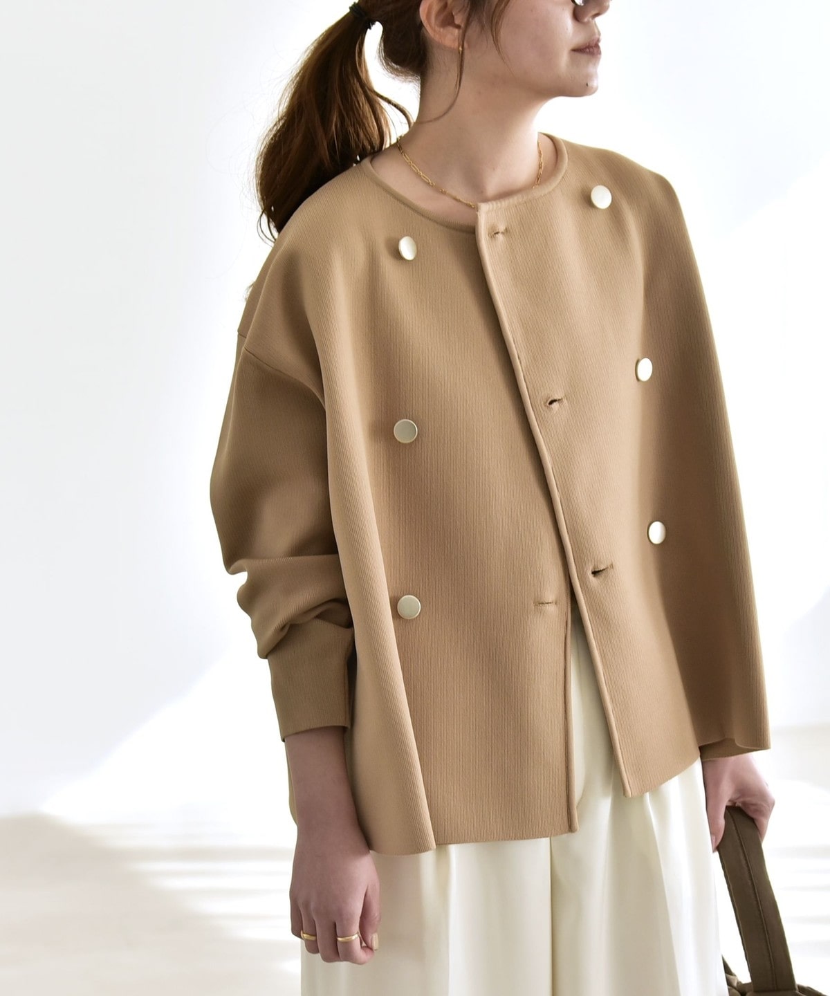 身幅にゆとりのあるノーカラーのダブルジャケット。