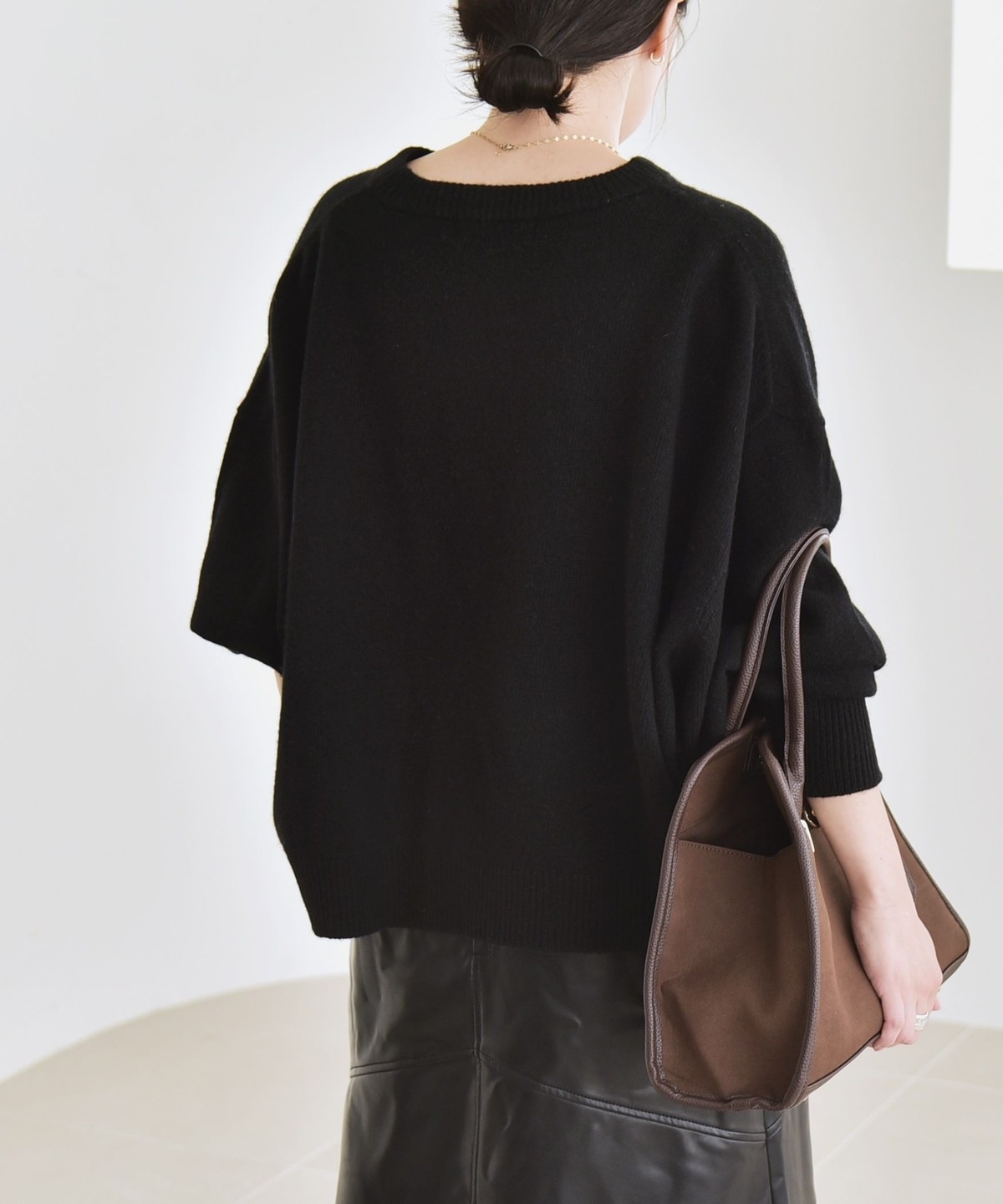 クルーネックでキレイ見えもするので、通勤やオフィスカジュアルにもおすすめの一着。