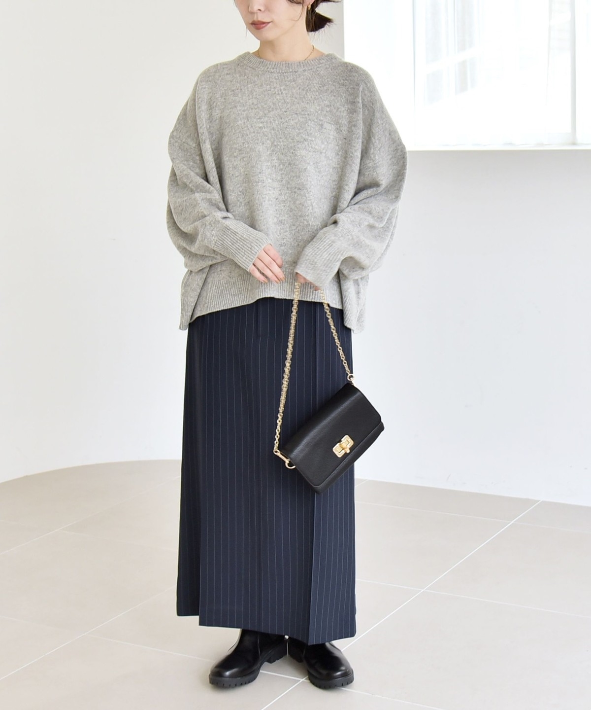 サイズ感:ゆったりとしたサイズ。首元は程よく詰まったデザインでした。腰くらいの着丈でバランス良く着られました。
