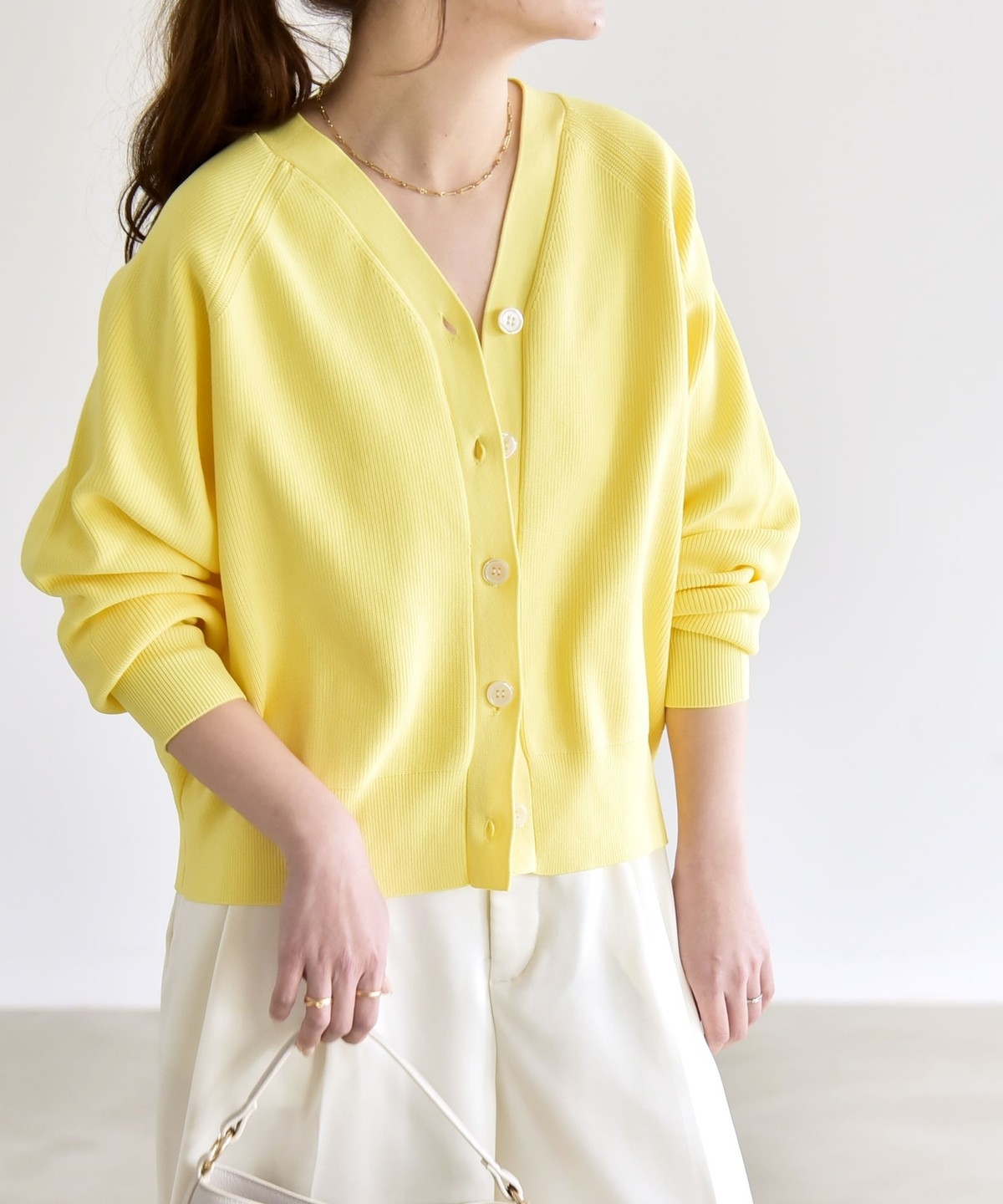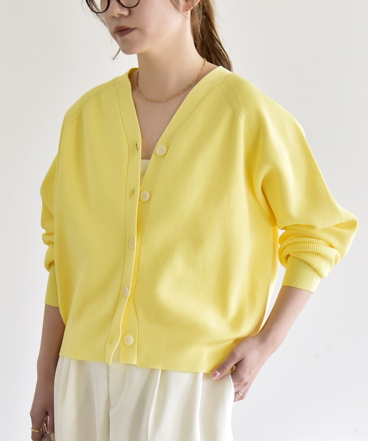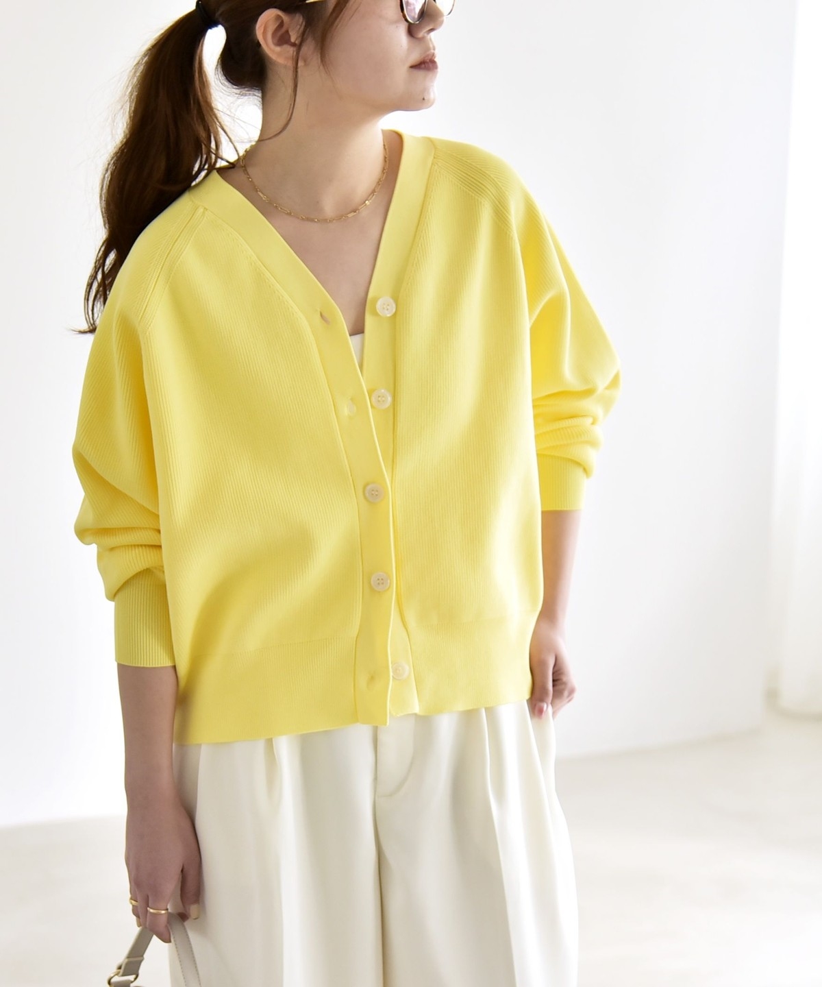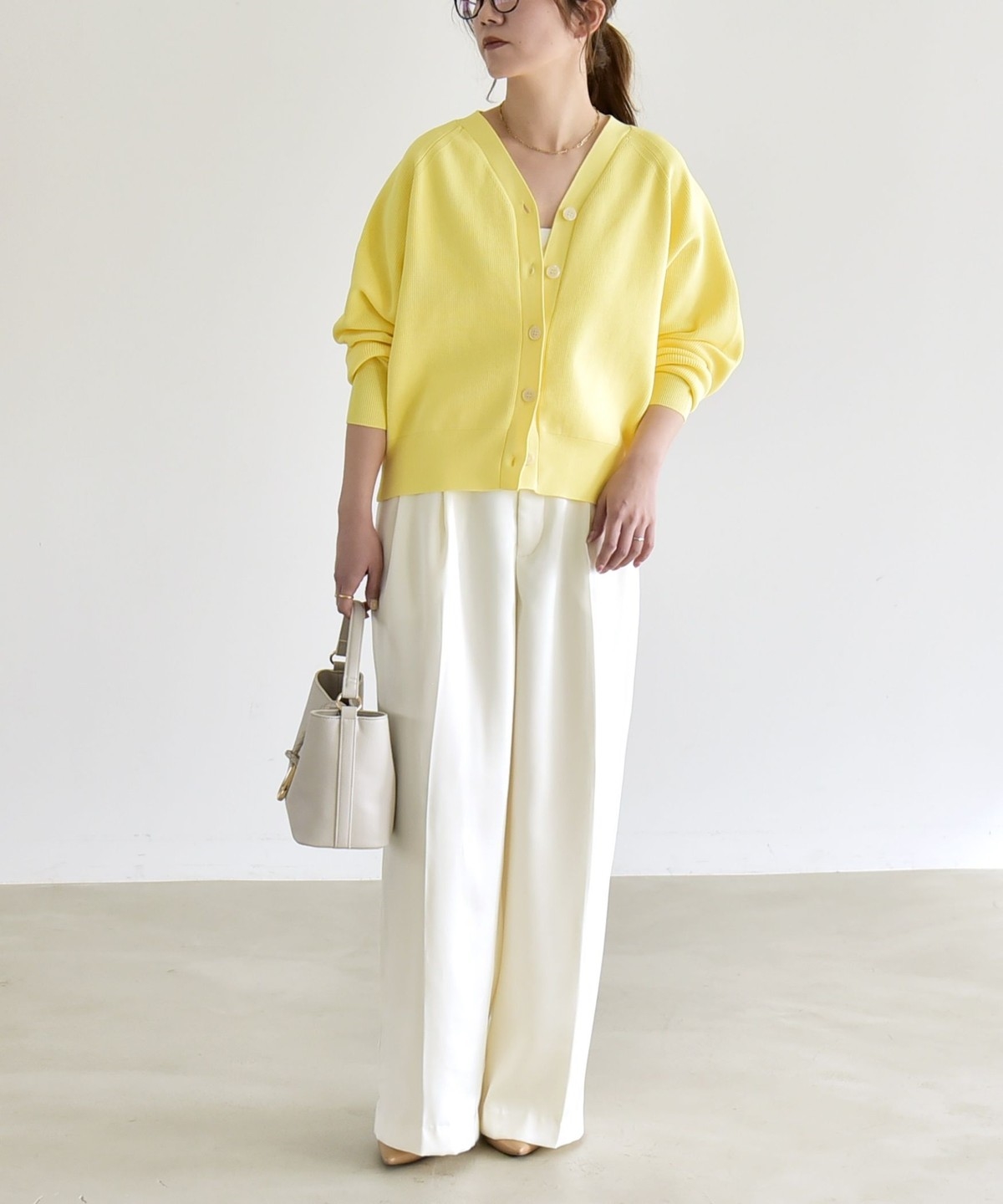 インナーはシンプルはTシャツやタンクトップを合わせ、カーディガンのカラーを引き立てたスタイリングがおすすめ。