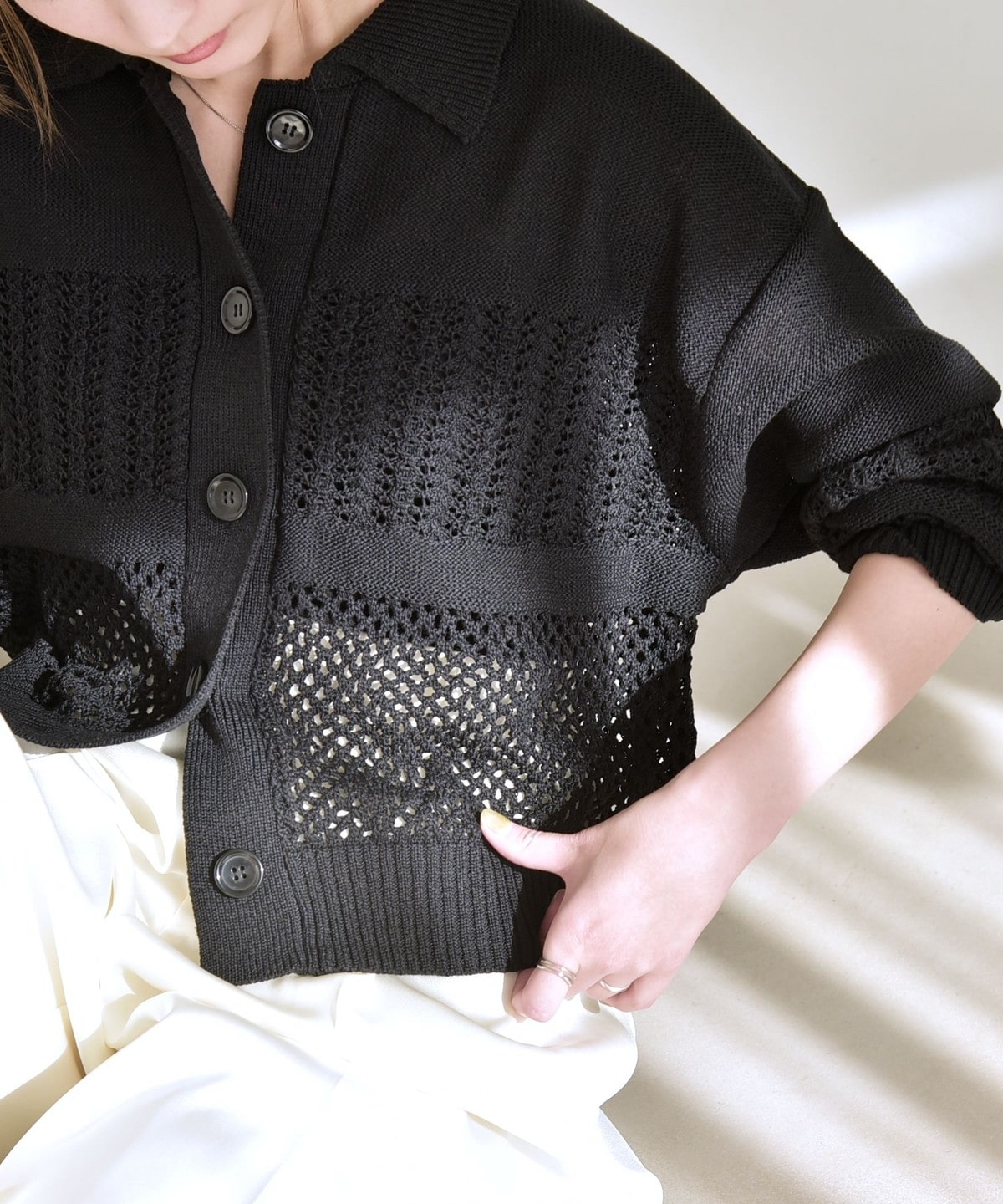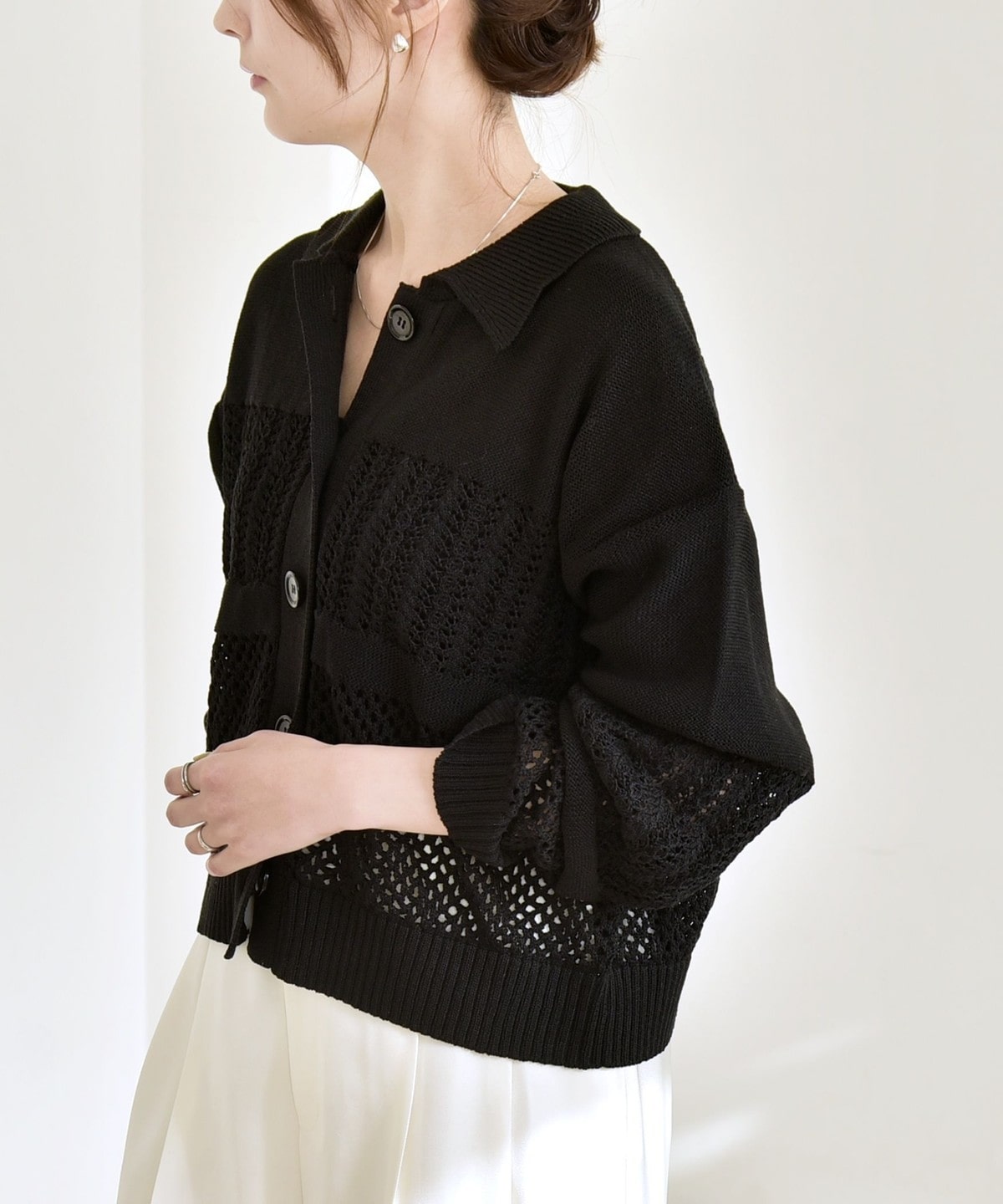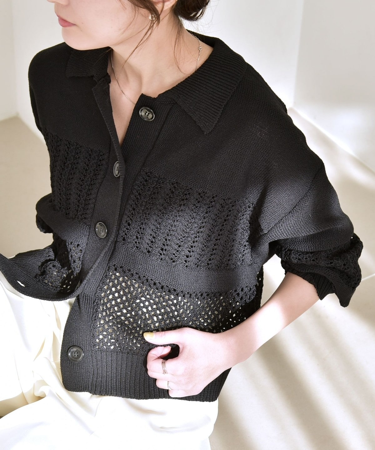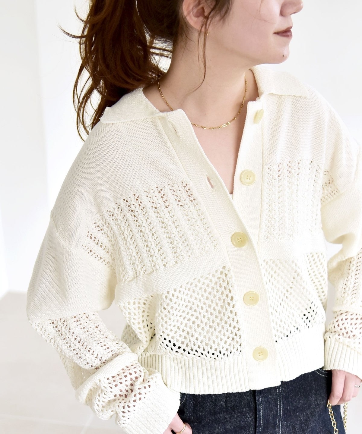 袖と身頃のレース編みとメッシュ編みの切り替えが特徴的なポロニットカーディガン。
