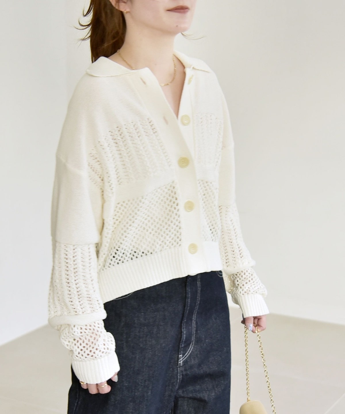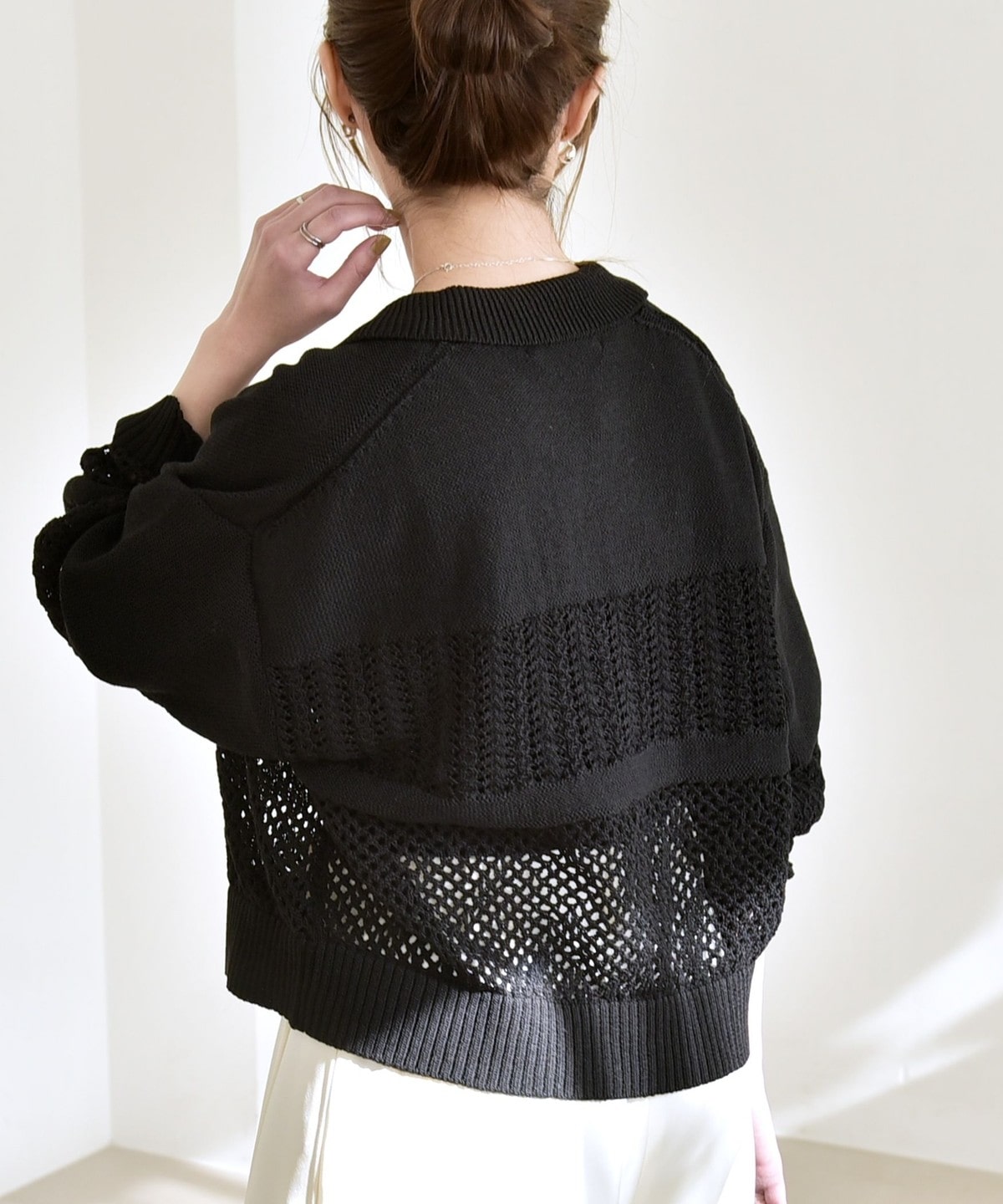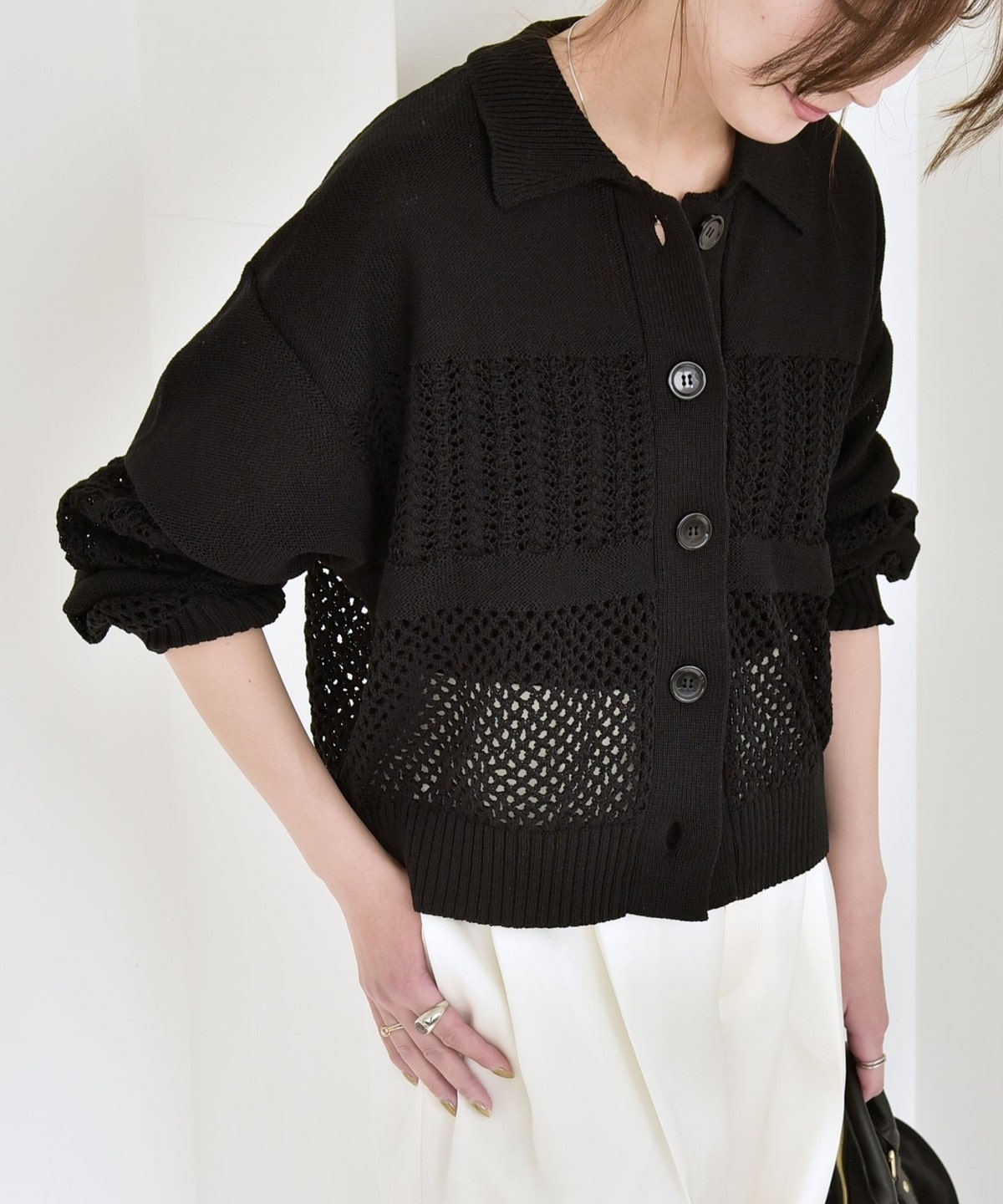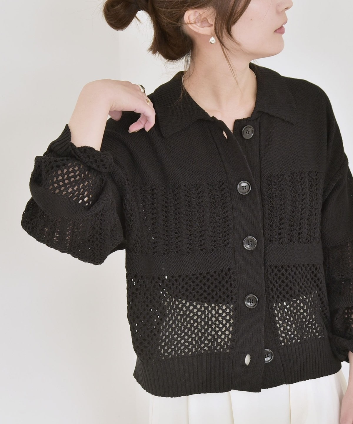 袖と身頃のレース編みとメッシュ編みの切り替えが特徴的なポロニットカーディガン。