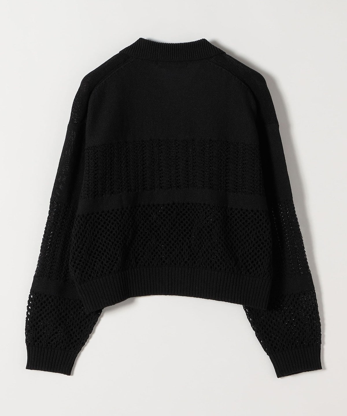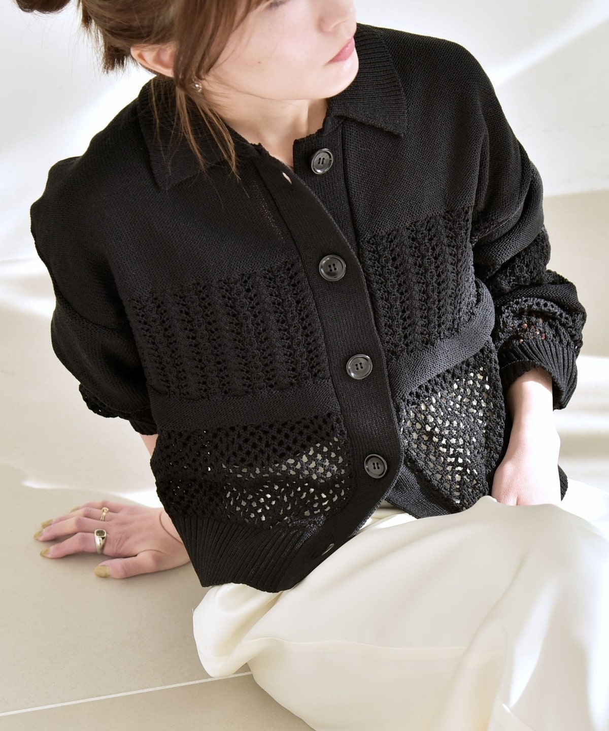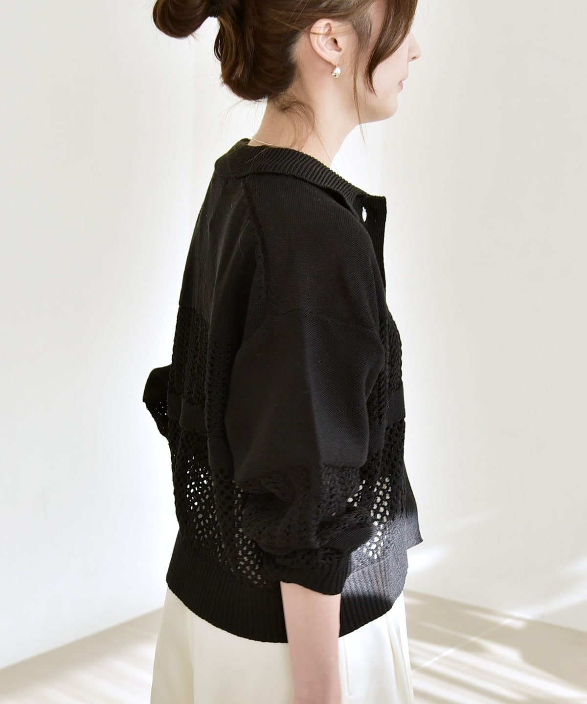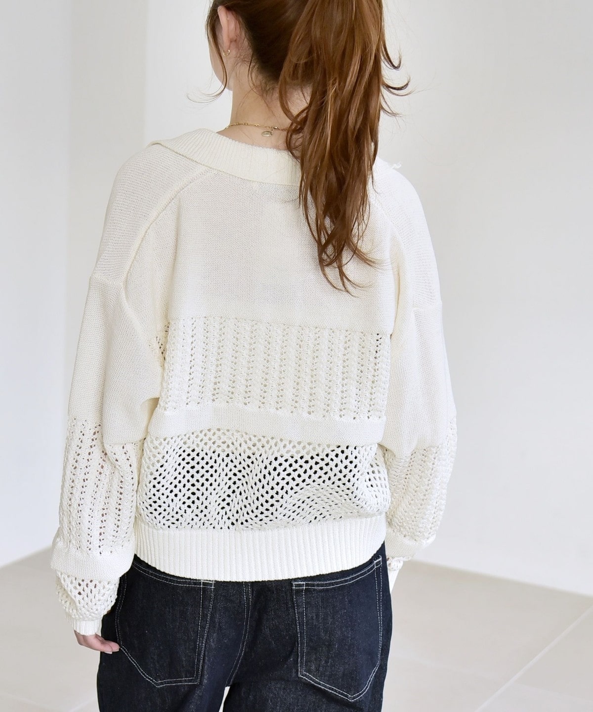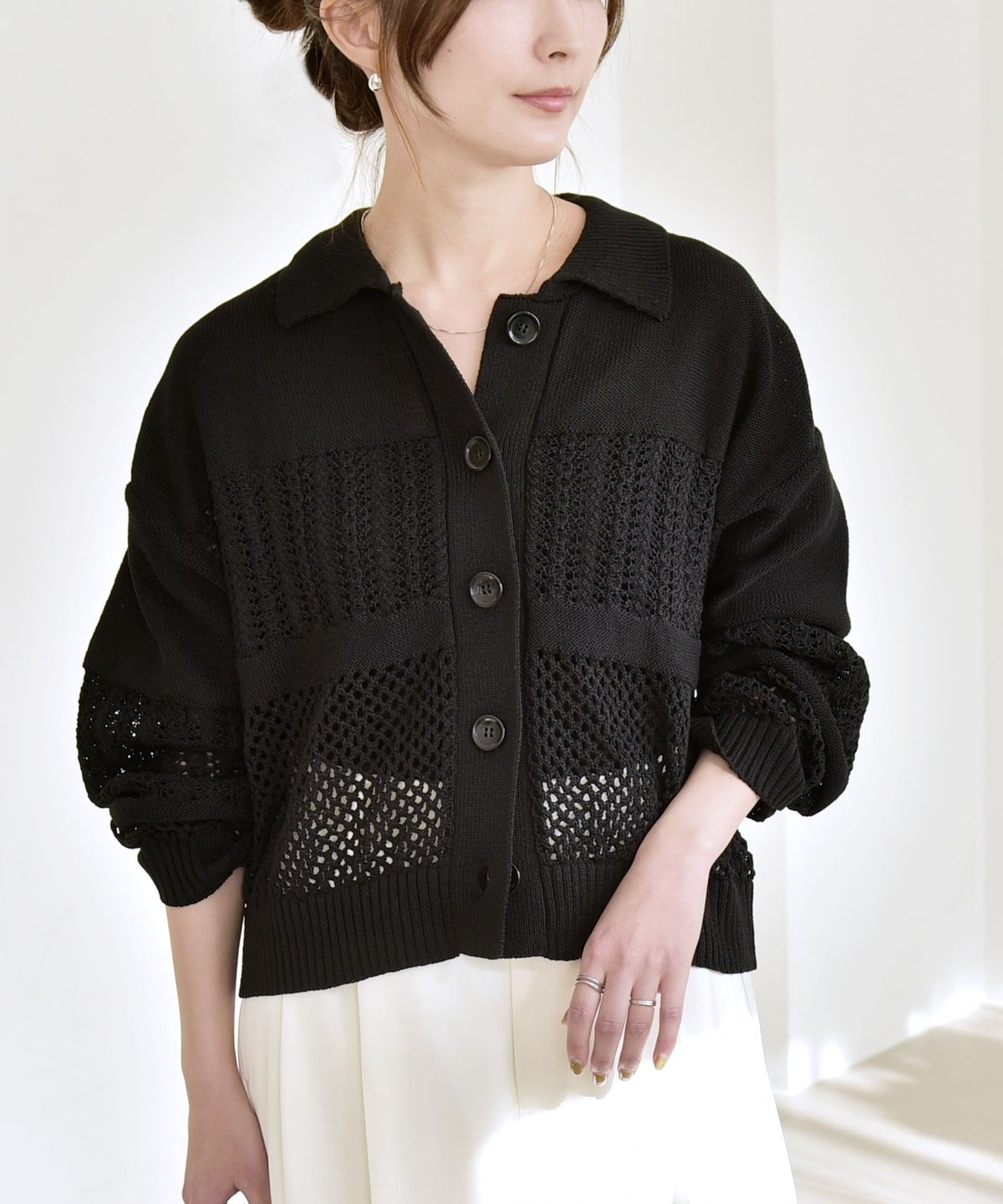 袖と身頃のレース編みとメッシュ編みの切り替えが特徴的なポロニットカーディガン。