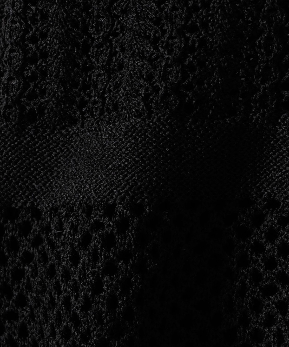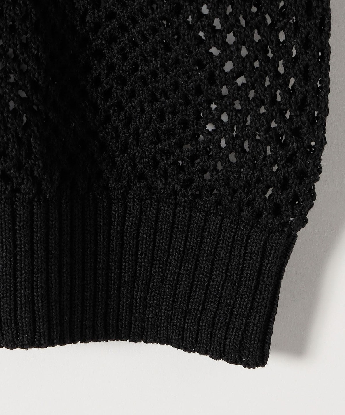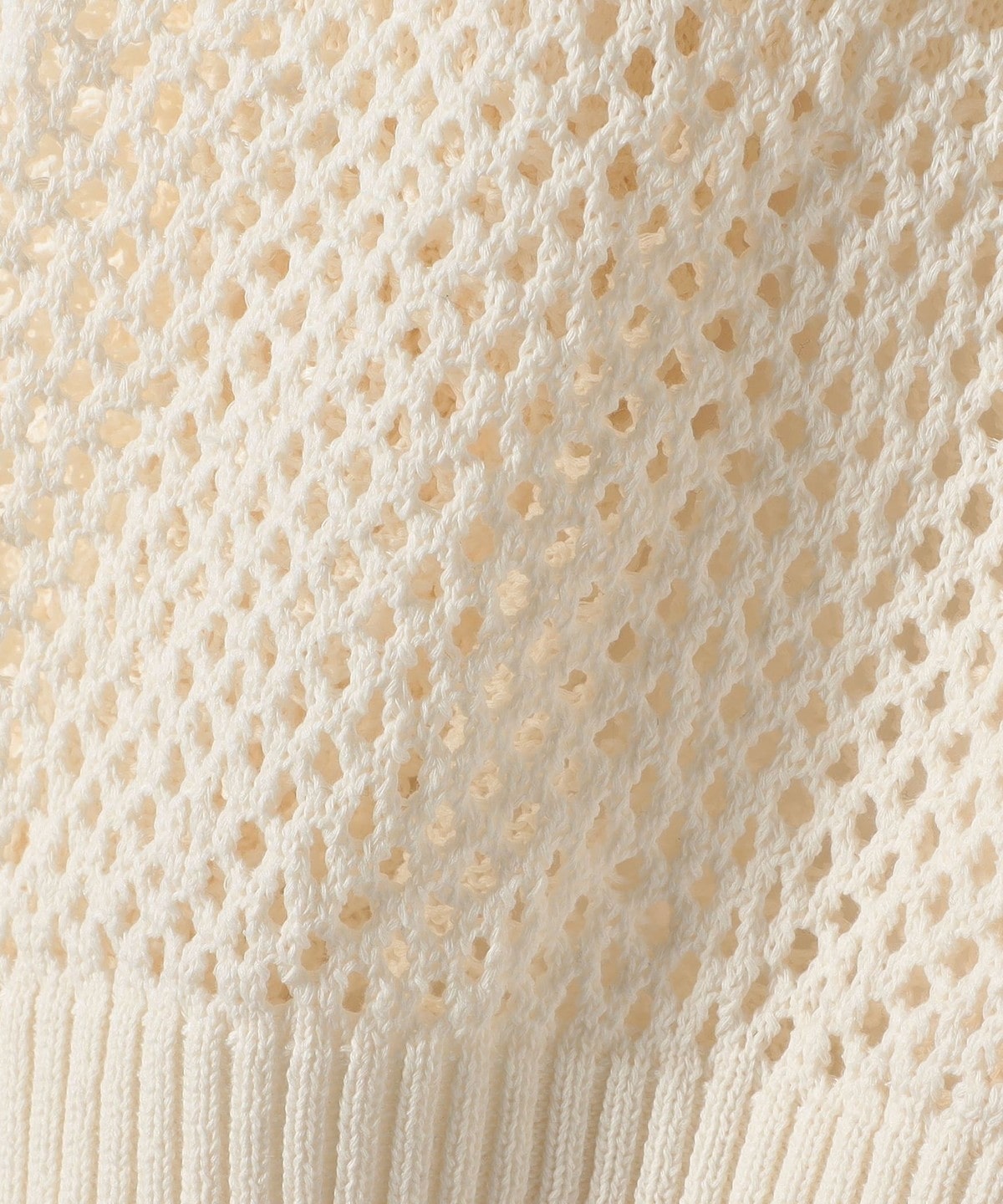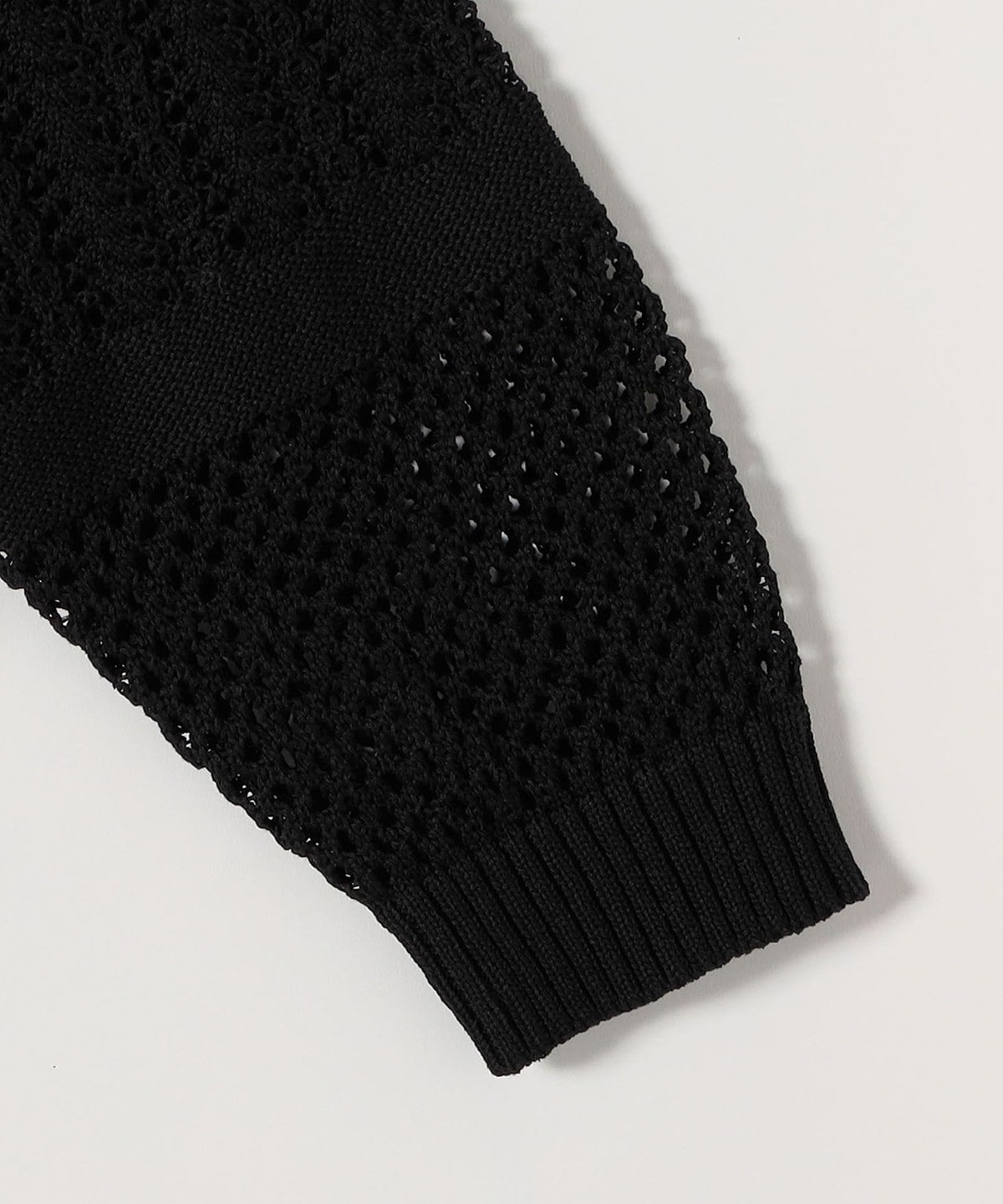 袖と身頃のレース編みとメッシュ編みの切り替えが特徴的なポロニットカーディガン。