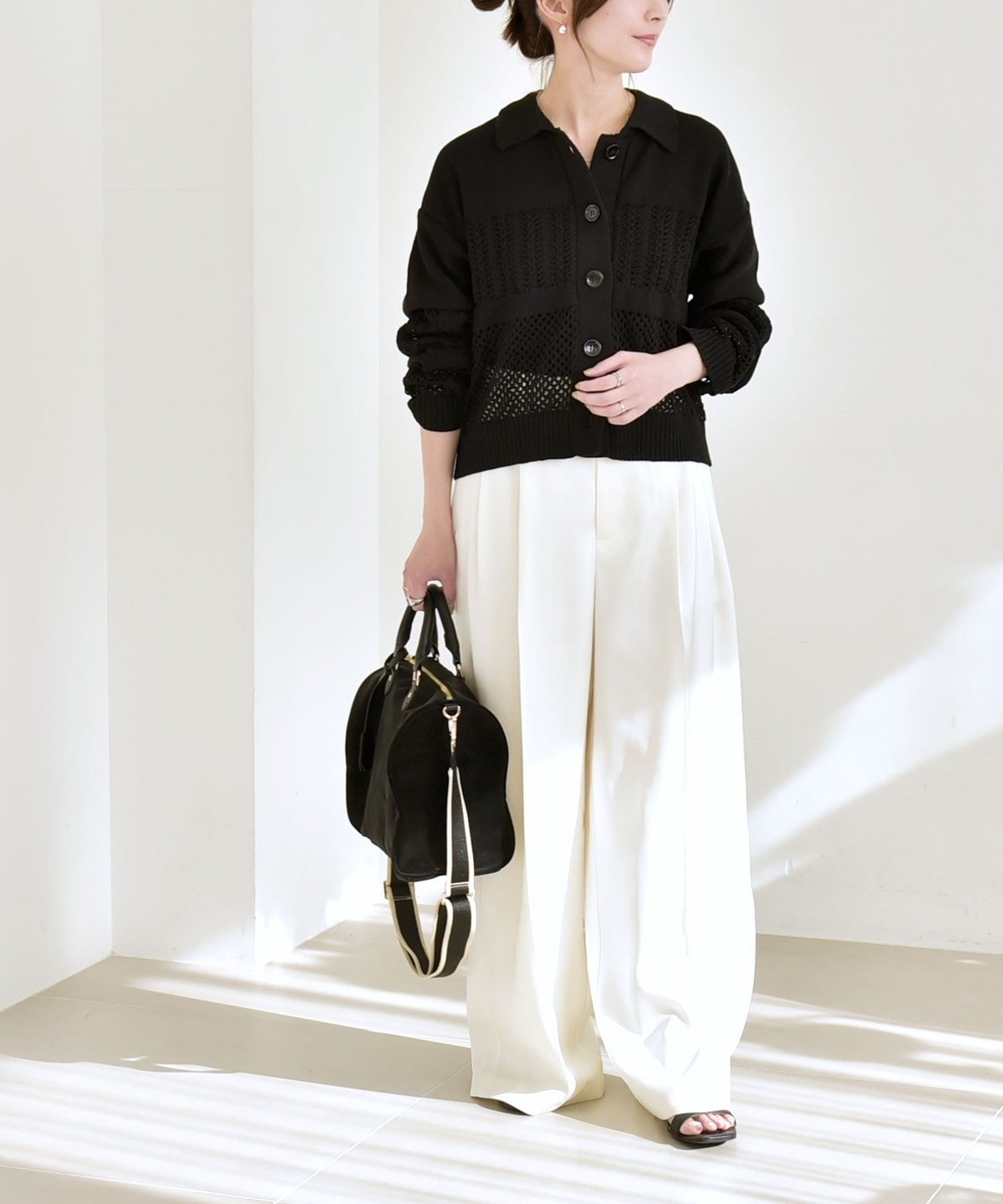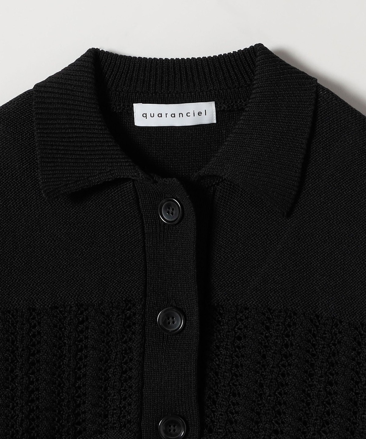 1. 《予約》quaranciel:〈手洗い可能〉透かし編み 襟付き ニット カーディガン ブラック