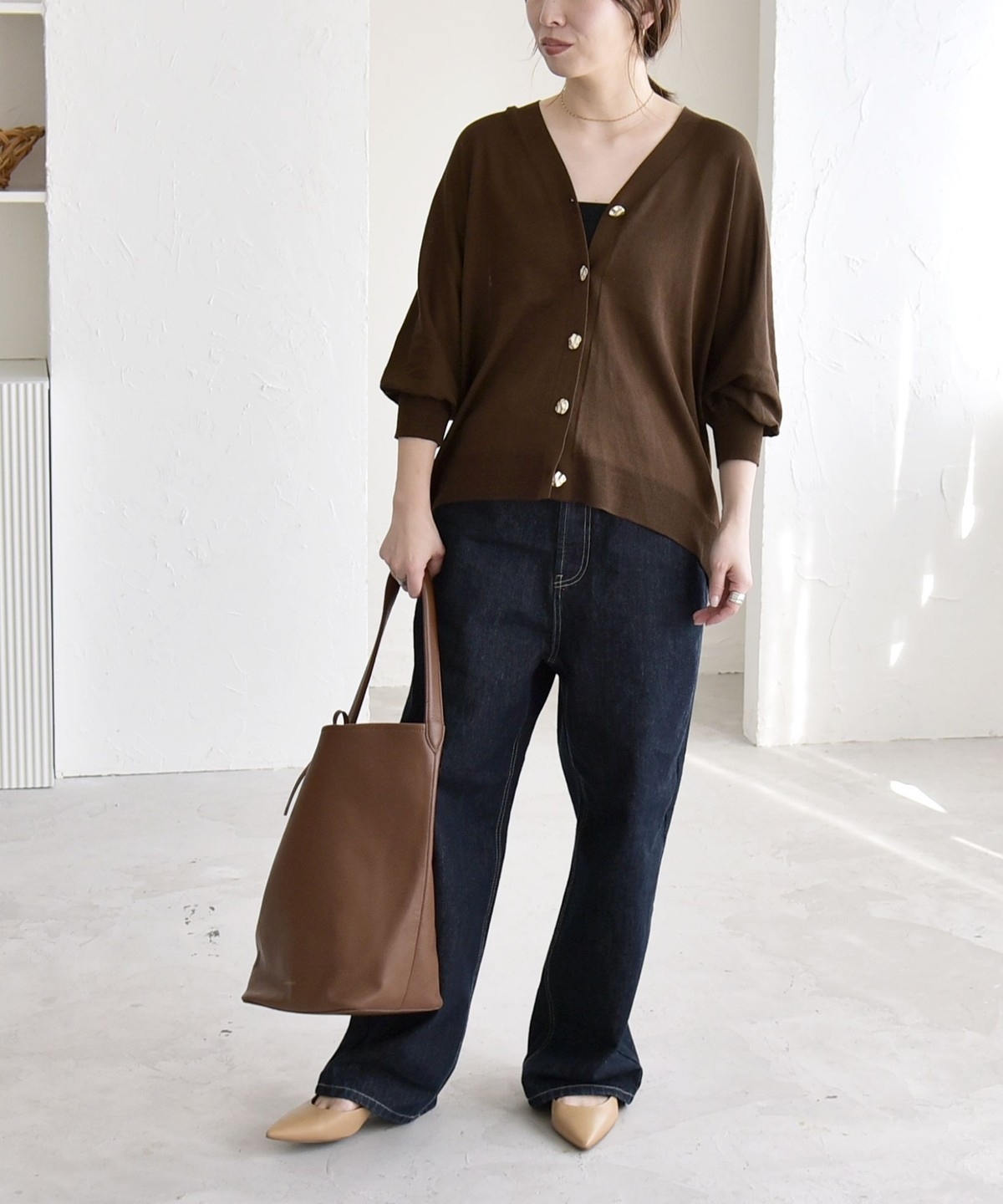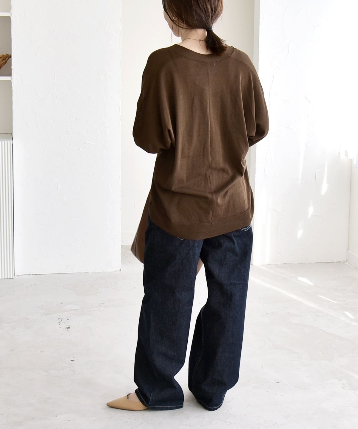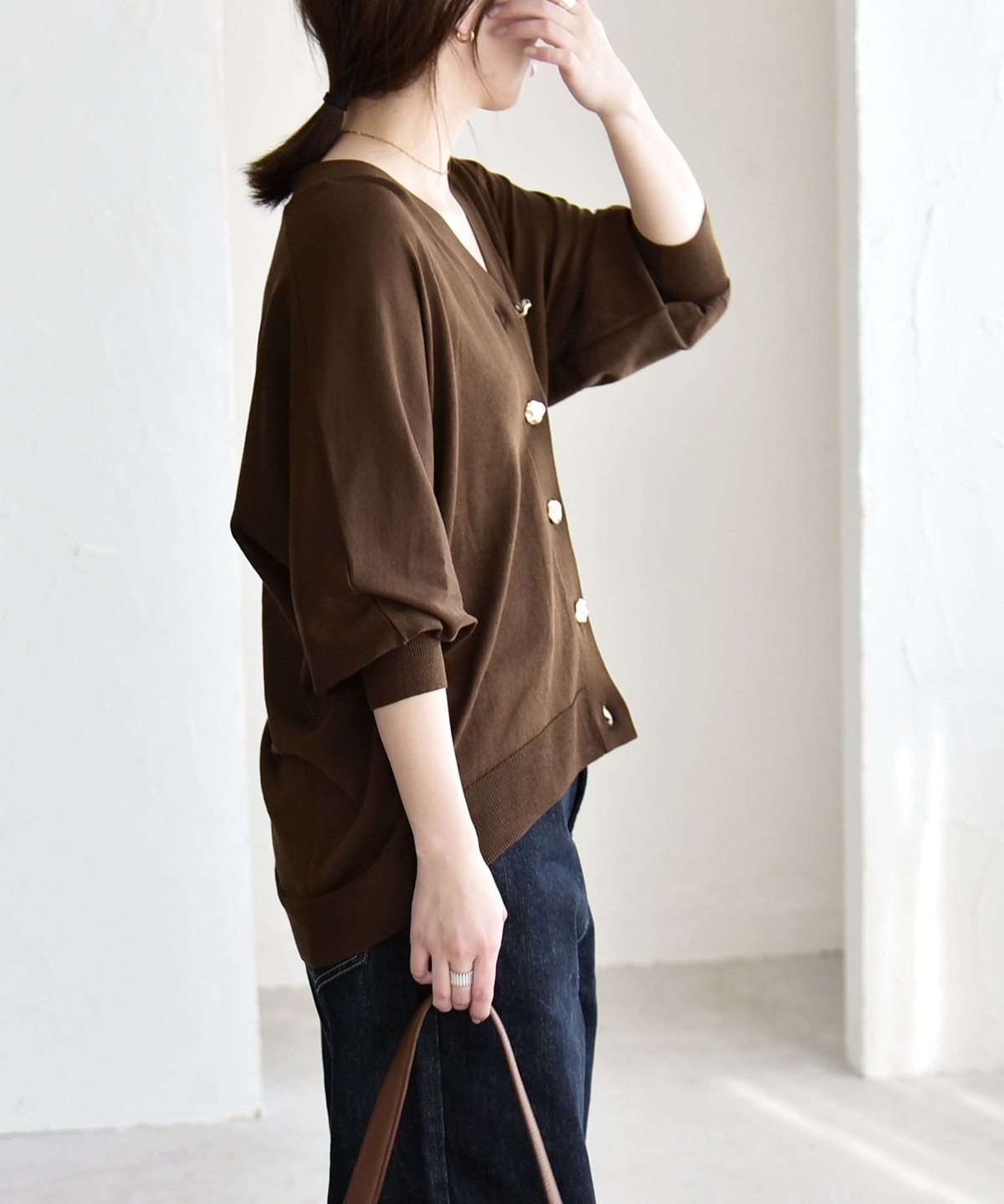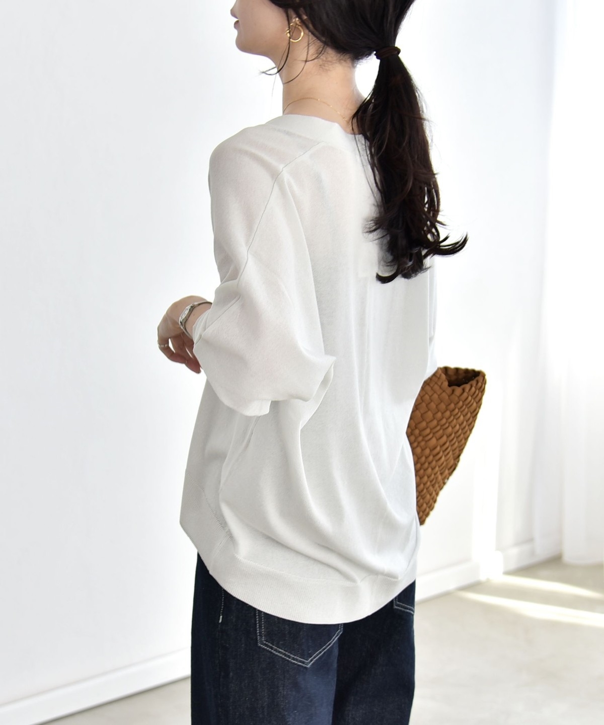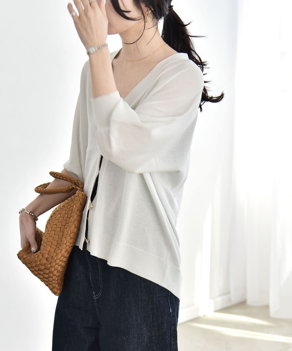 首やデコルテ周りを華奢に見せてくれるV開きで、さっと羽織るだけででラフな抜け感を演出してくれます。