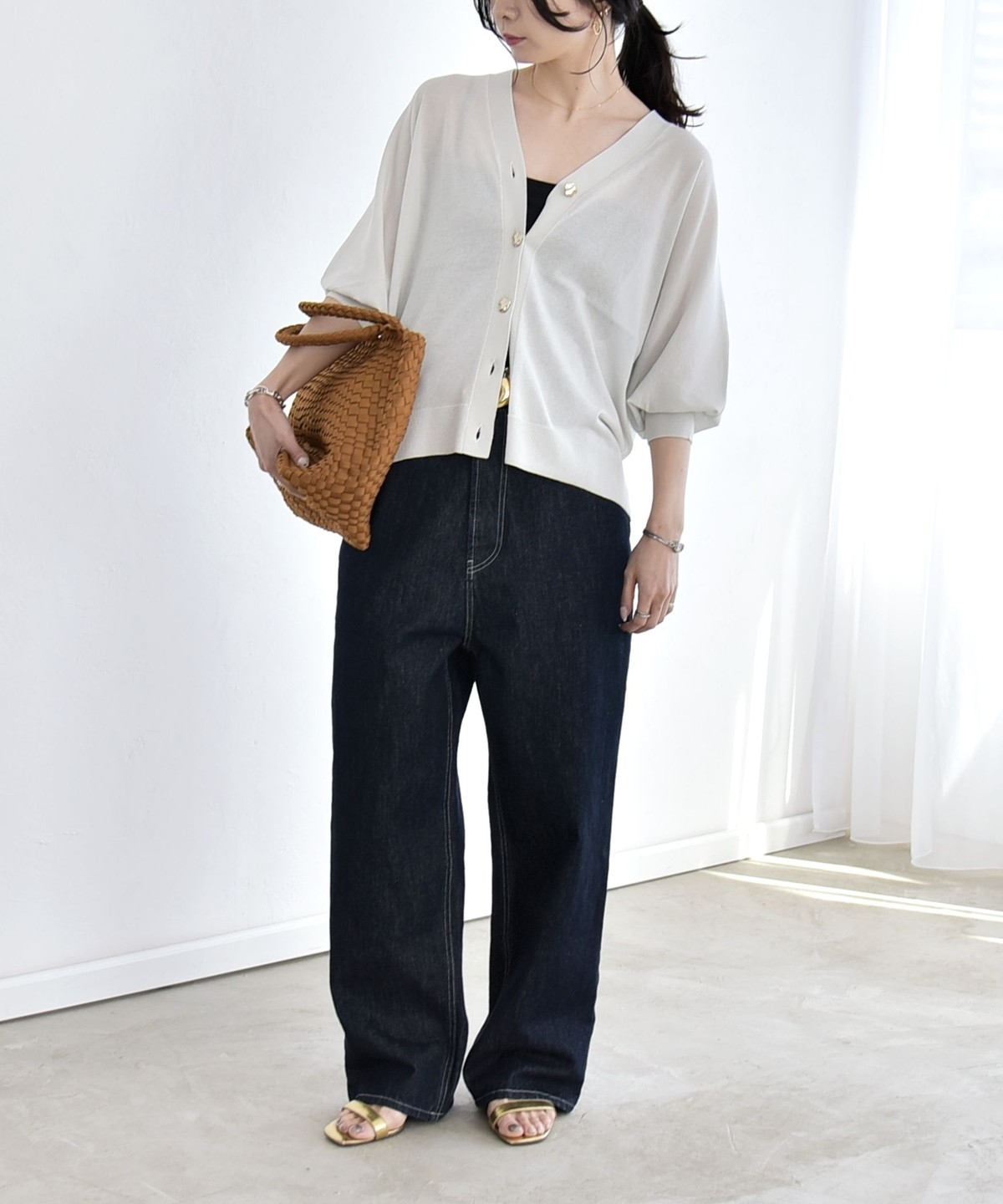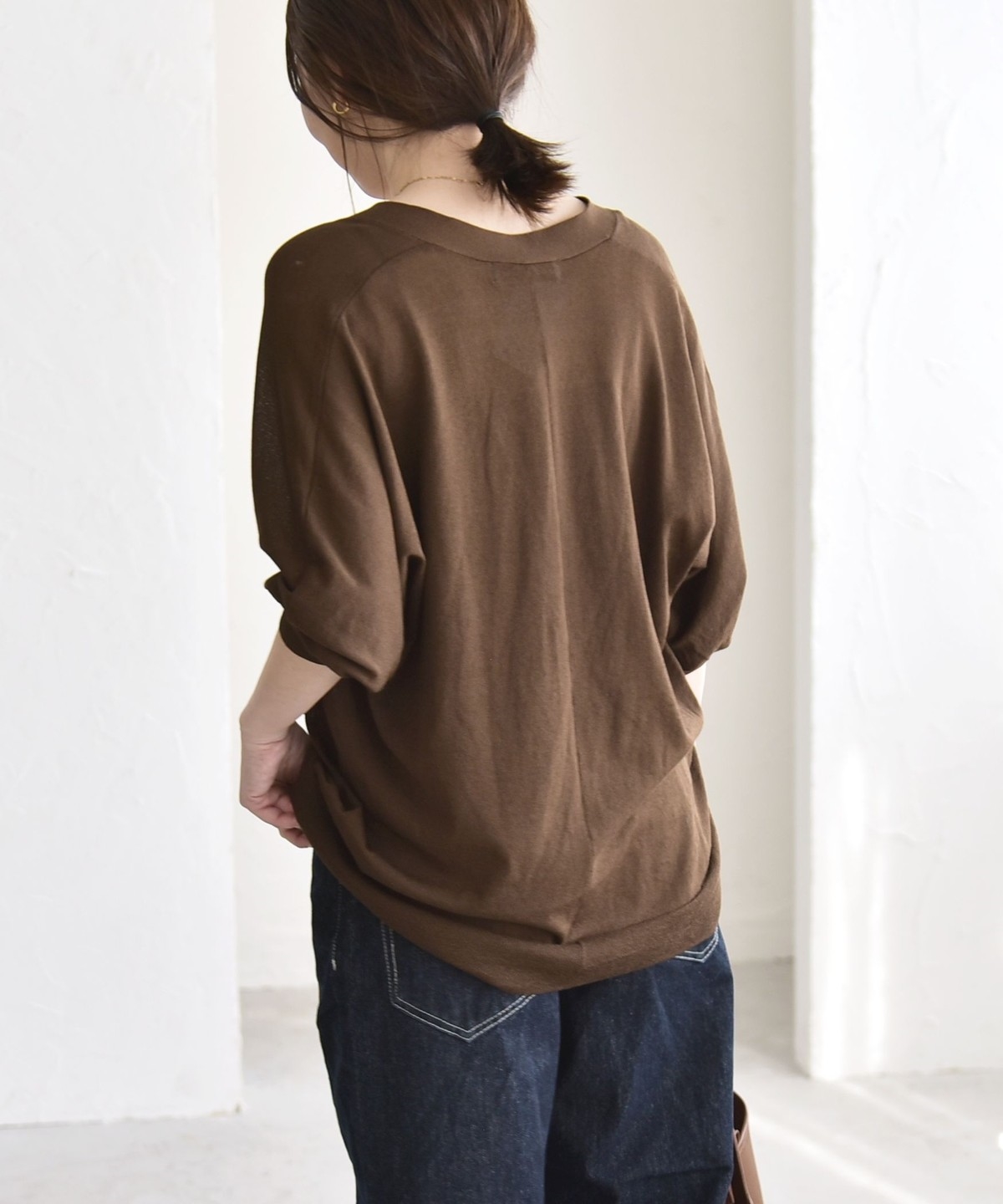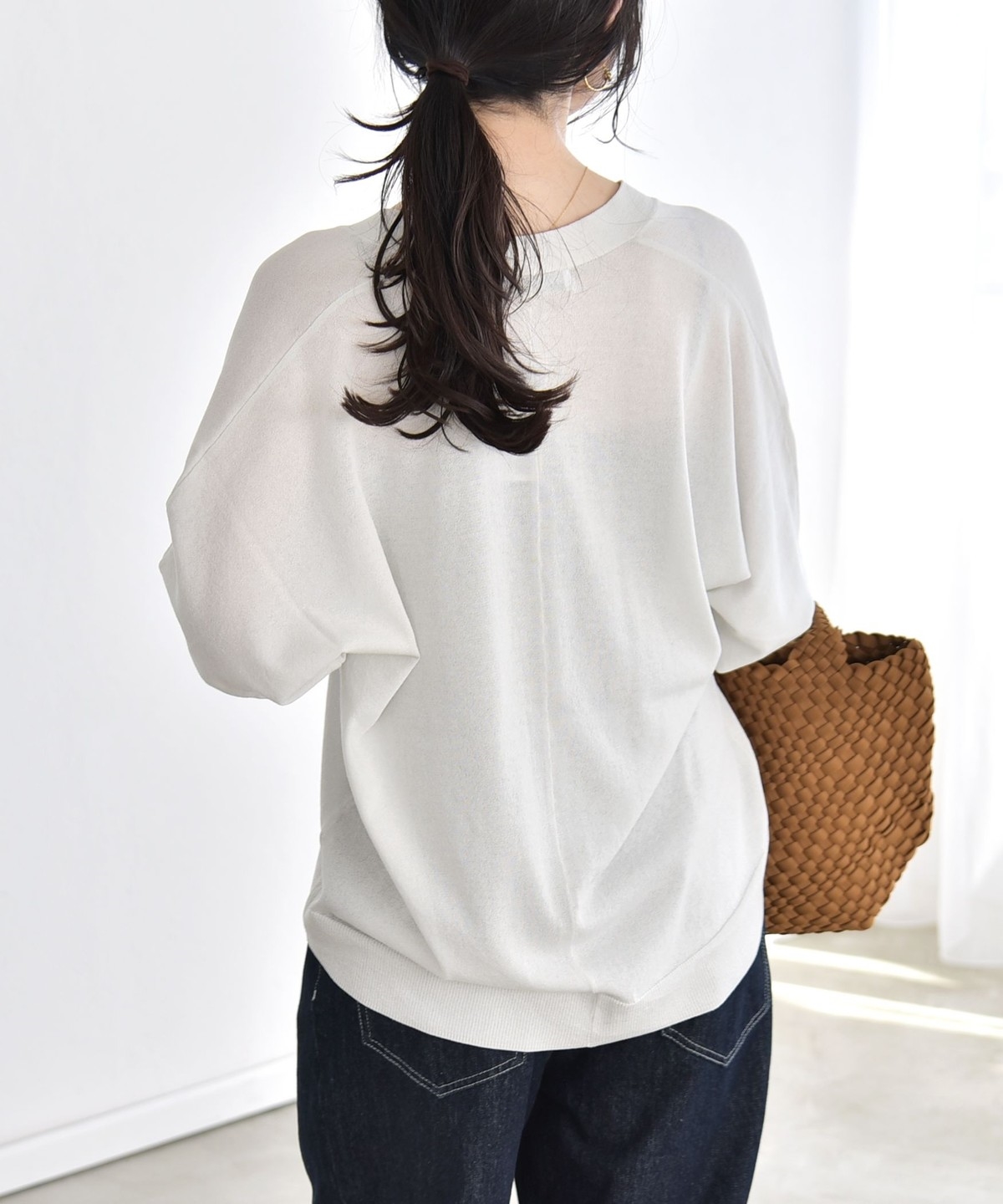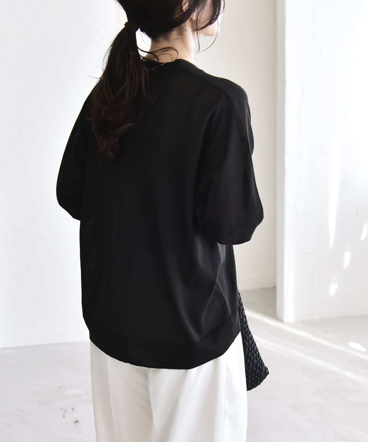 首やデコルテ周りを華奢に見せてくれるV開きで、さっと羽織るだけででラフな抜け感を演出してくれます。