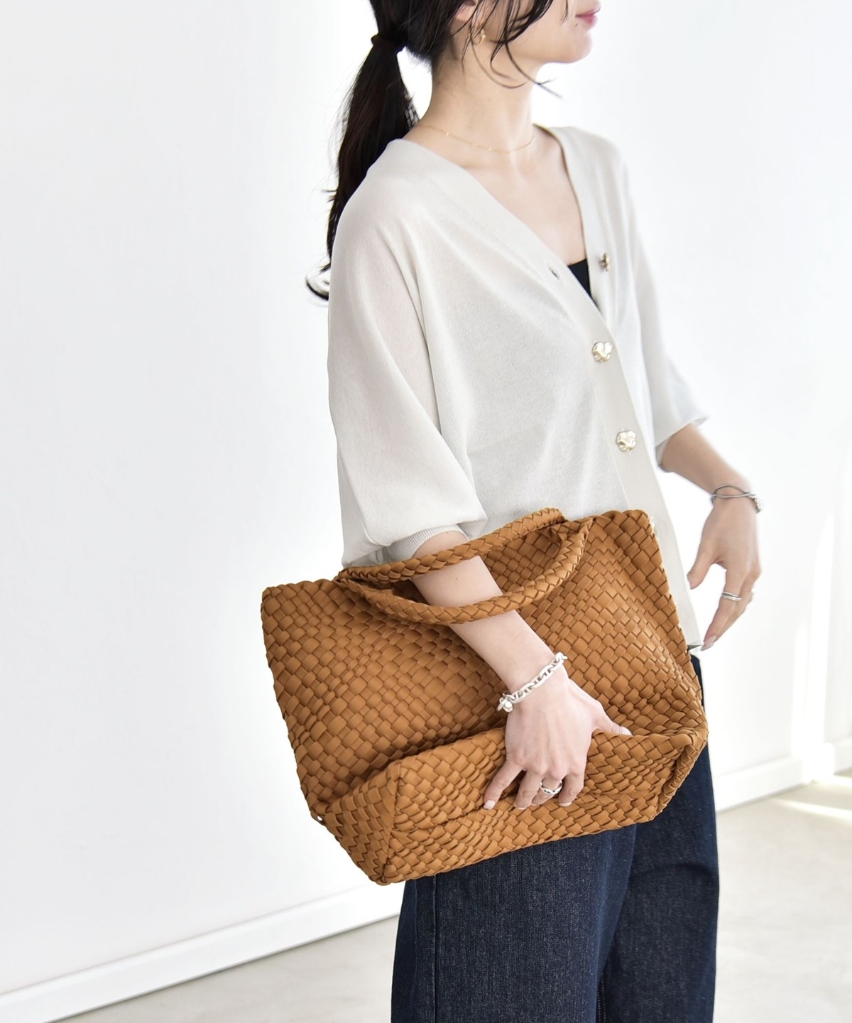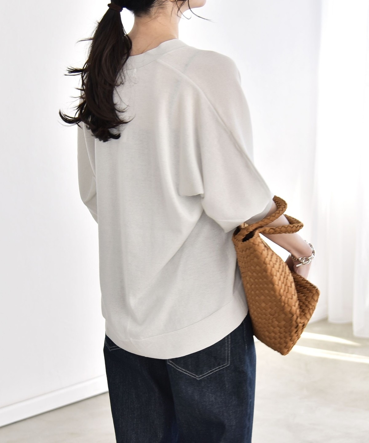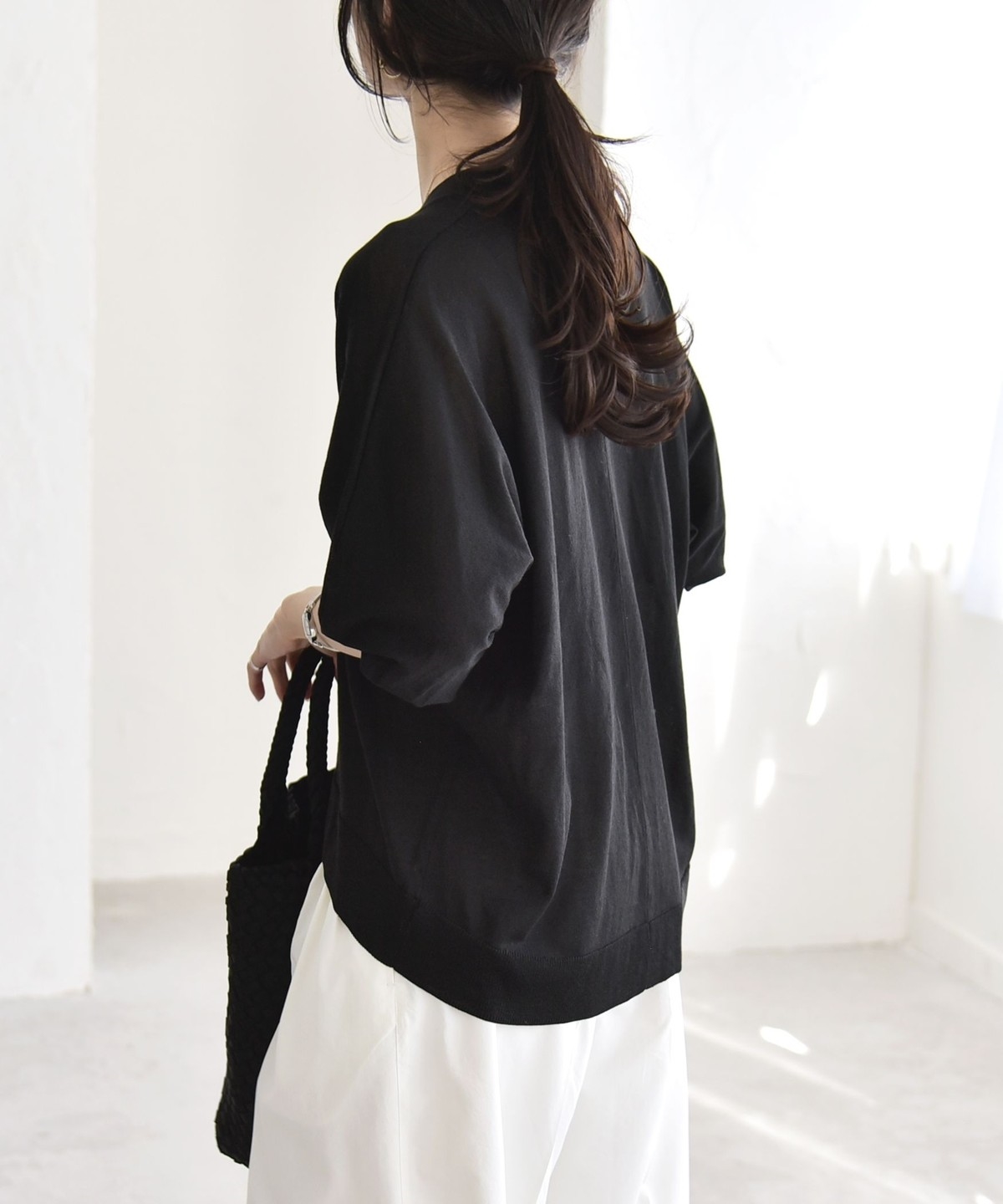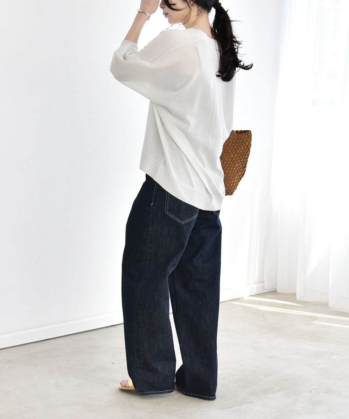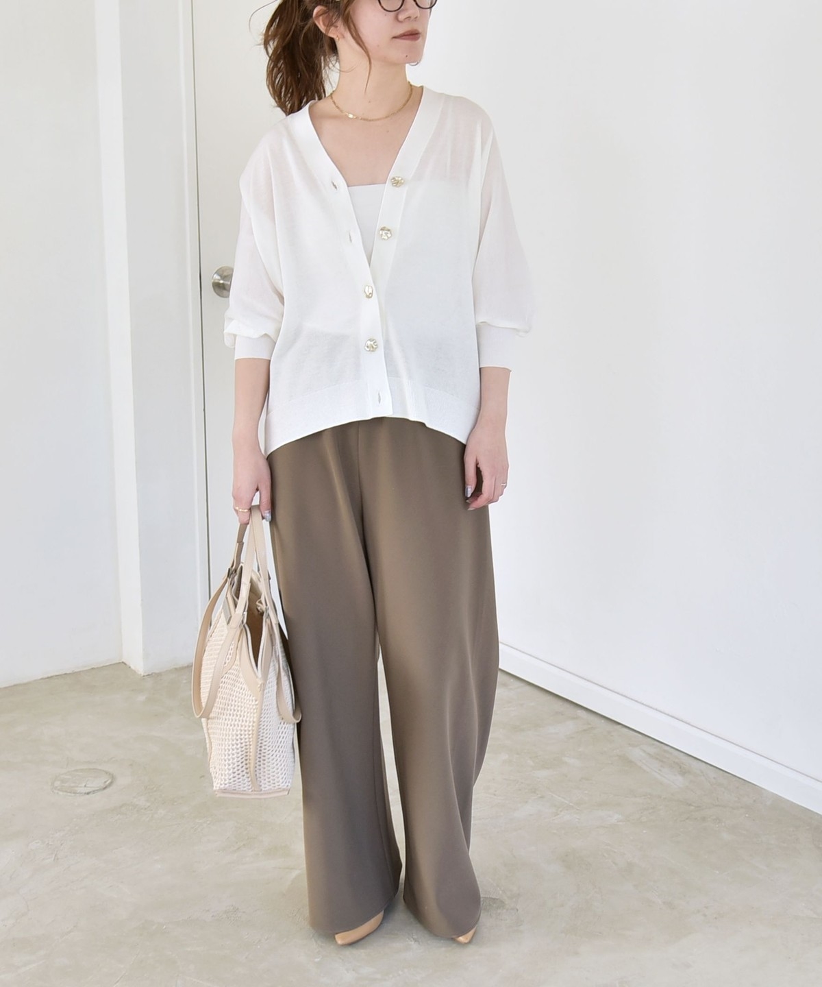 首やデコルテ周りを華奢に見せてくれるV開きで、さっと羽織るだけででラフな抜け感を演出してくれます。