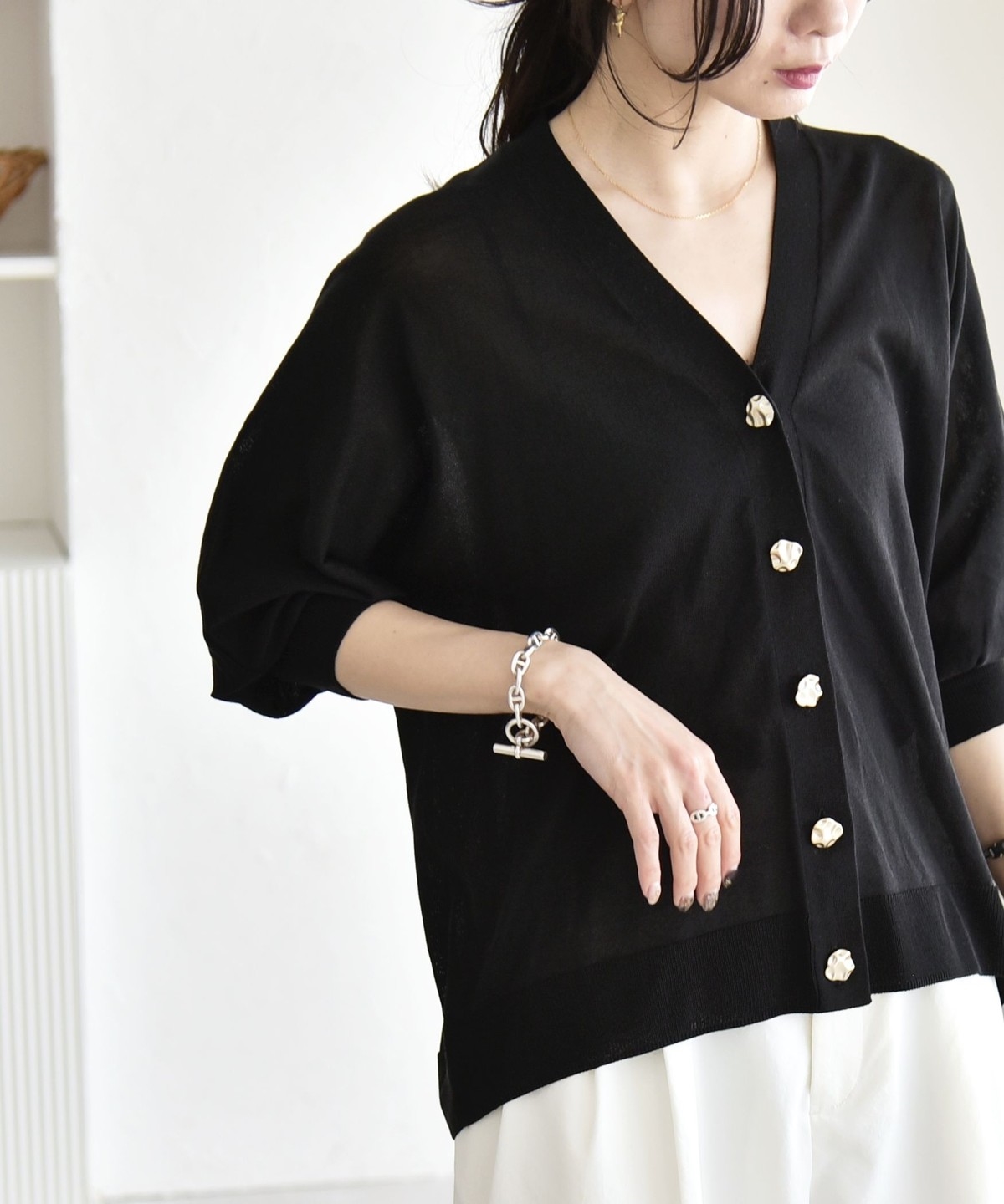 5. 《予約》quaranciel:〈接触冷感/手洗い可能〉メタルボタン Vネック シアー ニット カーディガン