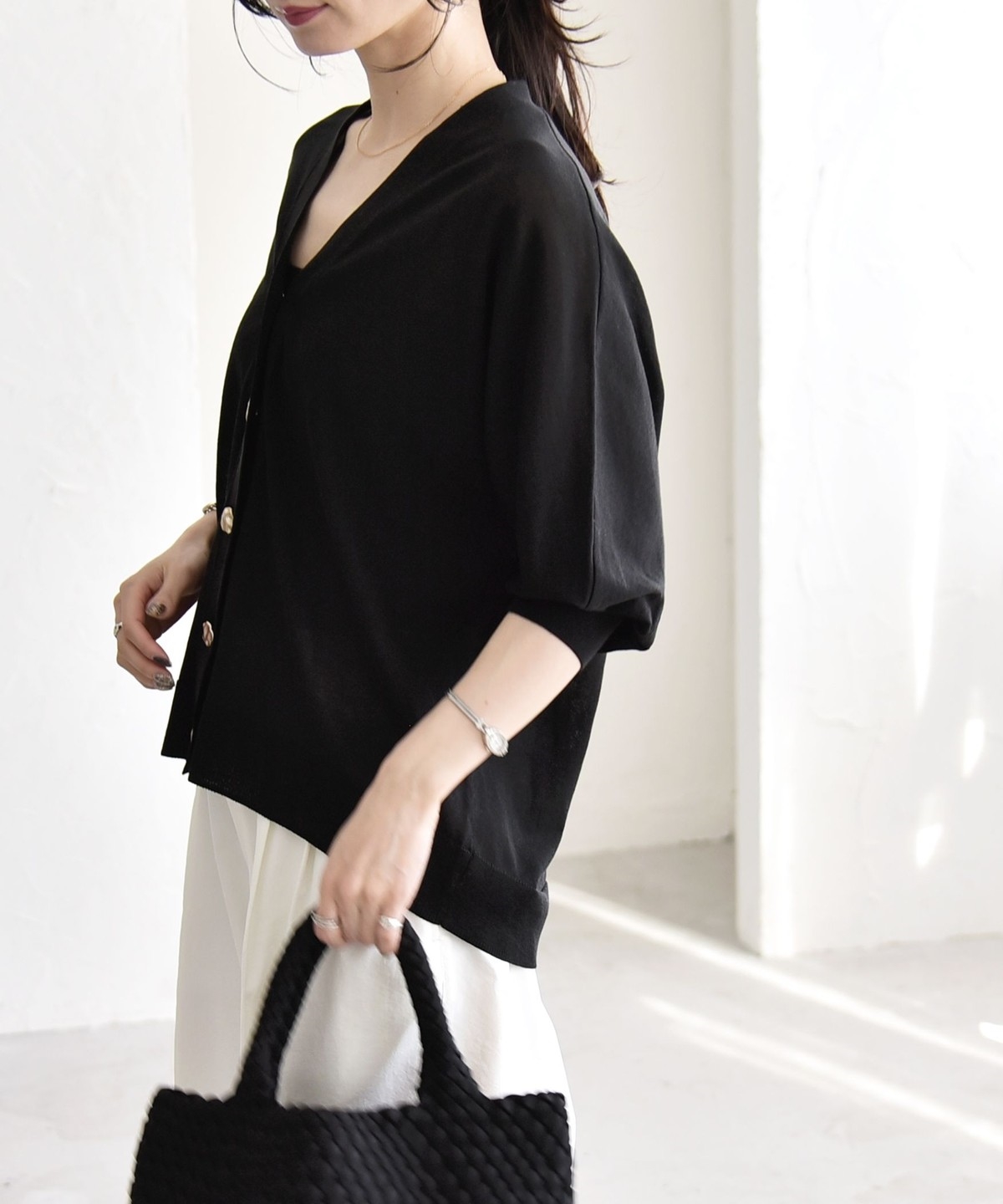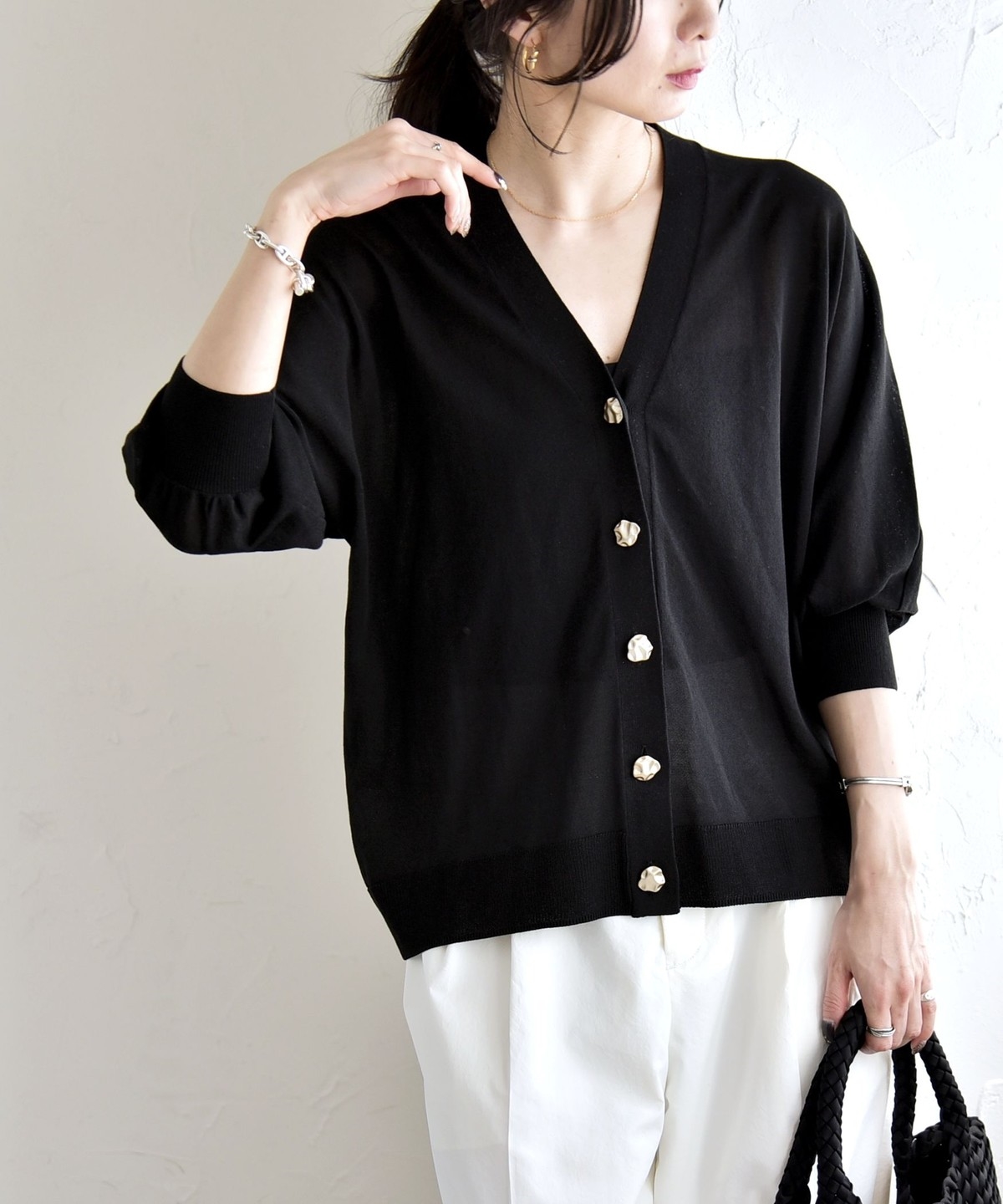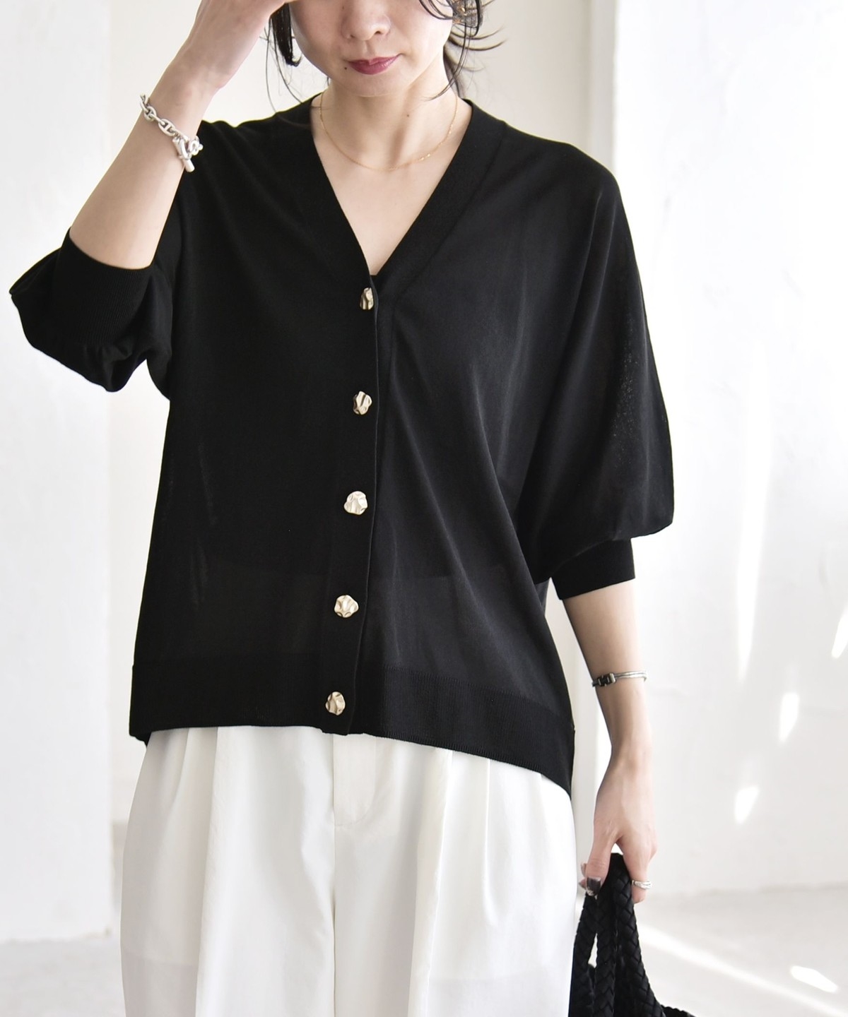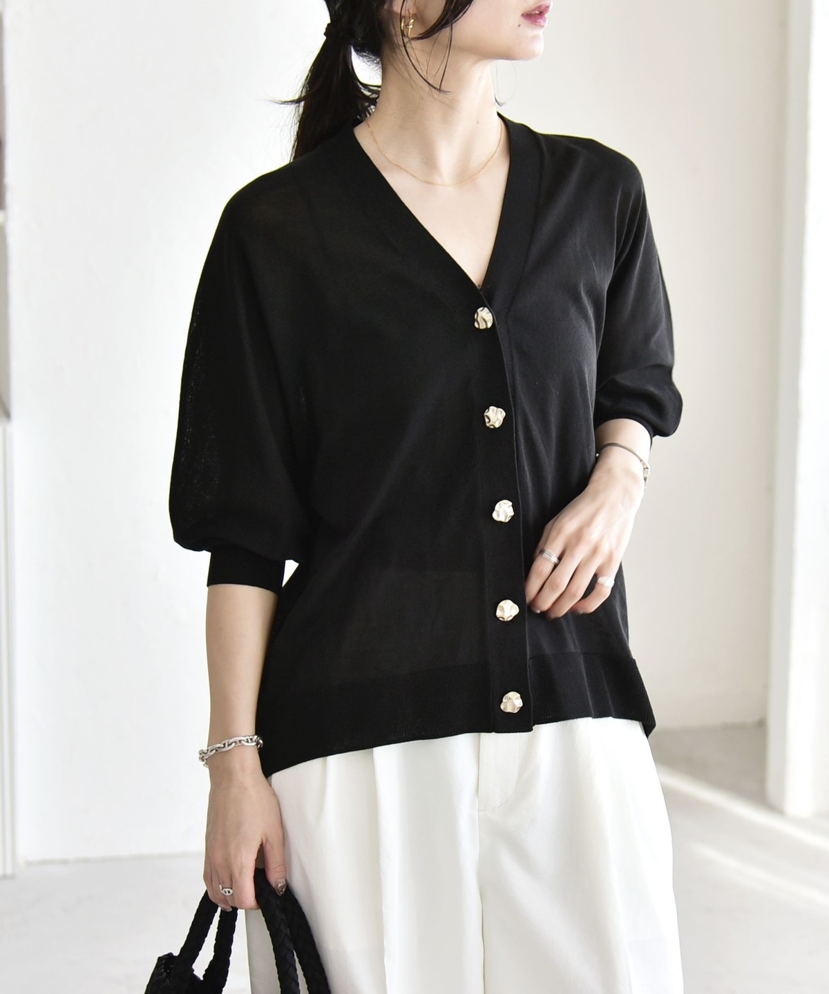 4. 《予約》quaranciel:〈接触冷感/手洗い可能〉メタルボタン Vネック シアー ニット カーディガン ブラック