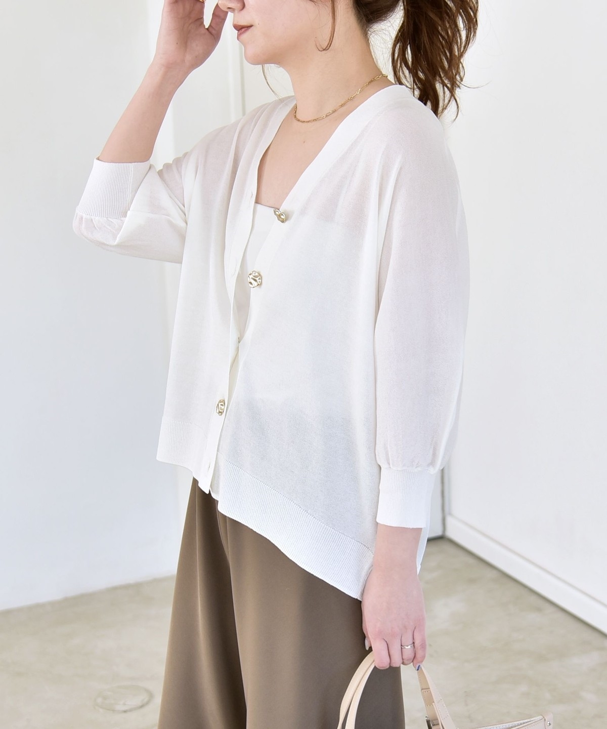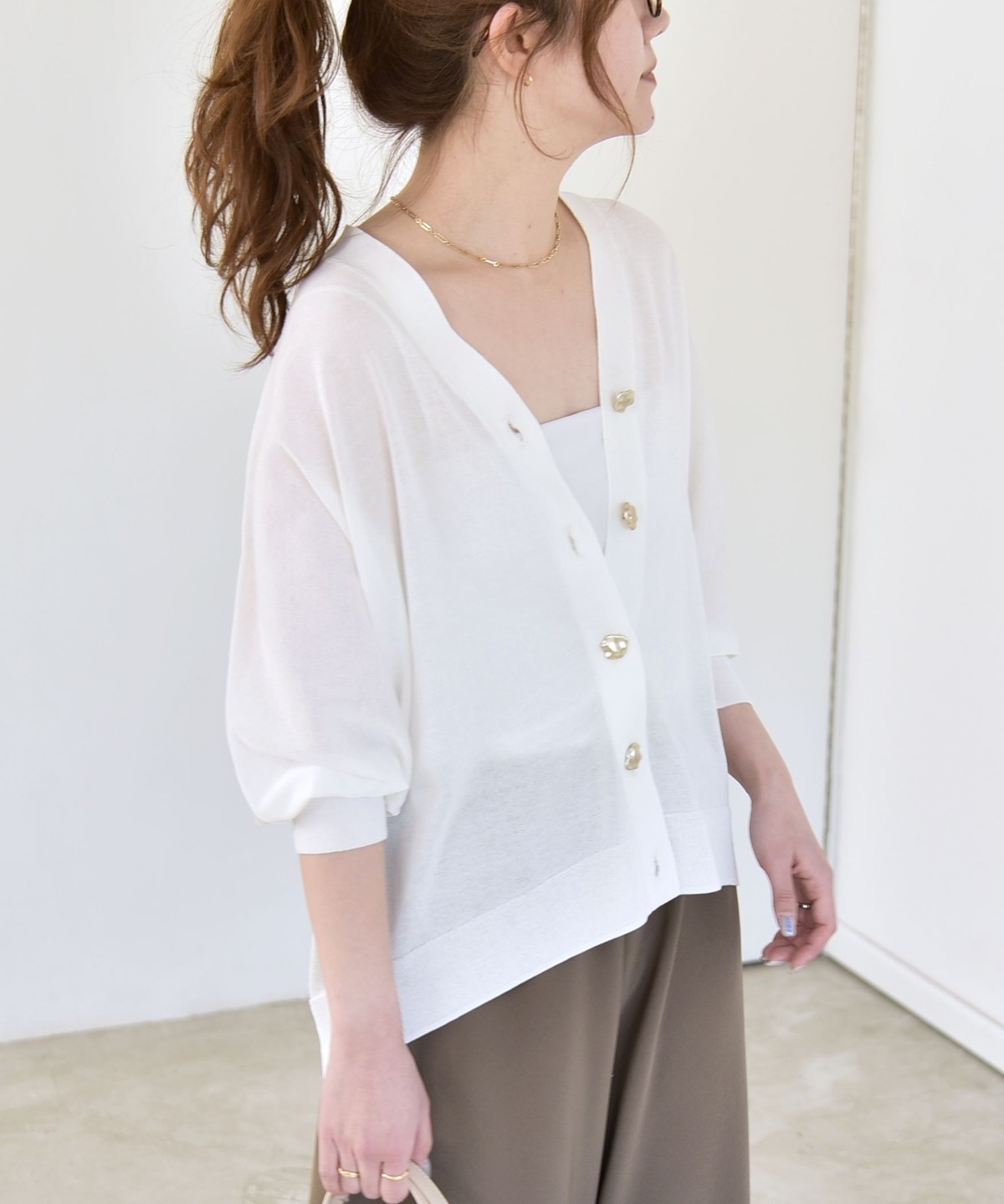 3. 《予約》quaranciel:〈接触冷感/手洗い可能〉メタルボタン Vネック シアー ニット カーディガン オフホワイト