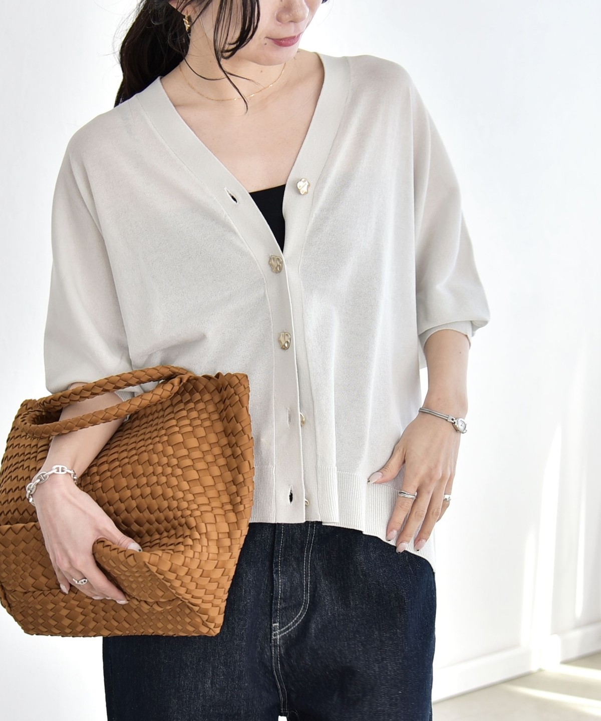 48. 《予約》quaranciel:〈接触冷感/手洗い可能〉メタルボタン Vネック シアー ニット カーディガン