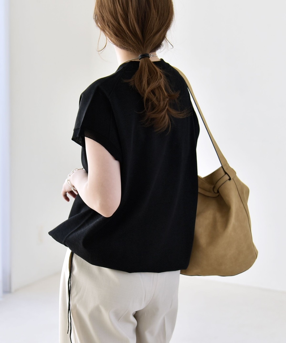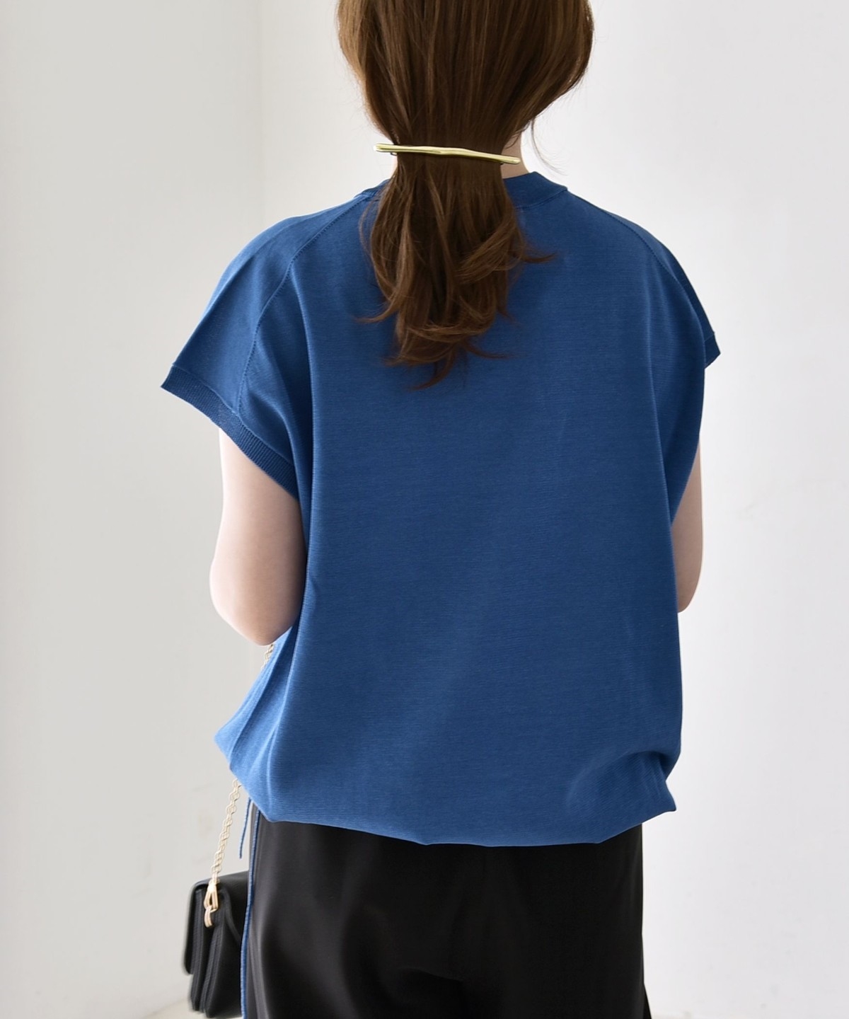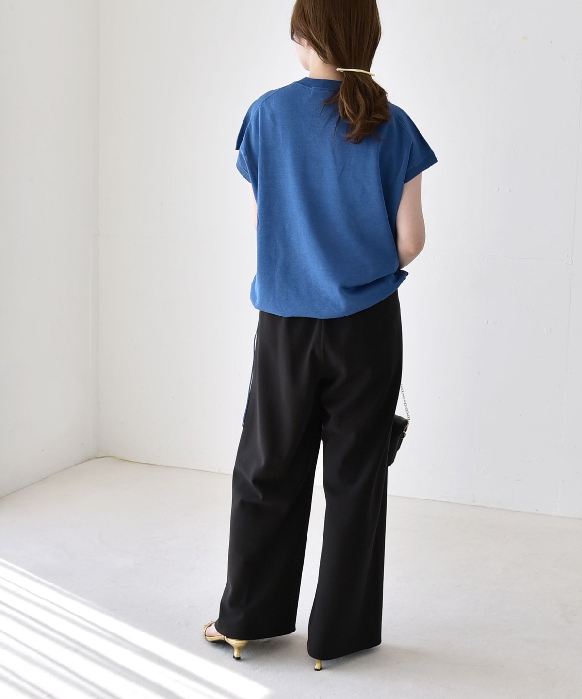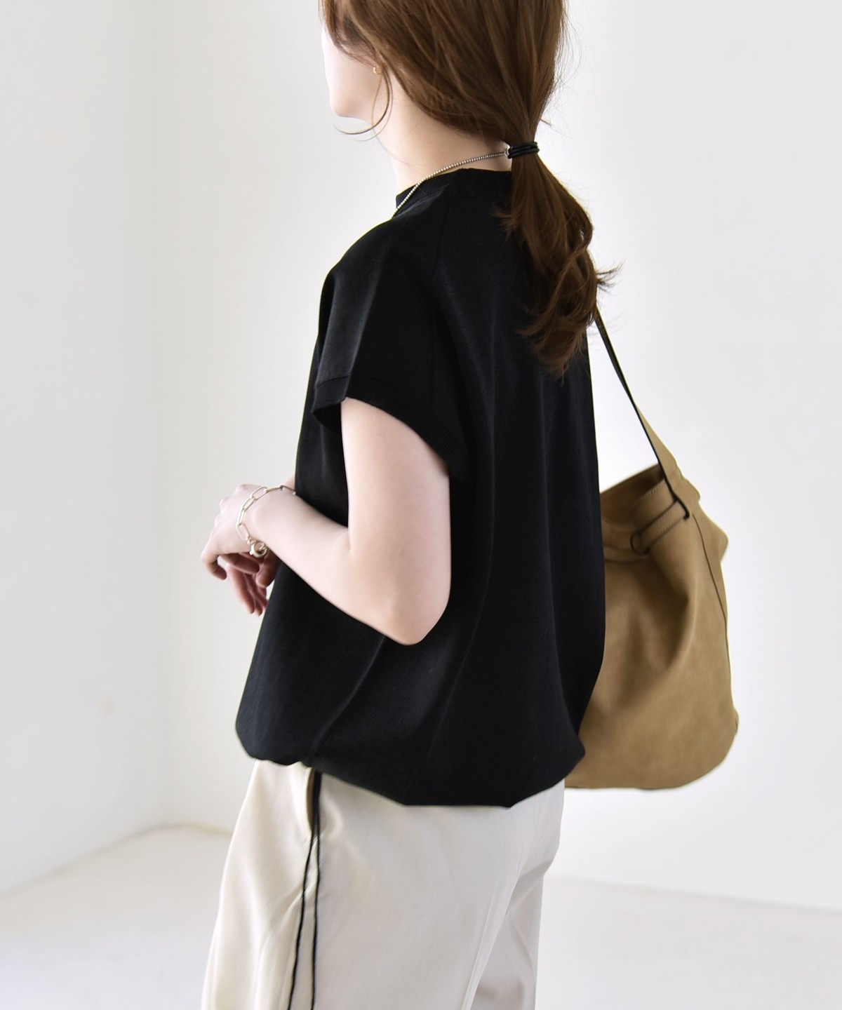 パンツ合わせの時はきゅっと絞って、タイトスカートには裾は絞らずシルエットのコントラストを楽しむと素敵です。