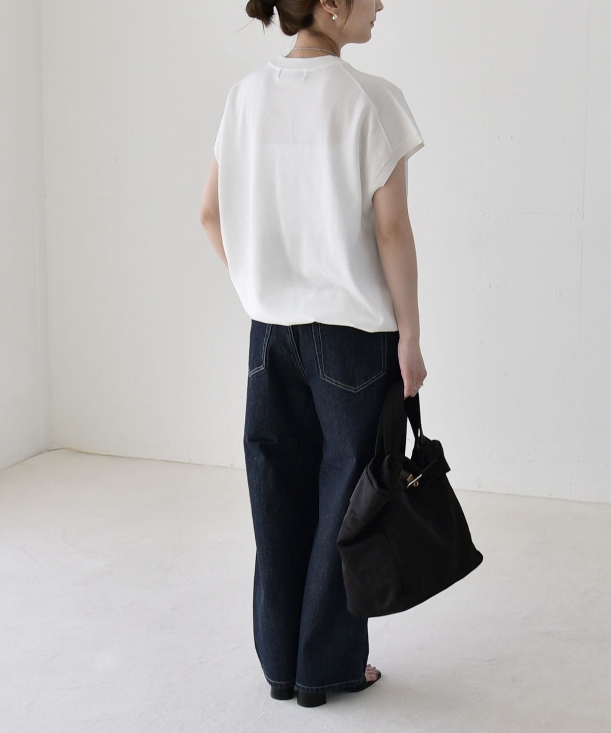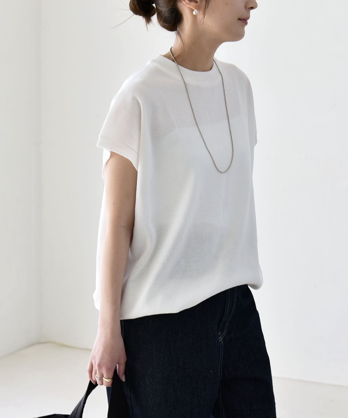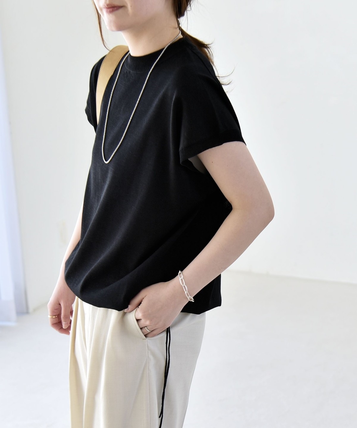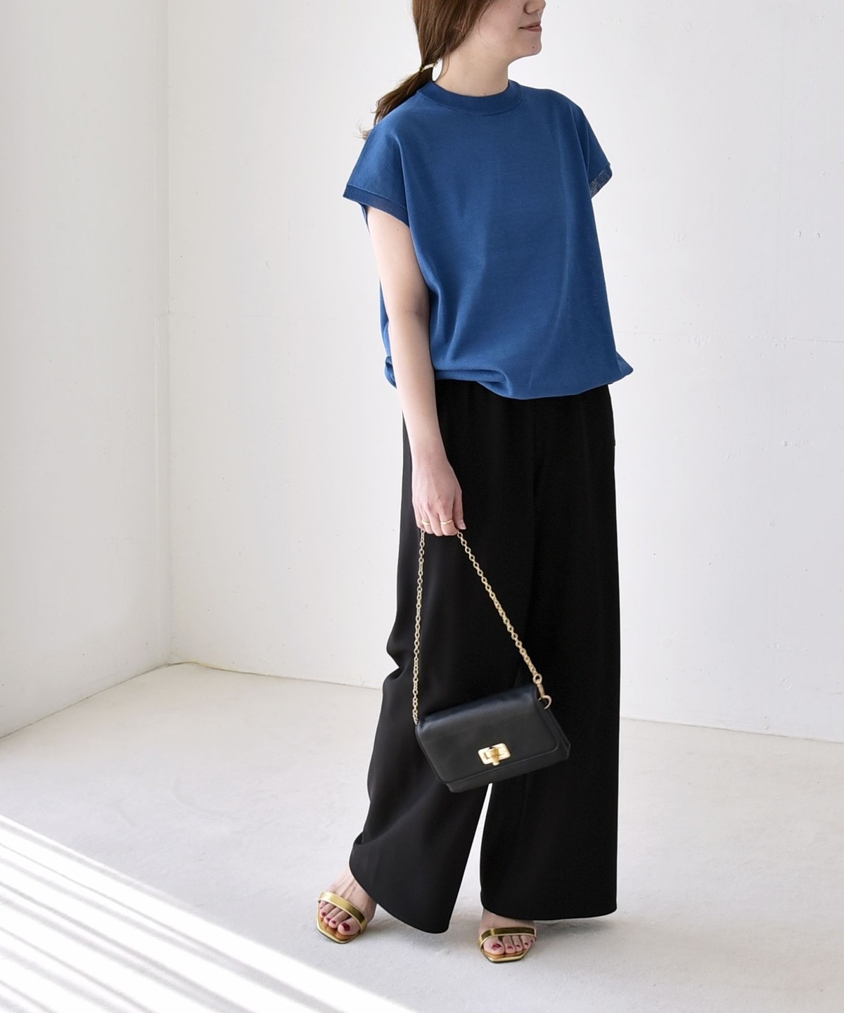 パンツ合わせの時はきゅっと絞って、タイトスカートには裾は絞らずシルエットのコントラストを楽しむと素敵です。