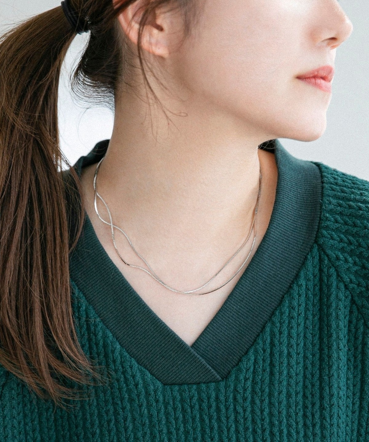 スクエアネックやクルーネックなど少し襟もとが開いたトップスにつけるとより女性らしいスタイリングに仕上げてくれます。