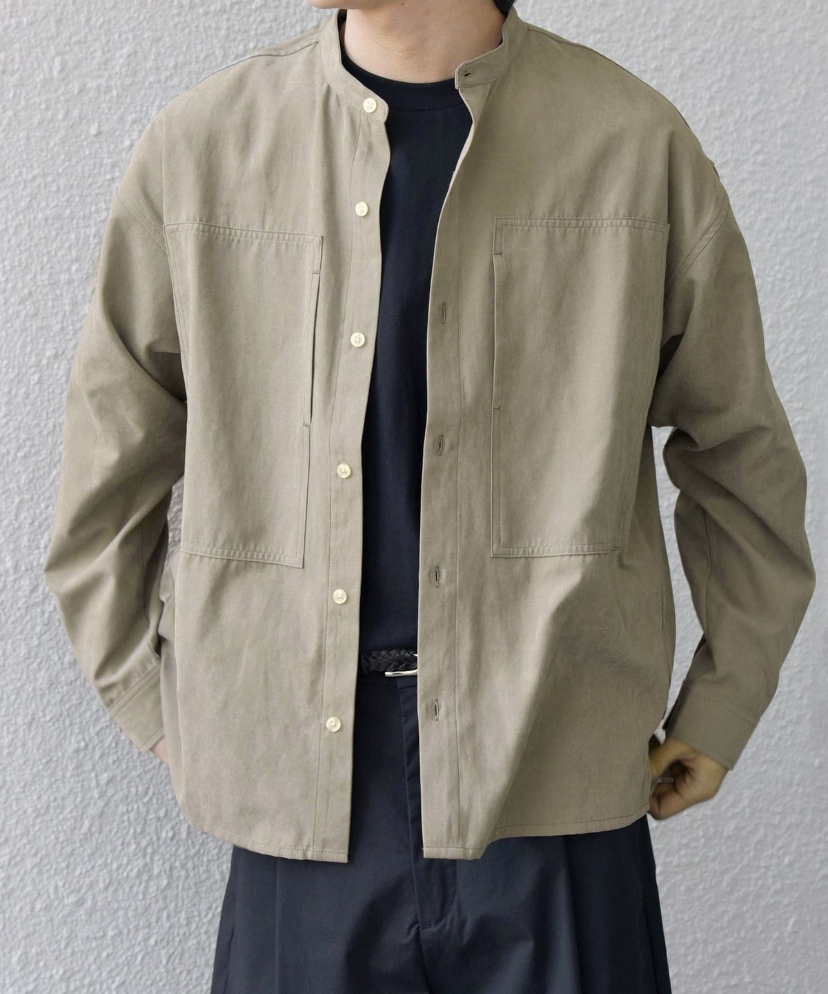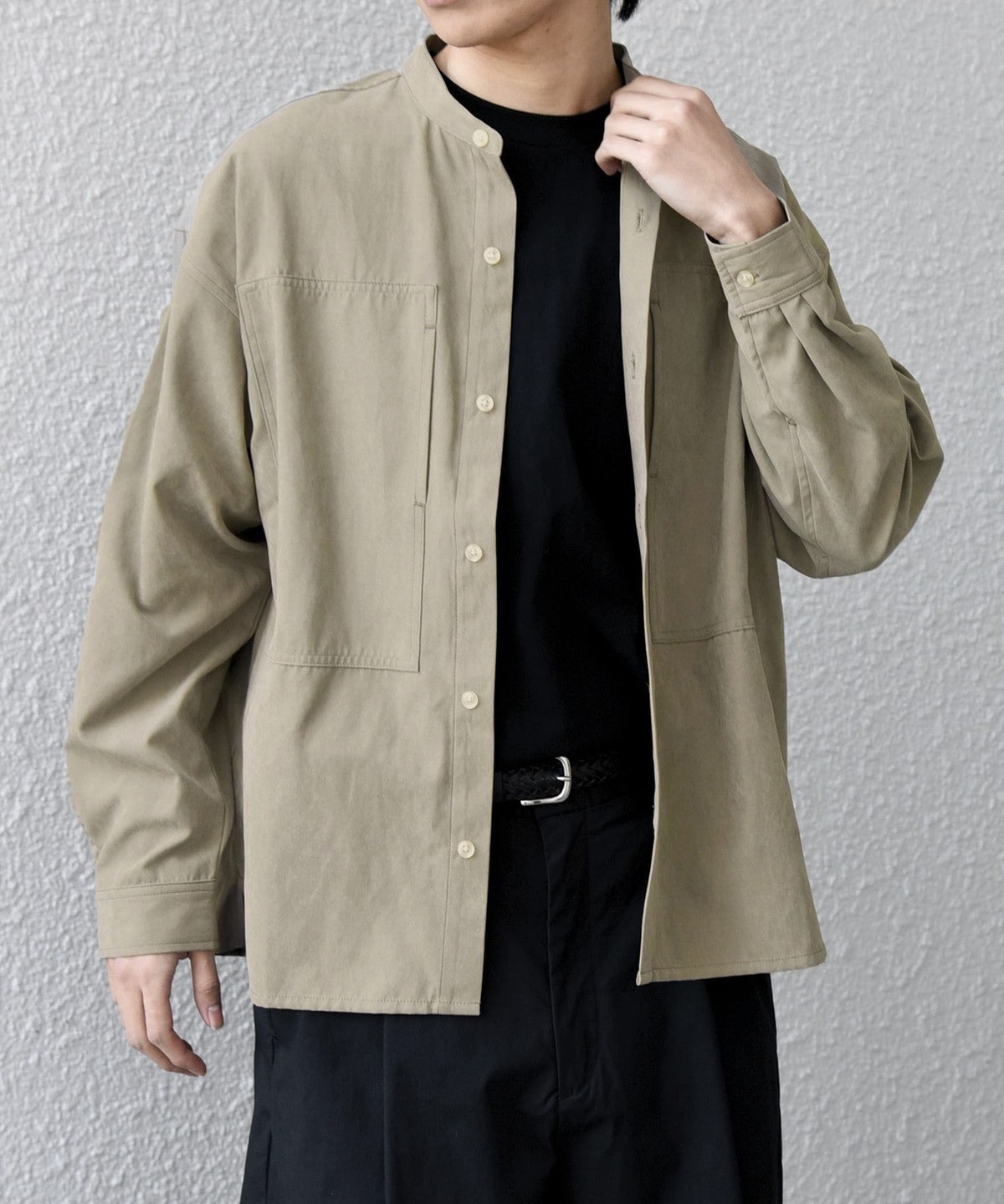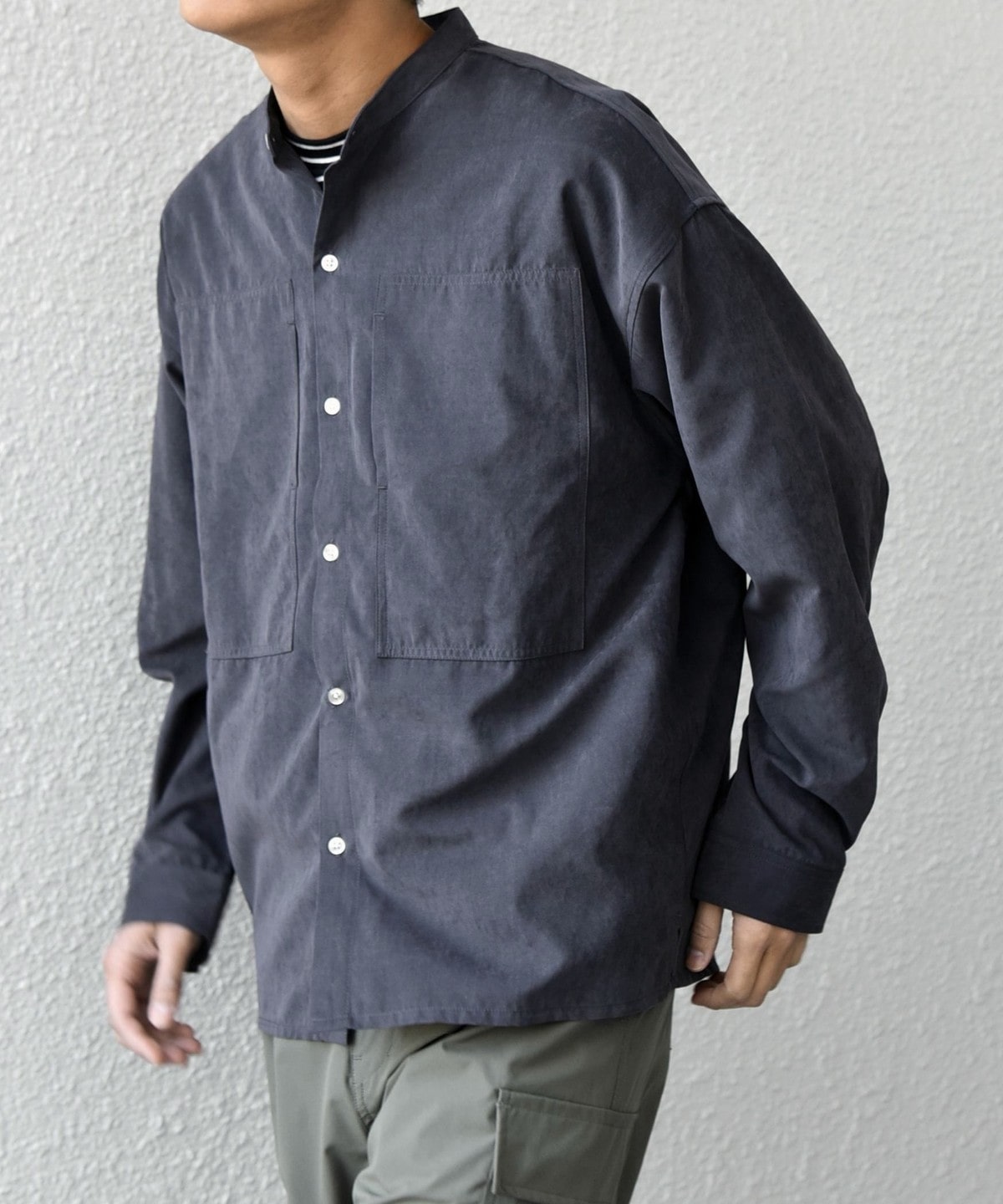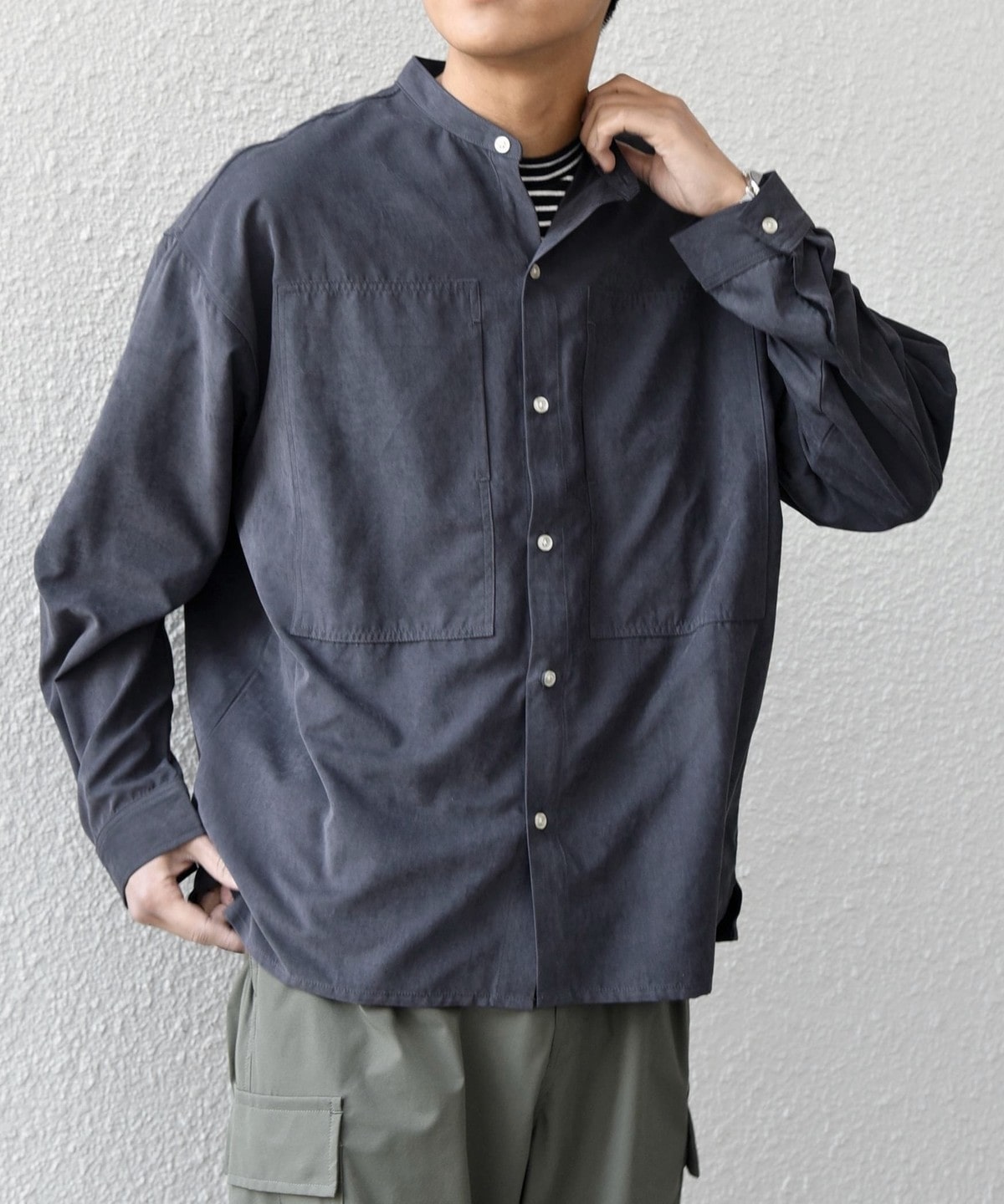 肌触りの良いピーチスキン素材を使用!羽織としても活躍するバンドカラーシャツ