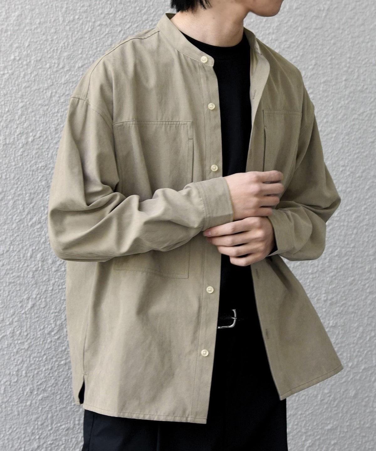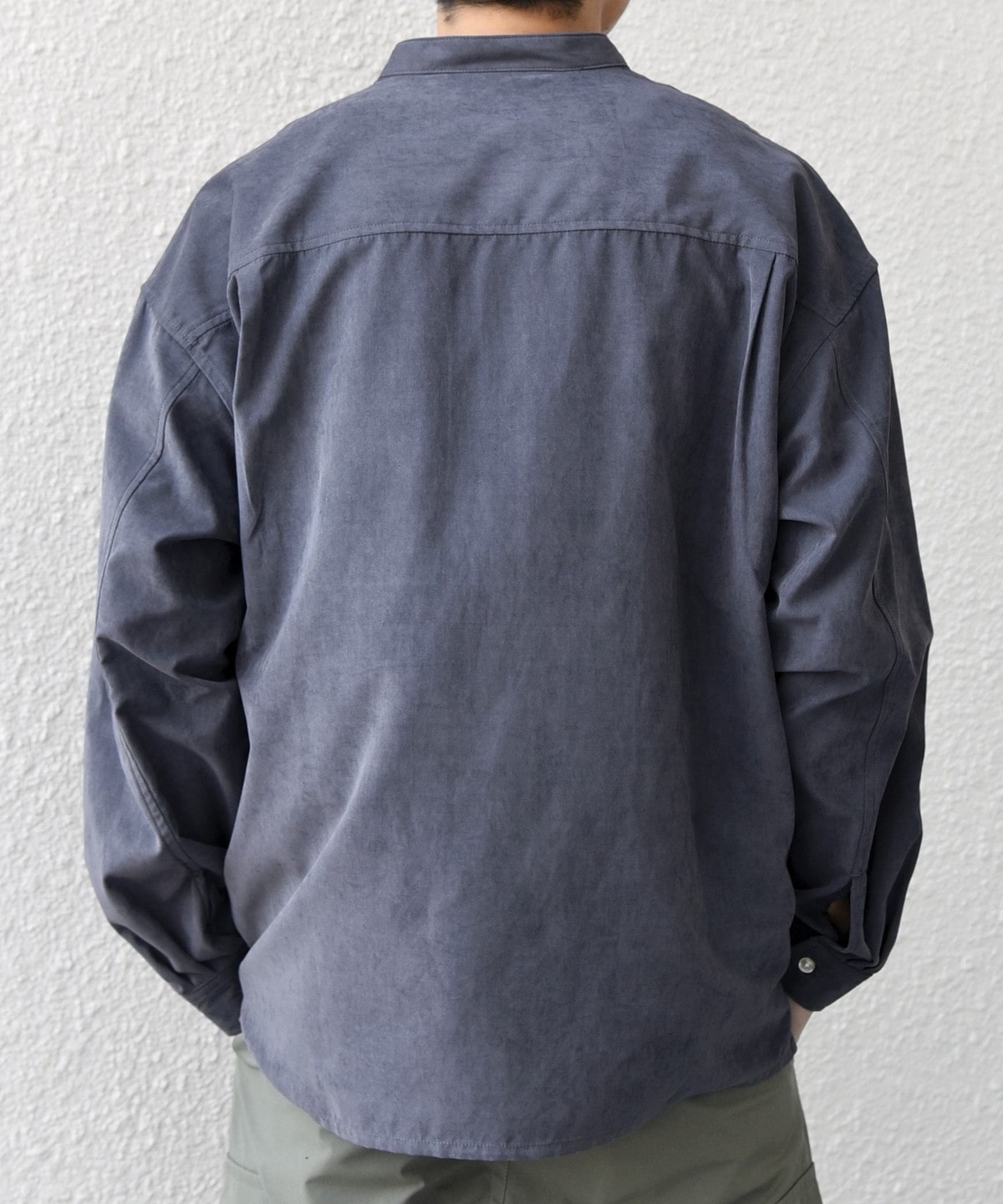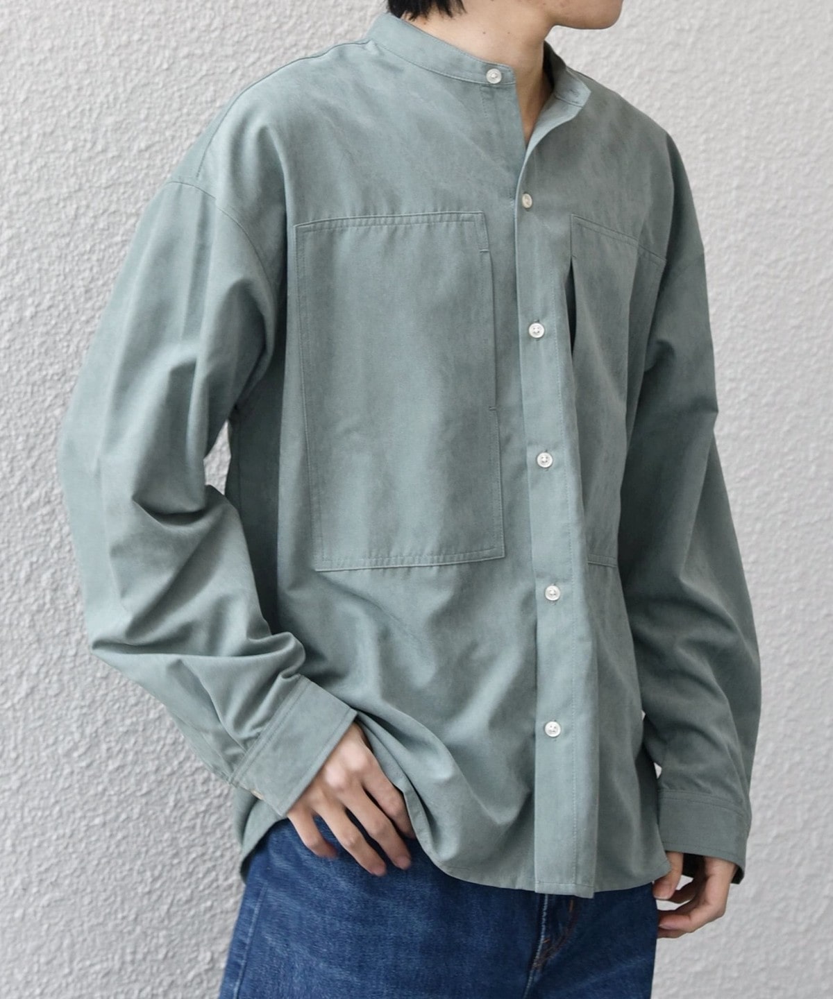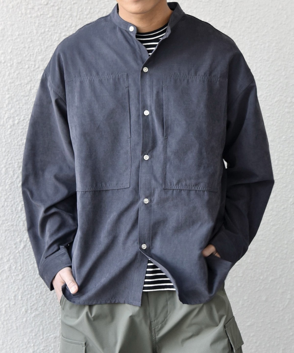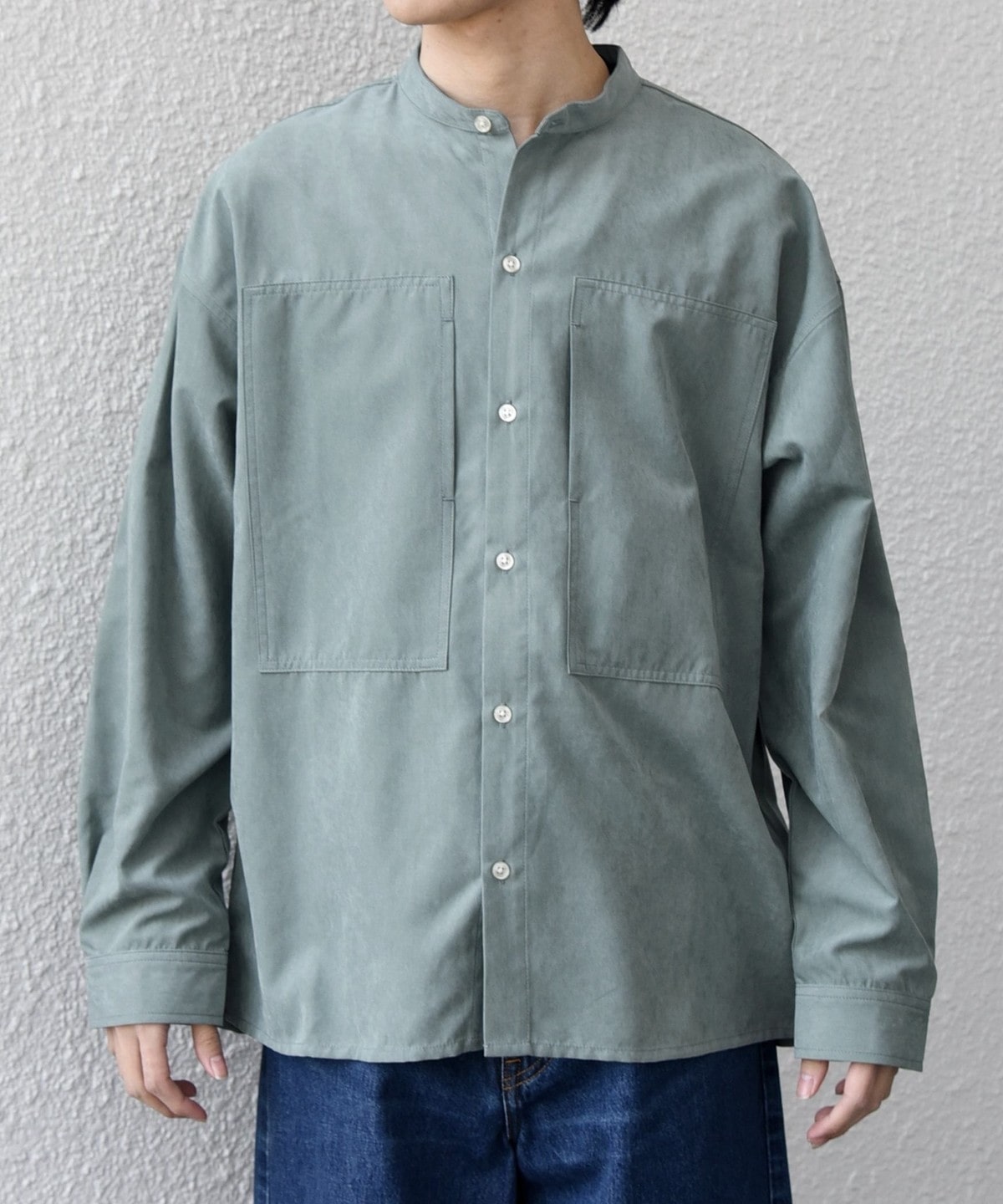 肌触りの良いピーチスキン素材を使用!羽織としても活躍するバンドカラーシャツ