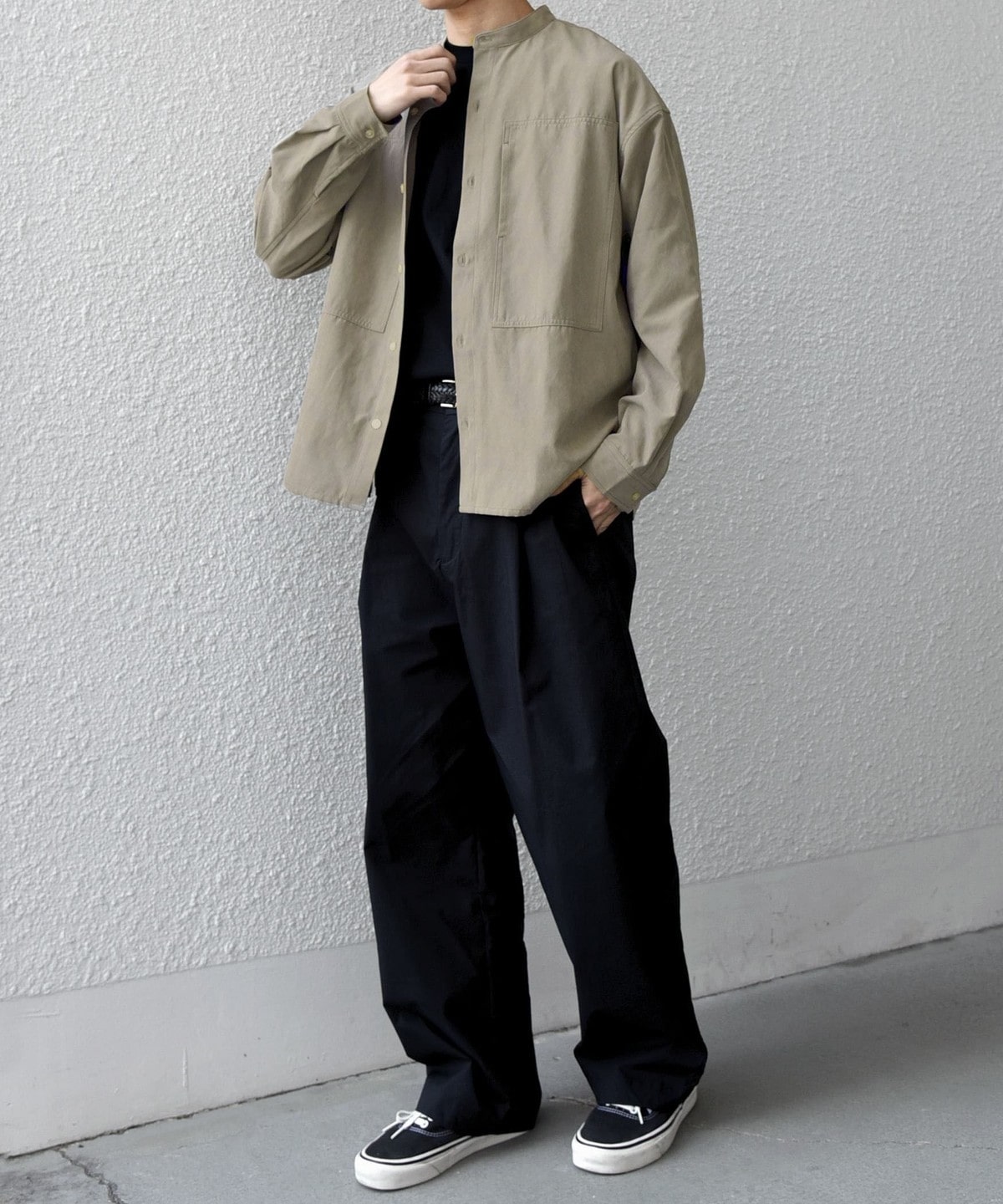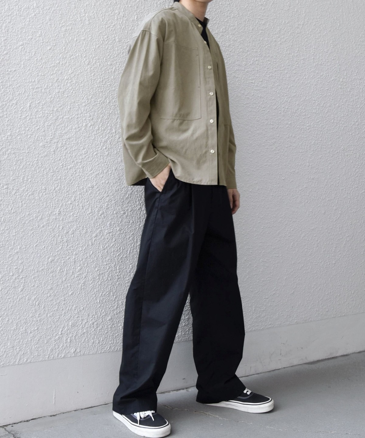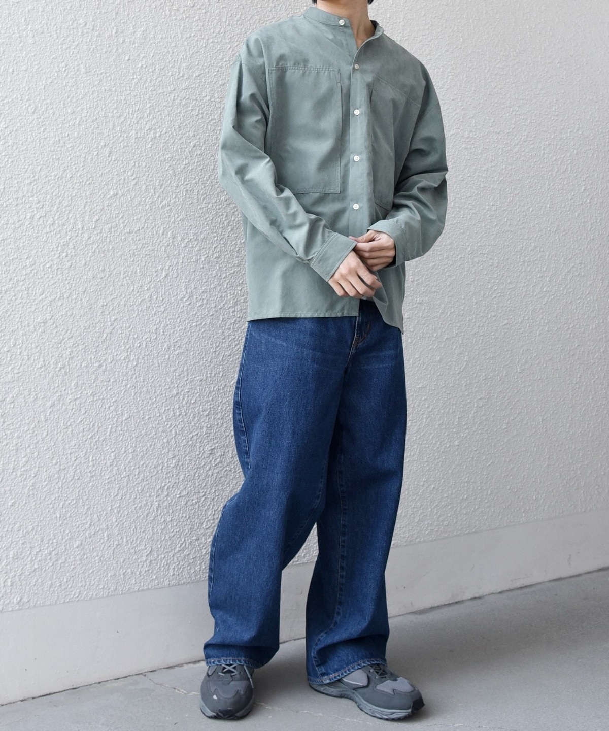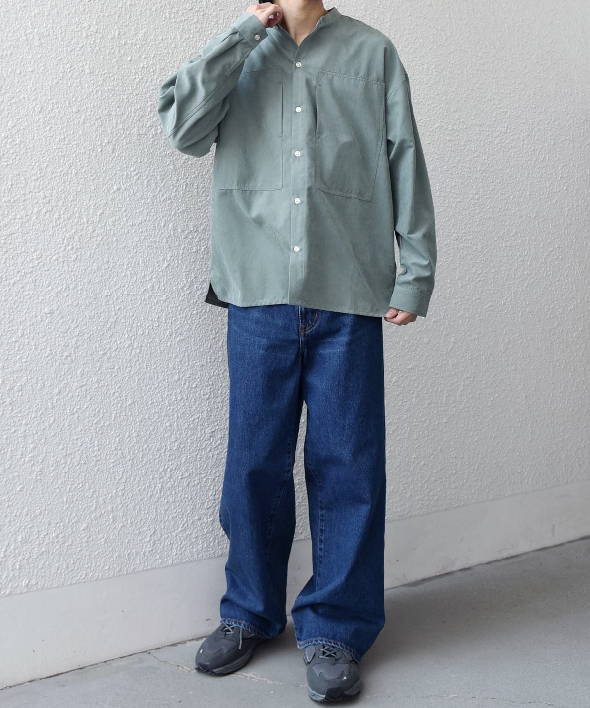 肌触りの良いピーチスキン素材を使用!羽織としても活躍するバンドカラーシャツ