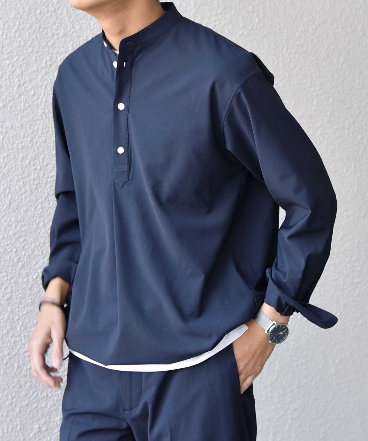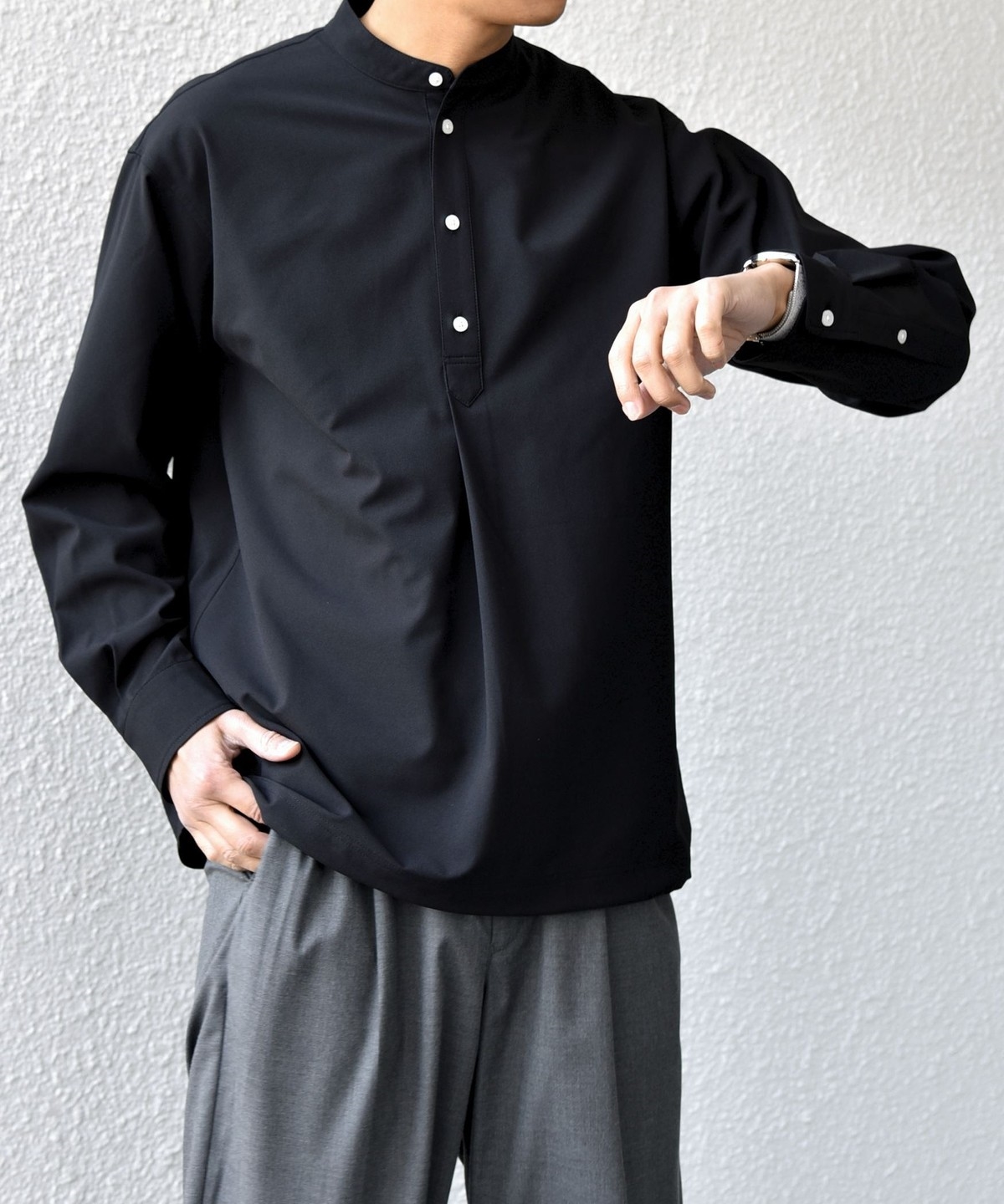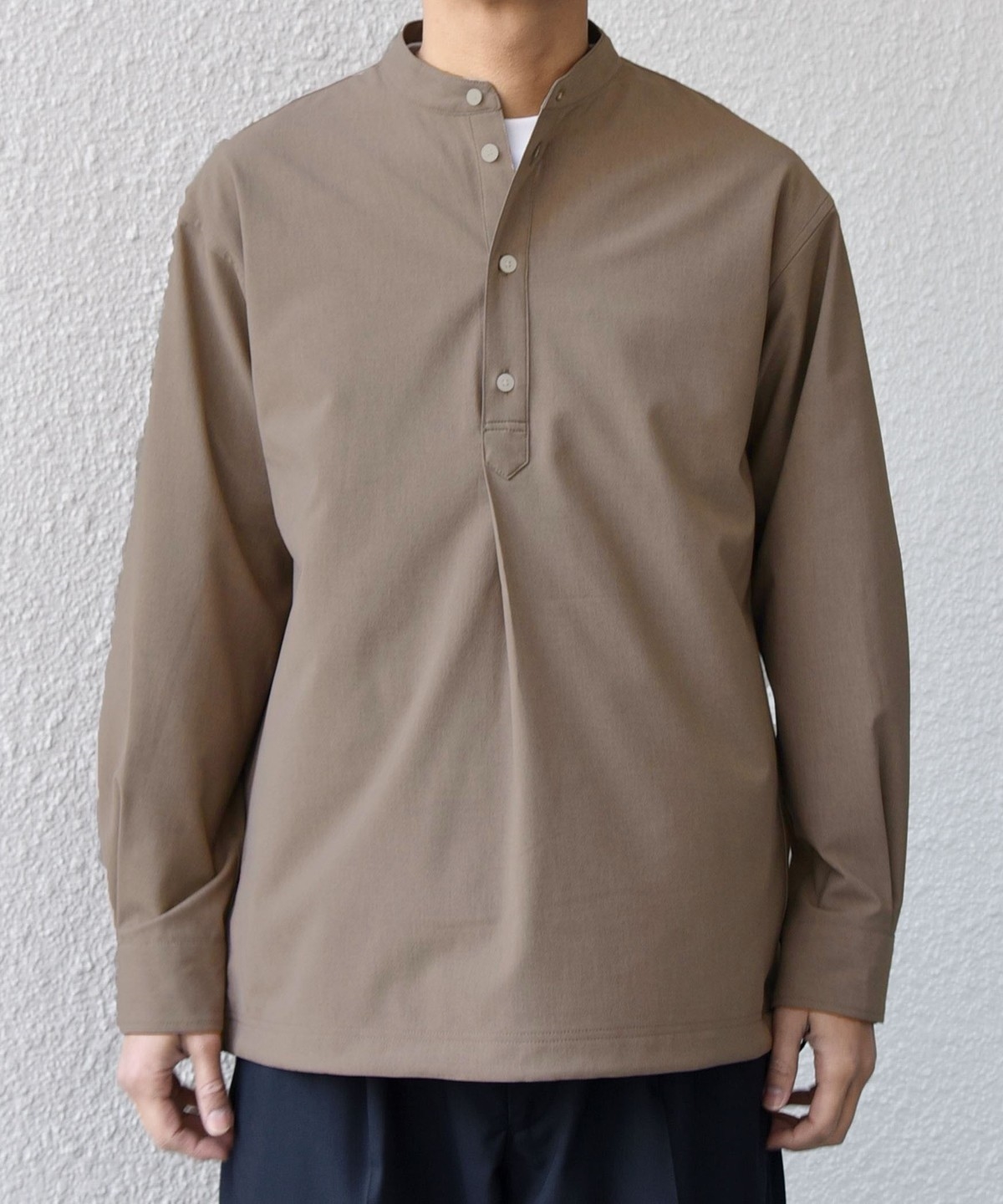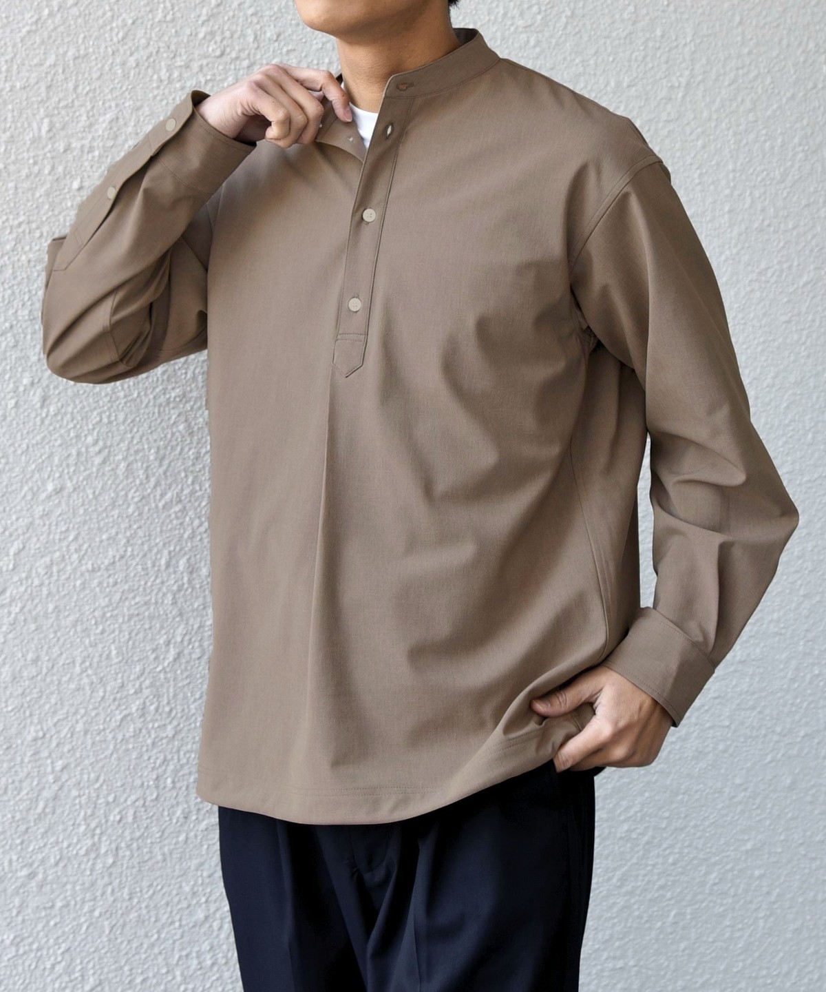 今期は人気のタック入りバンドカラープルオーバーシャツの裾をスピンドル仕様へとブラッシュアップ!
