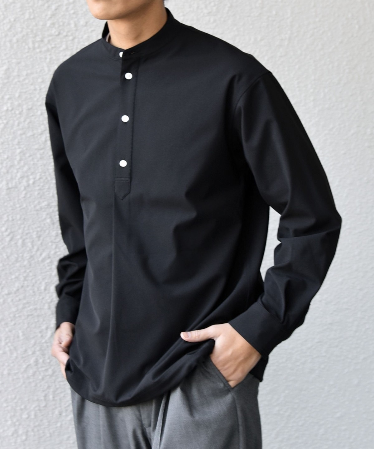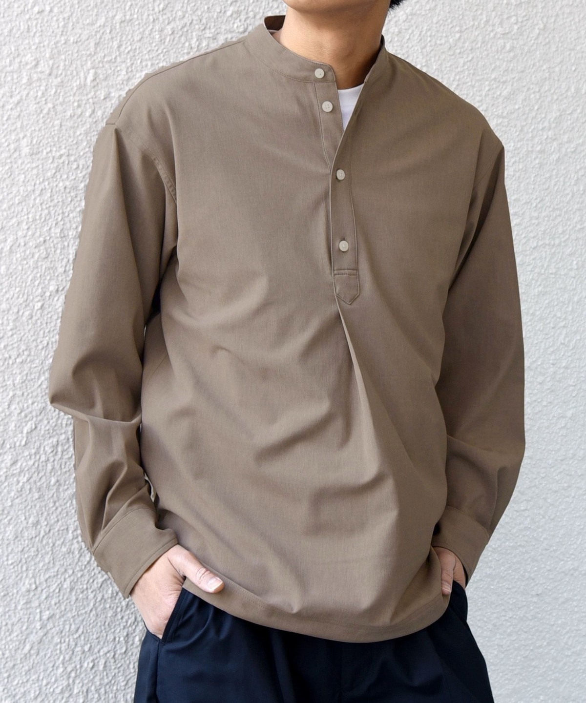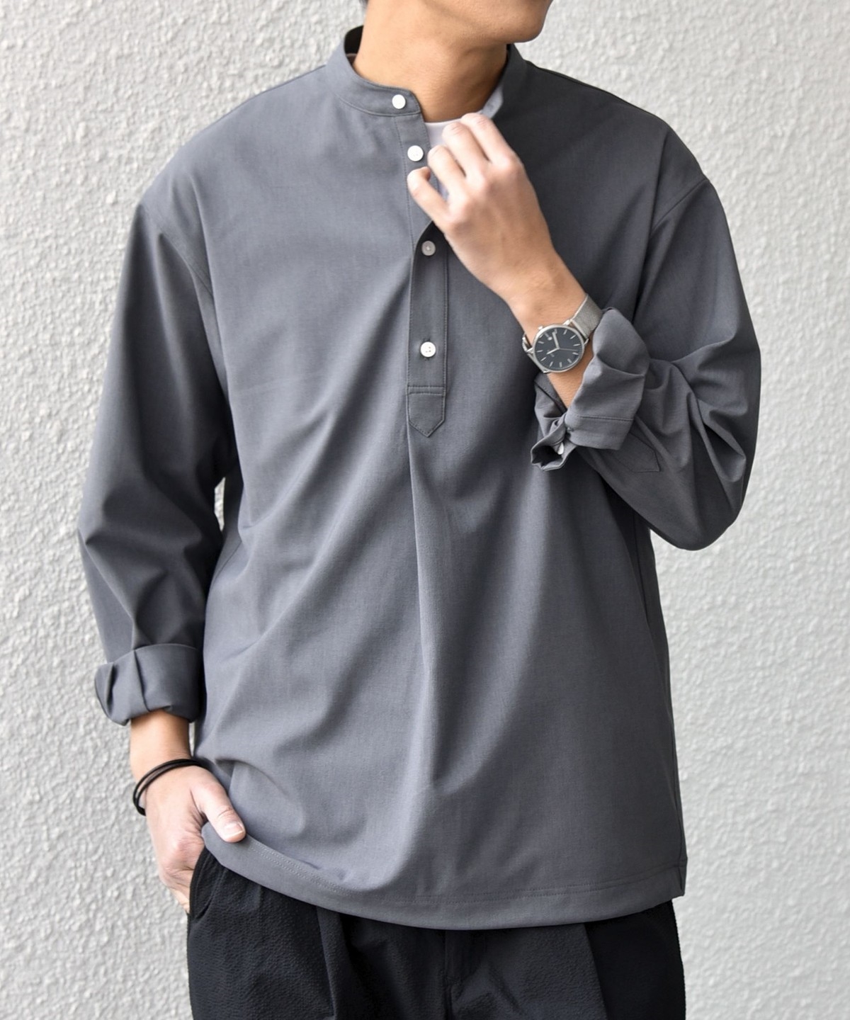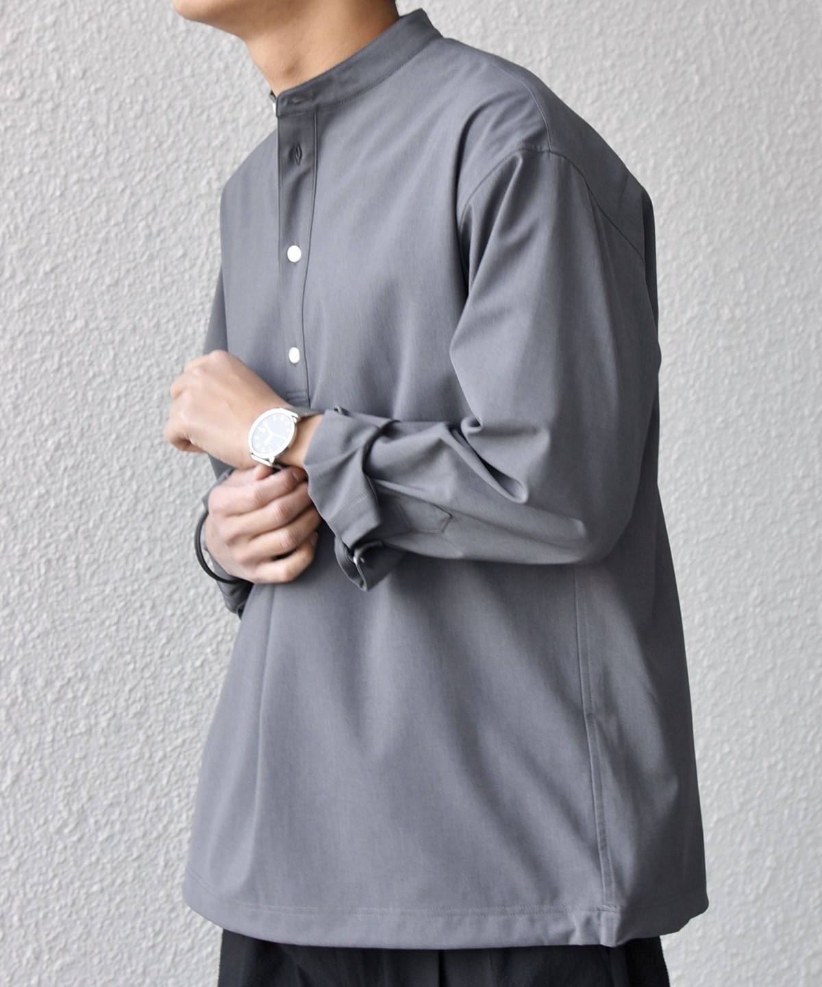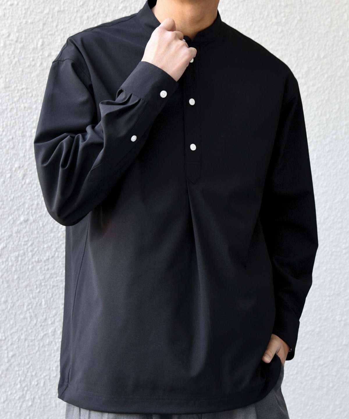 今期は人気のタック入りバンドカラープルオーバーシャツの裾をスピンドル仕様へとブラッシュアップ!