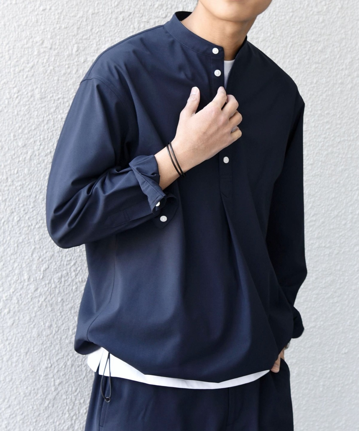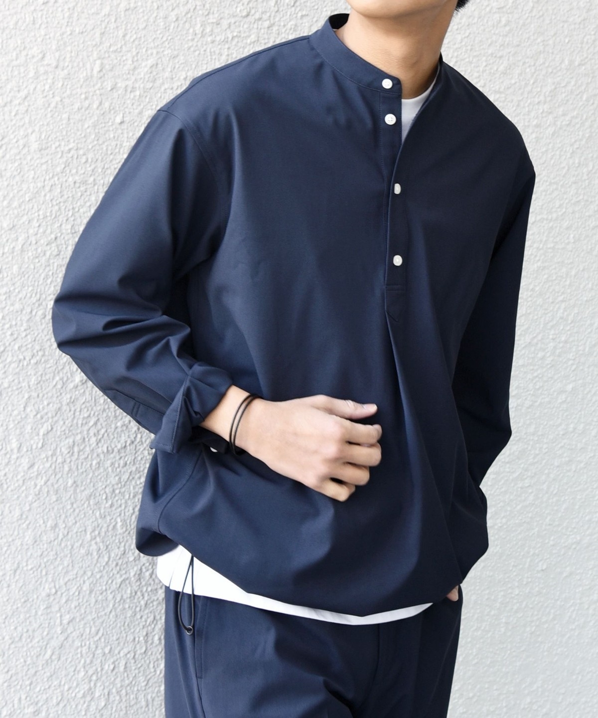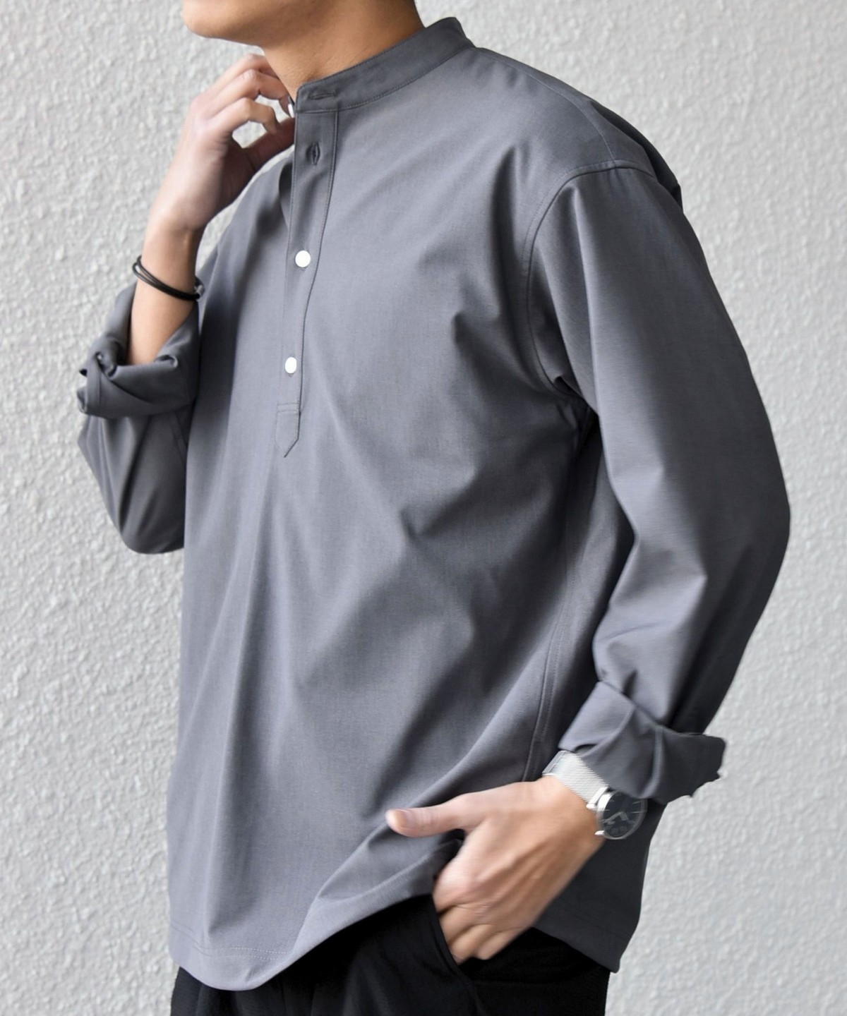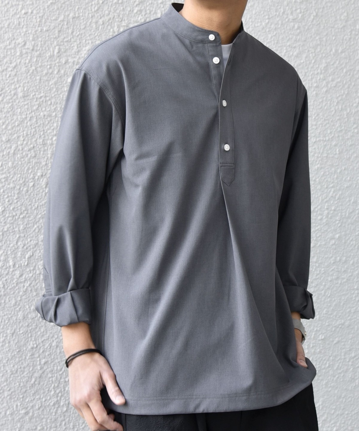 今期は人気のタック入りバンドカラープルオーバーシャツの裾をスピンドル仕様へとブラッシュアップ!