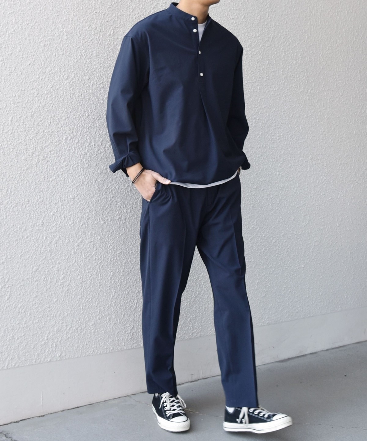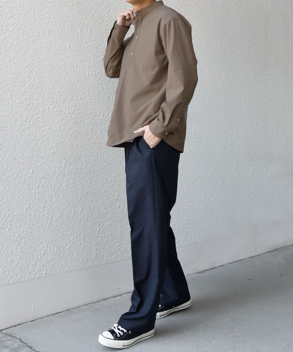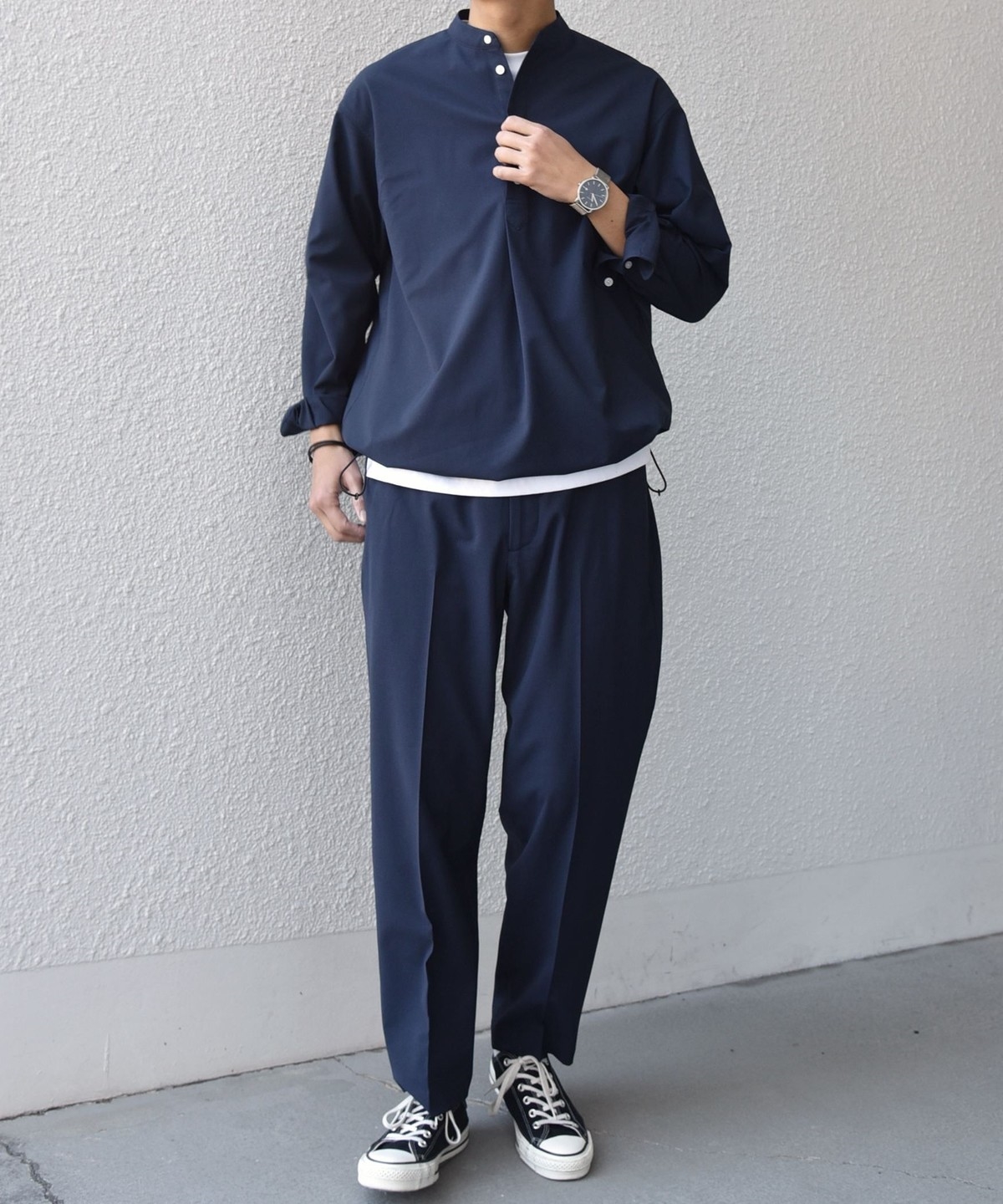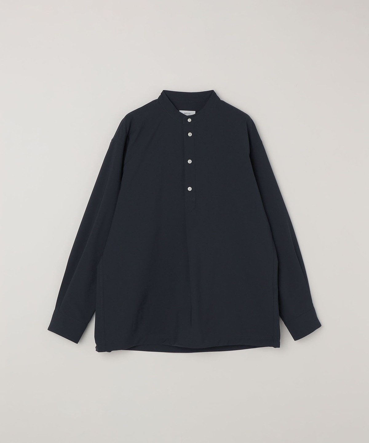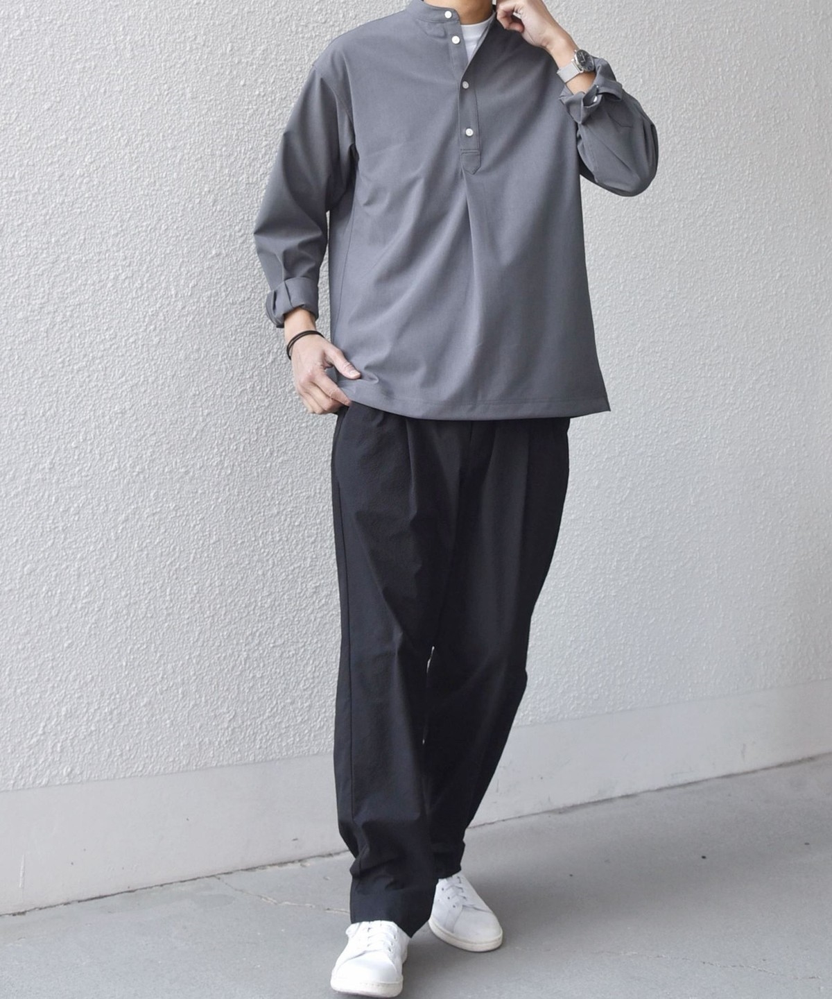 今期は人気のタック入りバンドカラープルオーバーシャツの裾をスピンドル仕様へとブラッシュアップ!