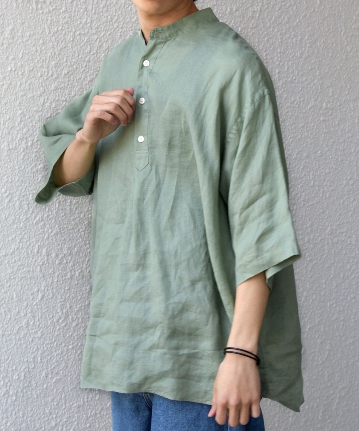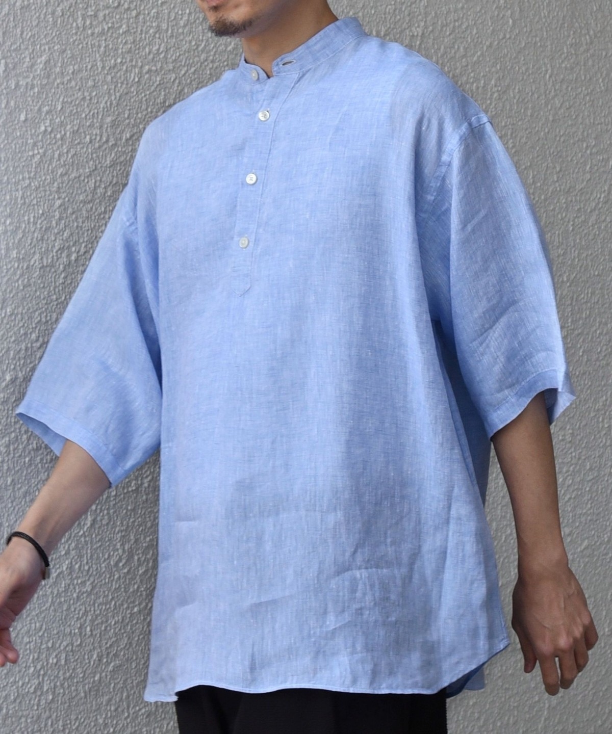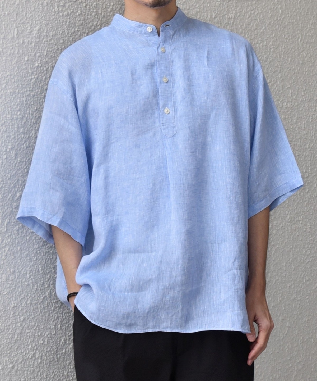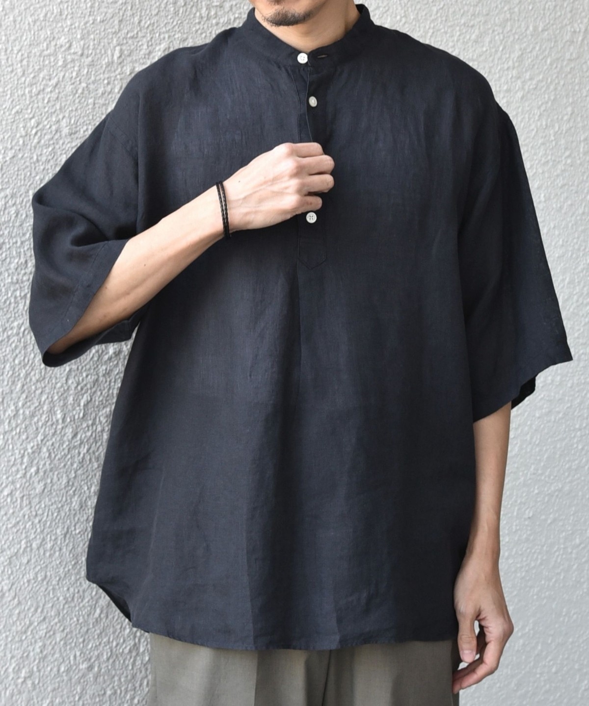 襟はバンドカラーですっきりさを出し、ボタンの開きぐあいによってはスキッパーシャツのように着こなすことも可能。