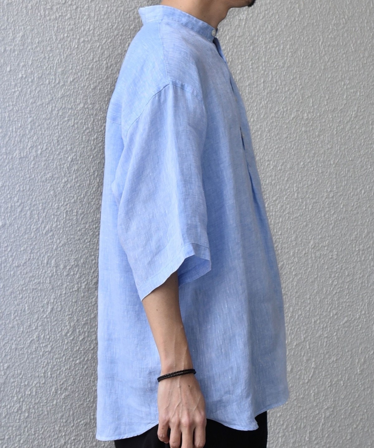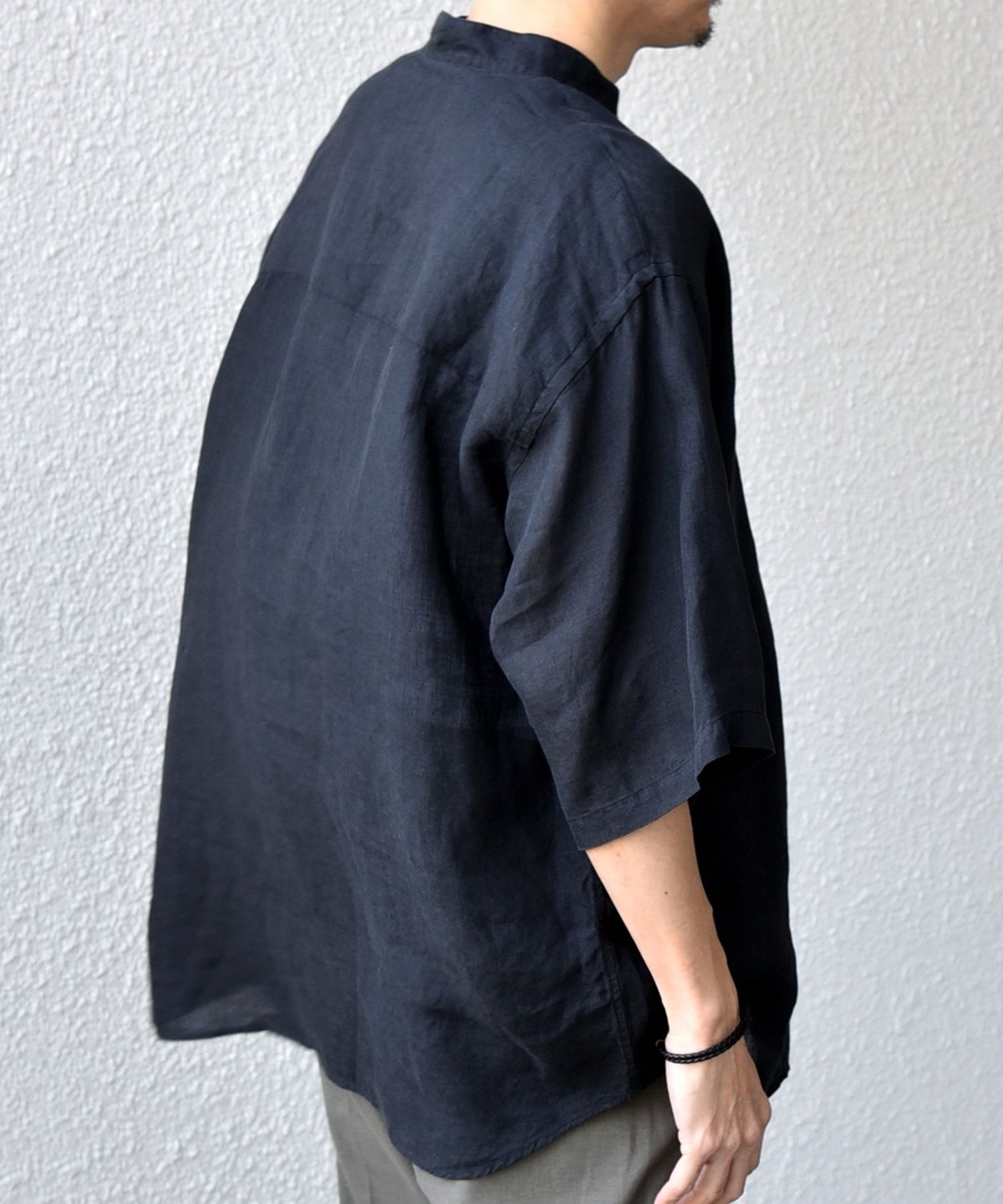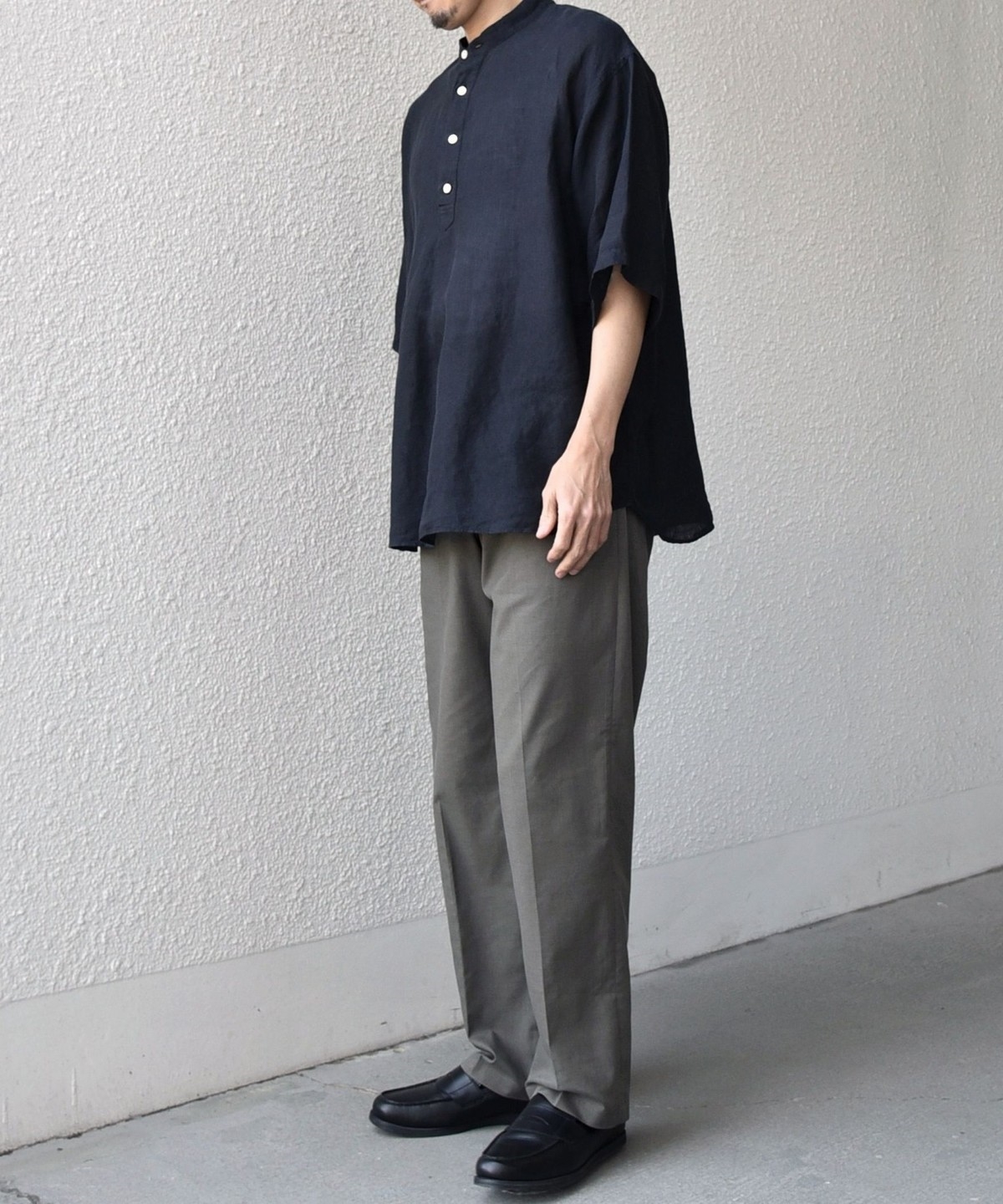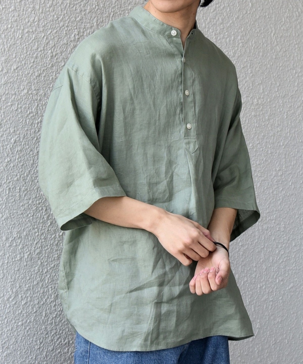 襟はバンドカラーですっきりさを出し、ボタンの開きぐあいによってはスキッパーシャツのように着こなすことも可能。