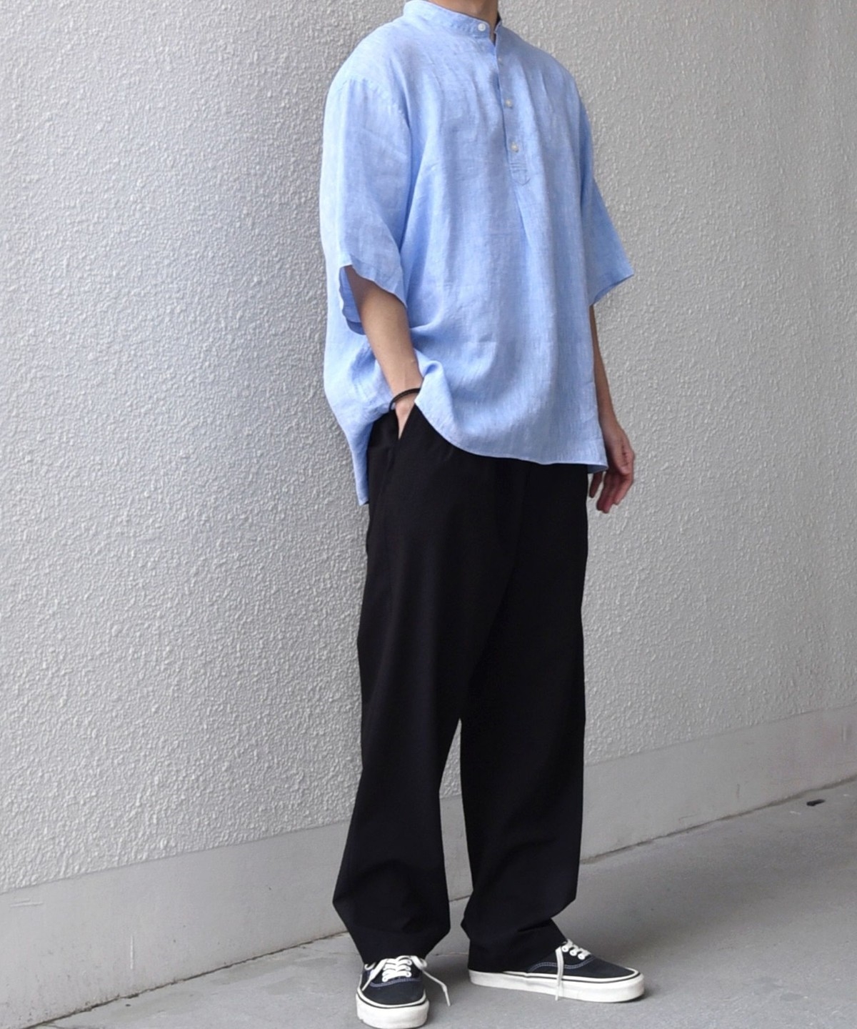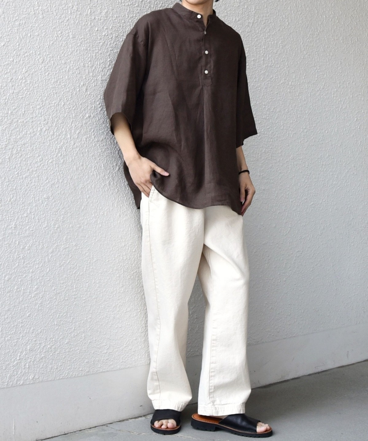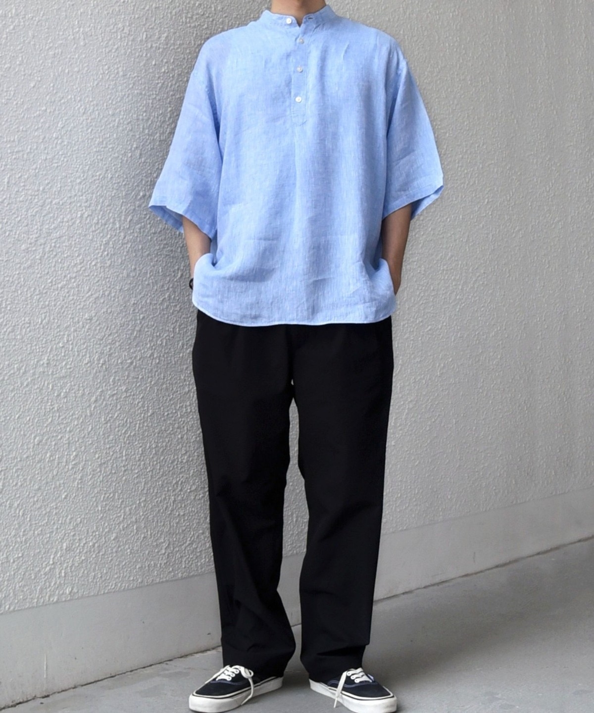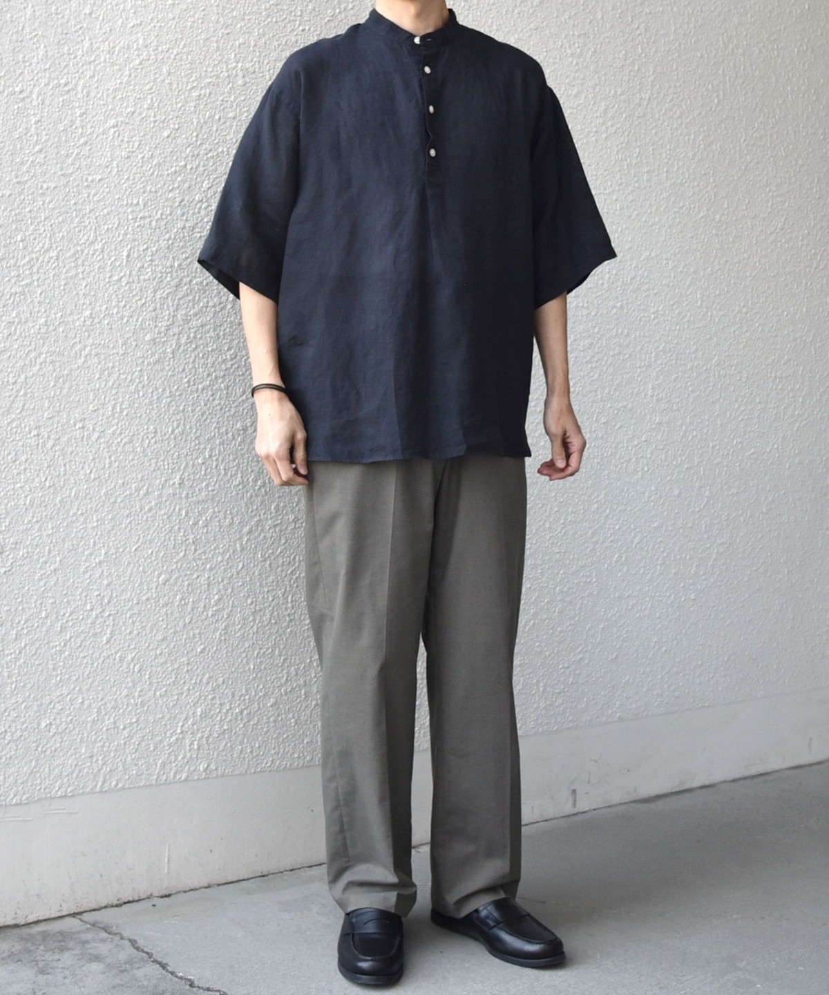 襟はバンドカラーですっきりさを出し、ボタンの開きぐあいによってはスキッパーシャツのように着こなすことも可能。