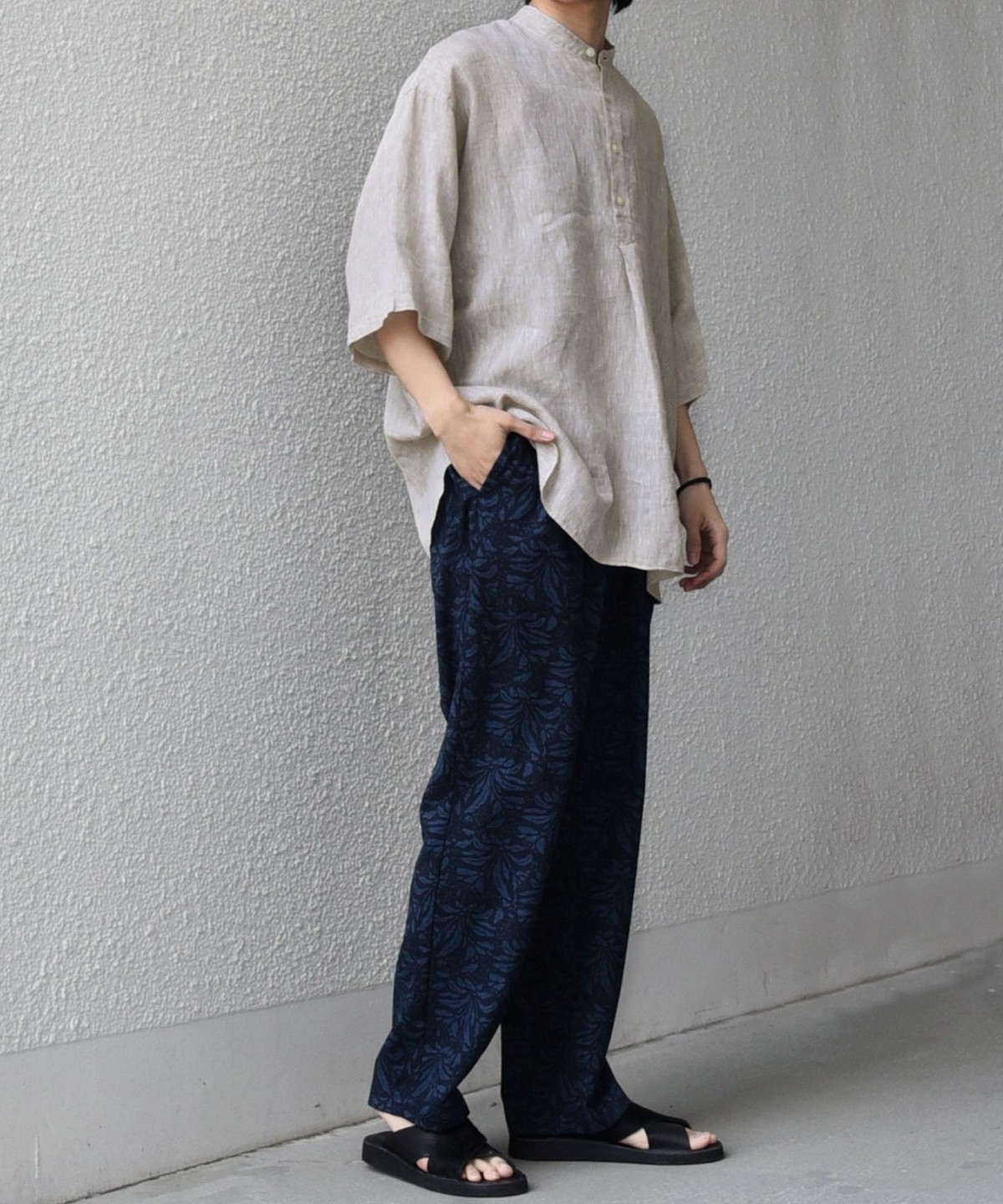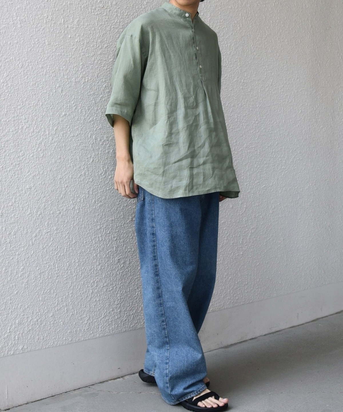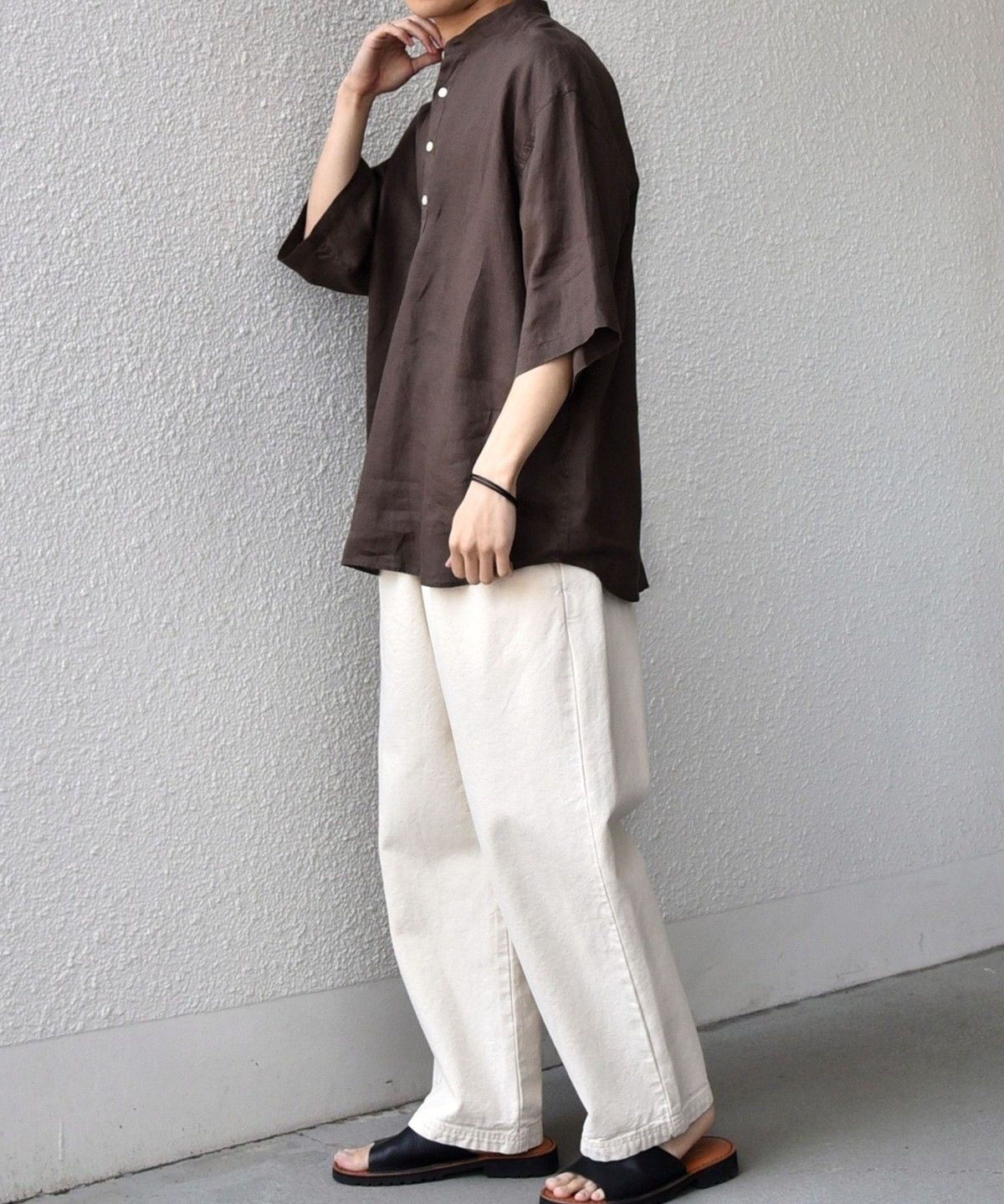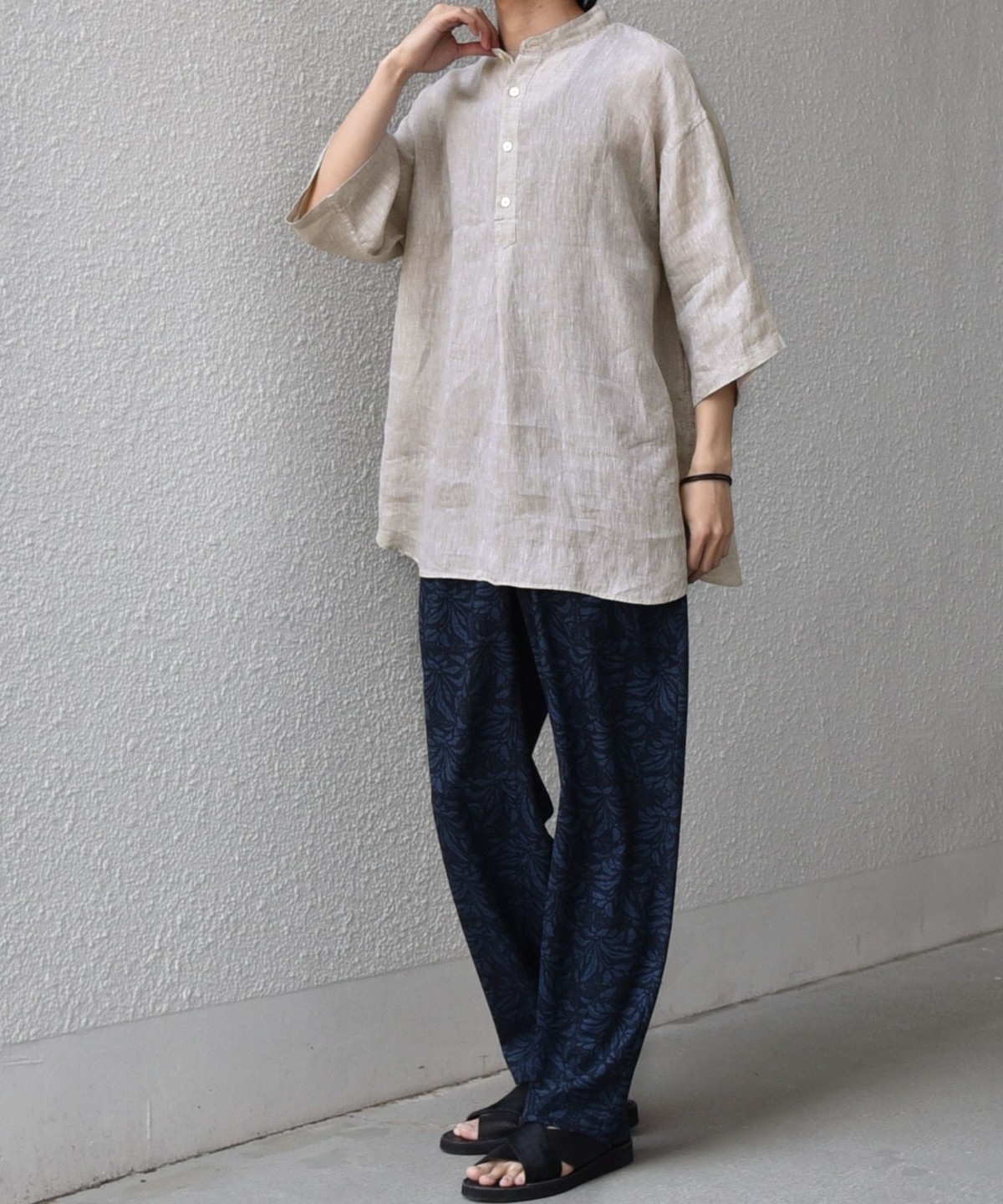 襟はバンドカラーですっきりさを出し、ボタンの開きぐあいによってはスキッパーシャツのように着こなすことも可能。