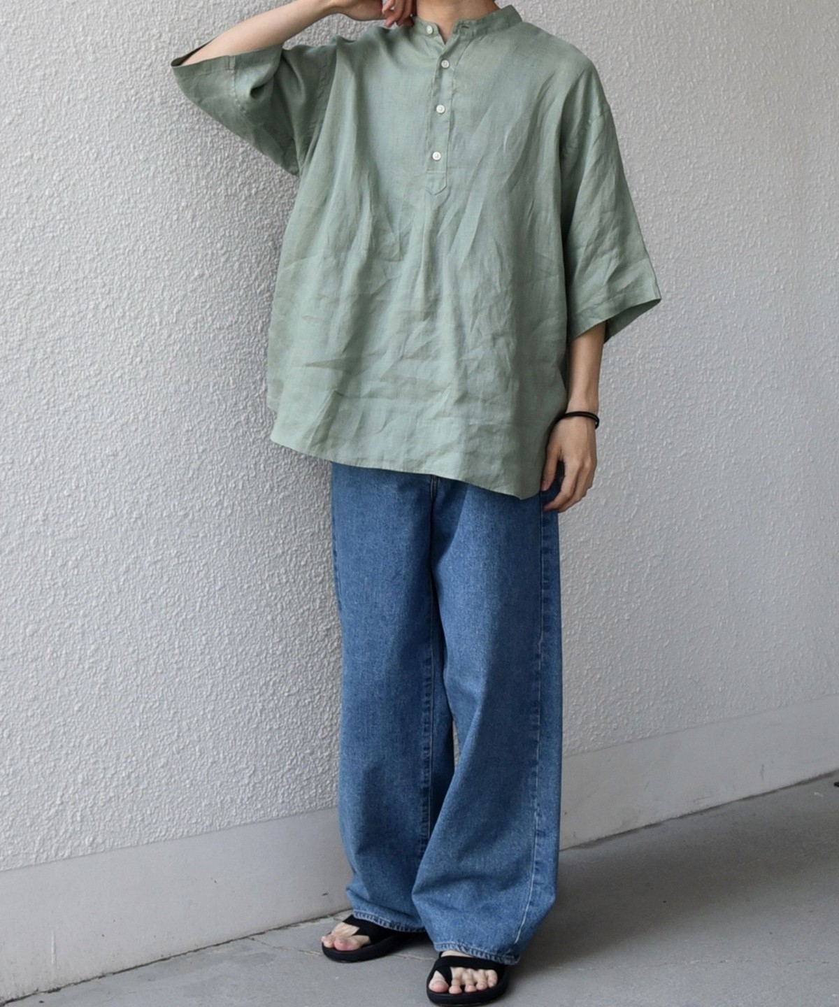 4. SHIPS any:〈洗濯機可能〉ピュアリネン バンド スキッパー ハーフスリーブ プルオーバー シャツ 26SS◆ ライトグリーン
