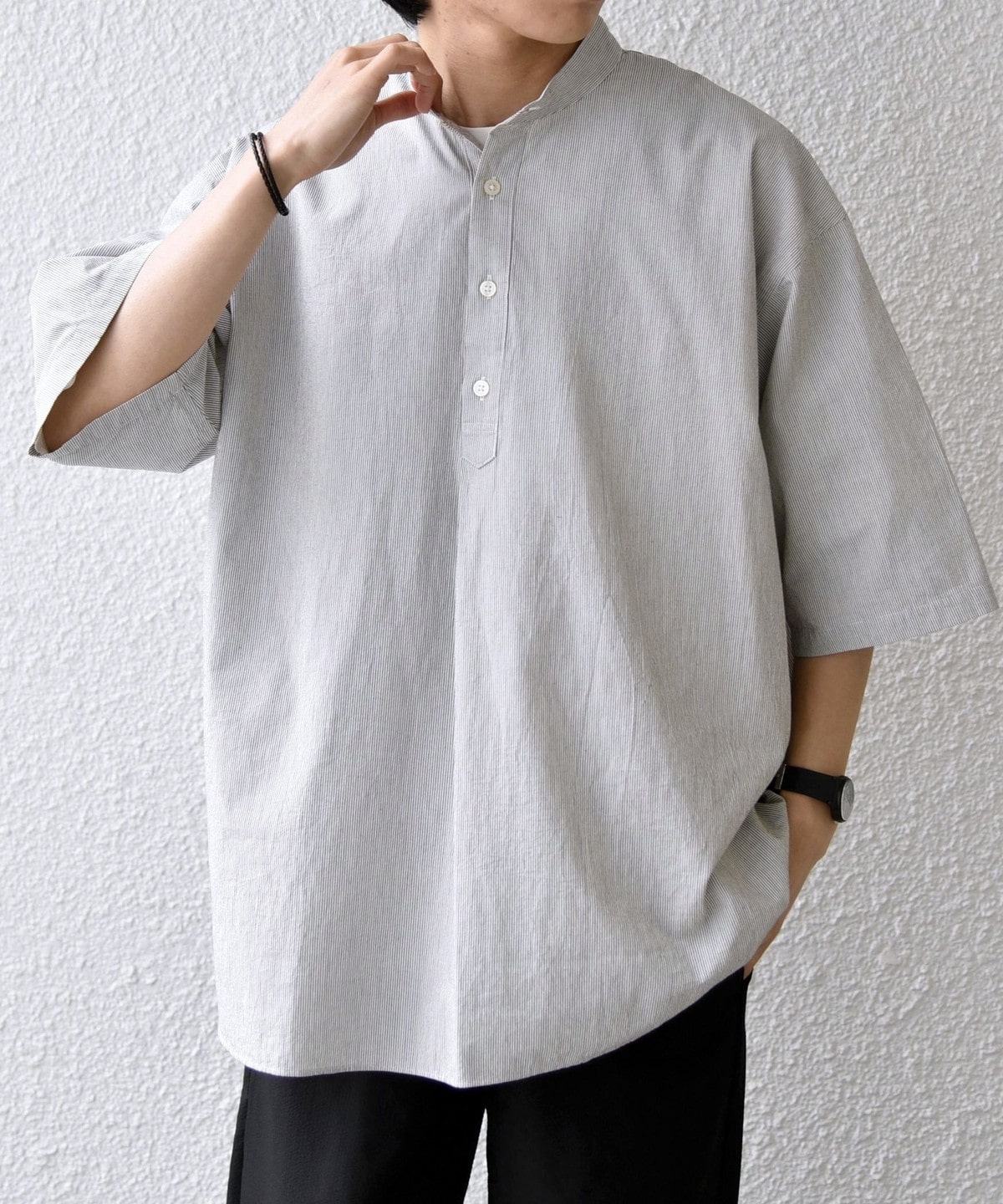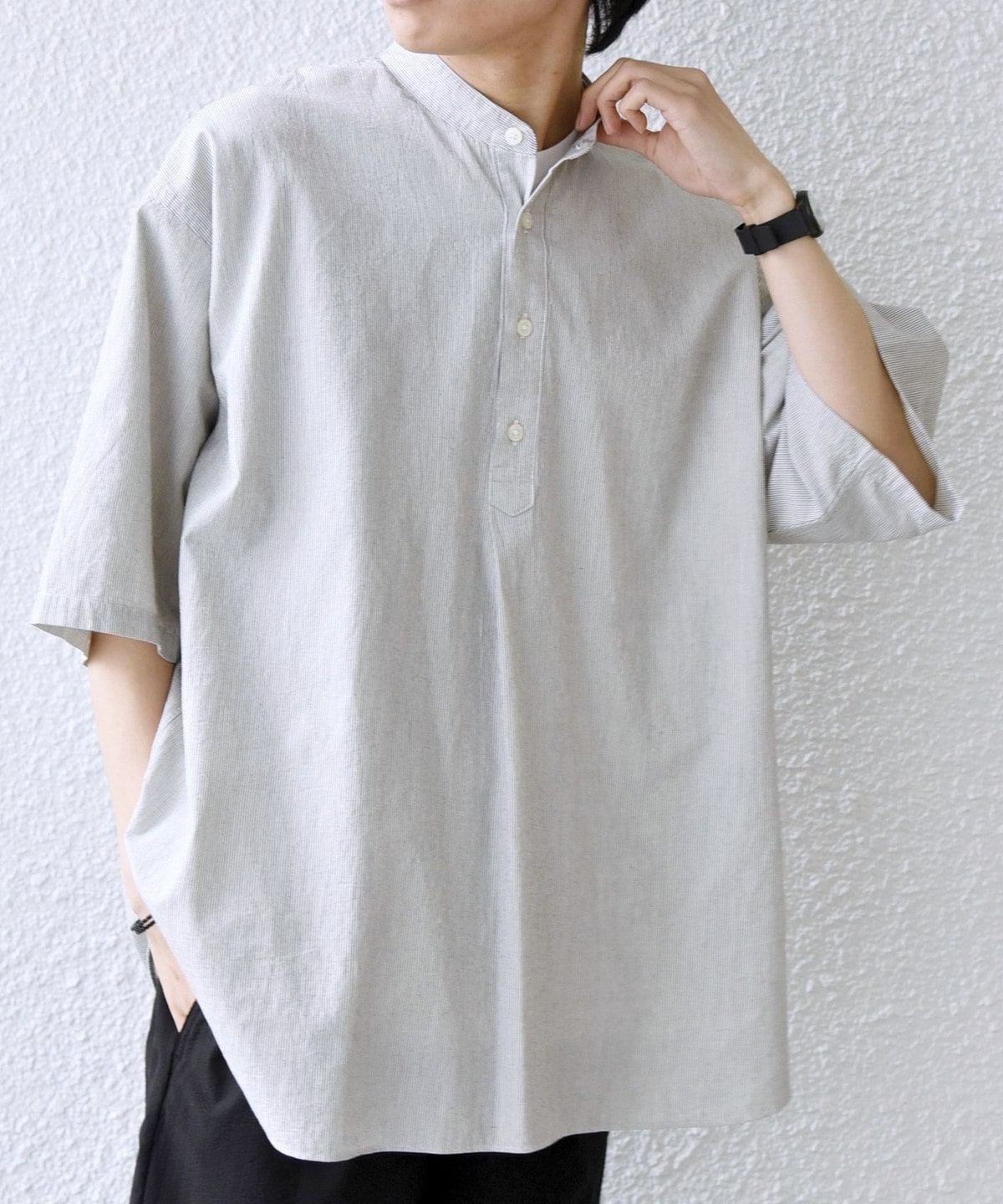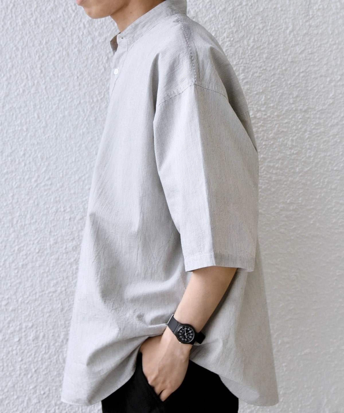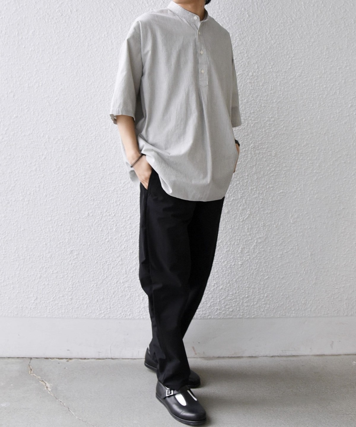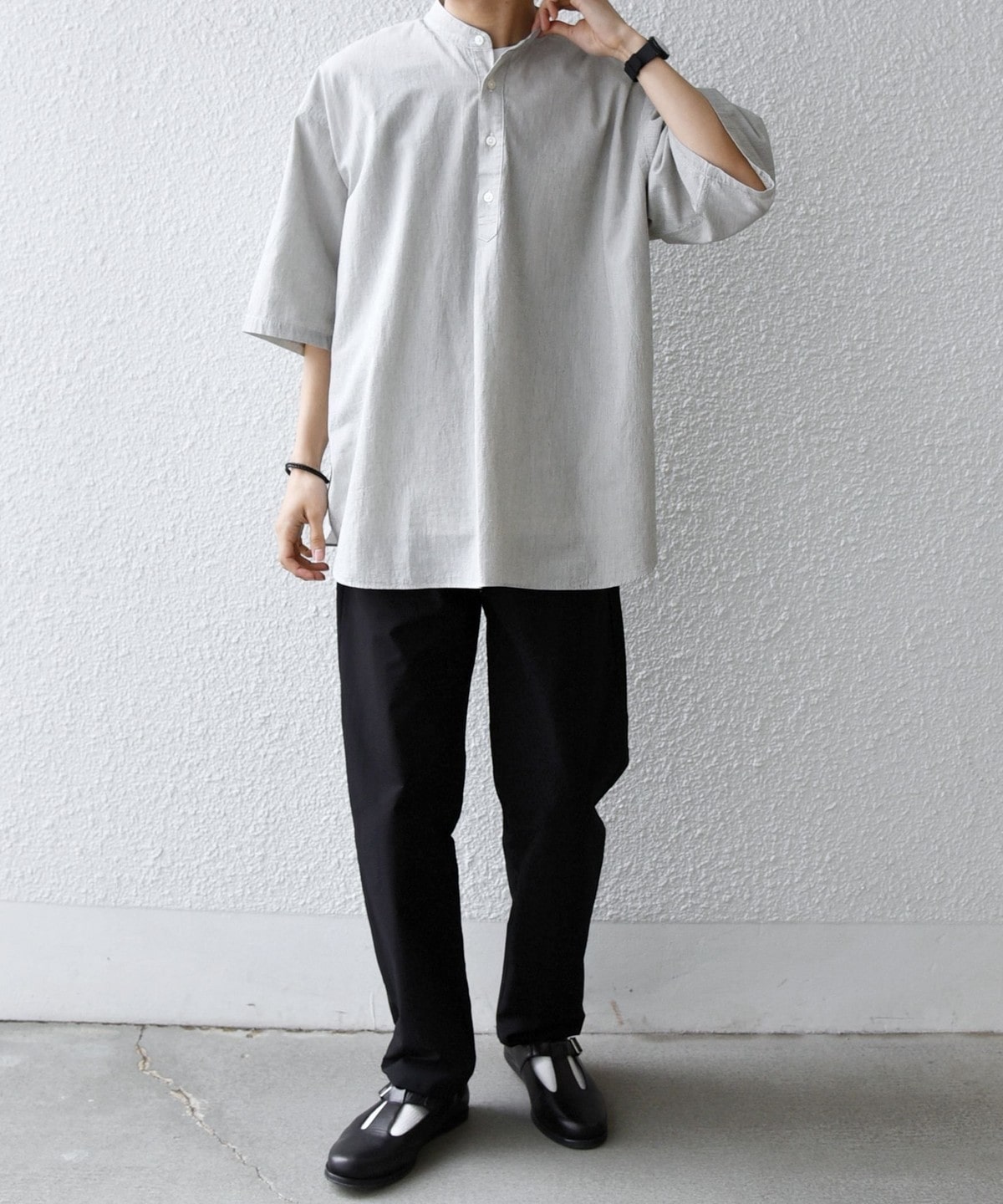 襟はバンドカラーですっきりさを出し、ボタンの開きぐあいによってはスキッパーシャツのように着こなすことも可能。
