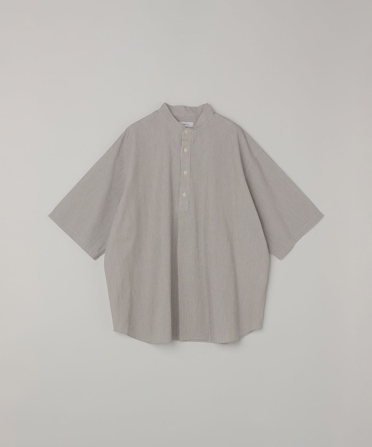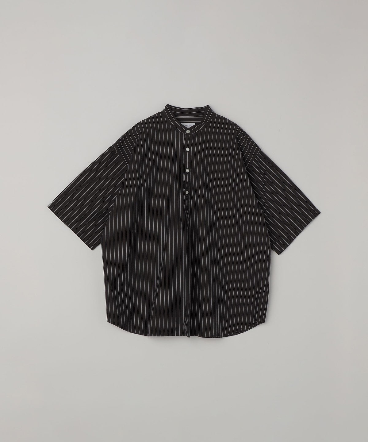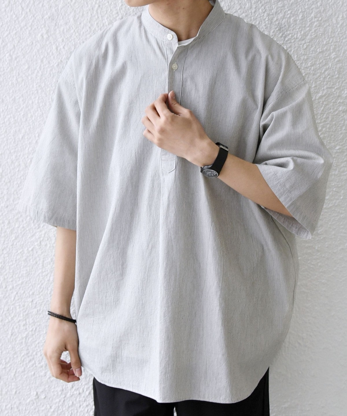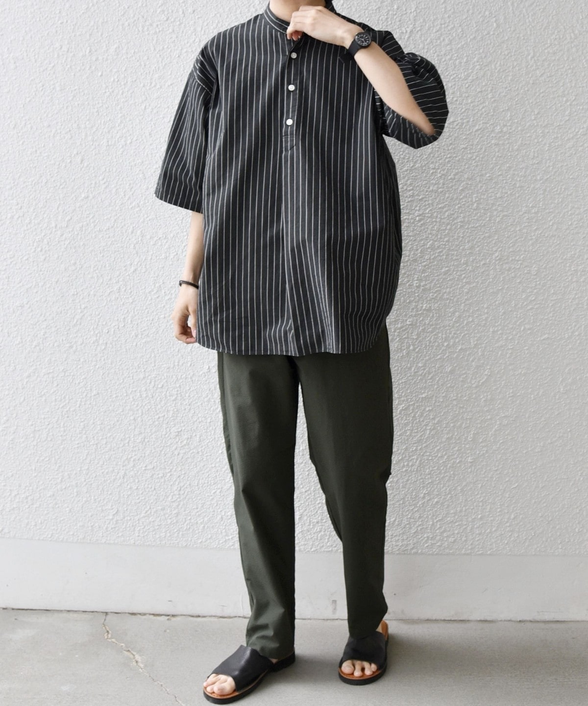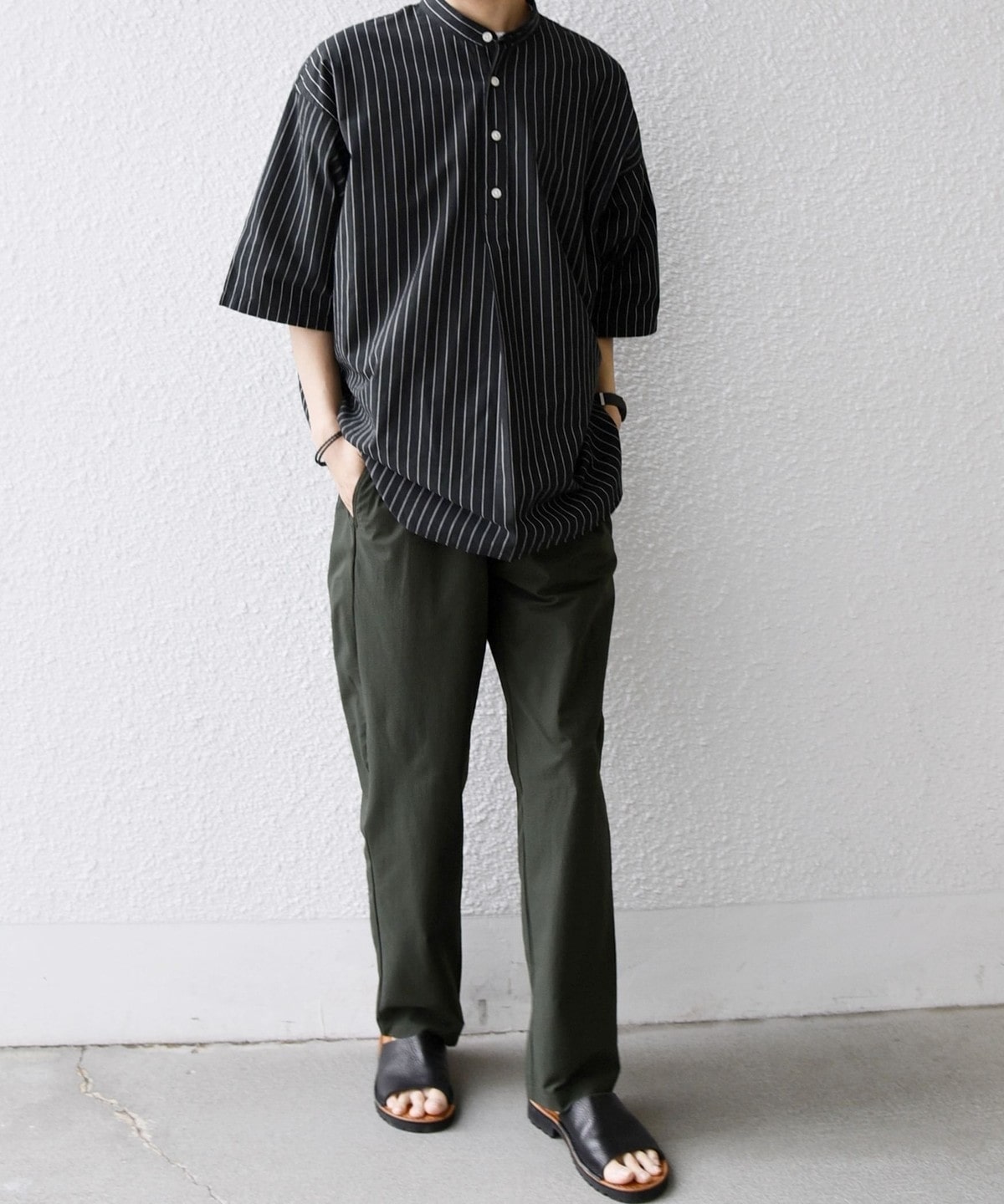 襟はバンドカラーですっきりさを出し、ボタンの開きぐあいによってはスキッパーシャツのように着こなすことも可能。