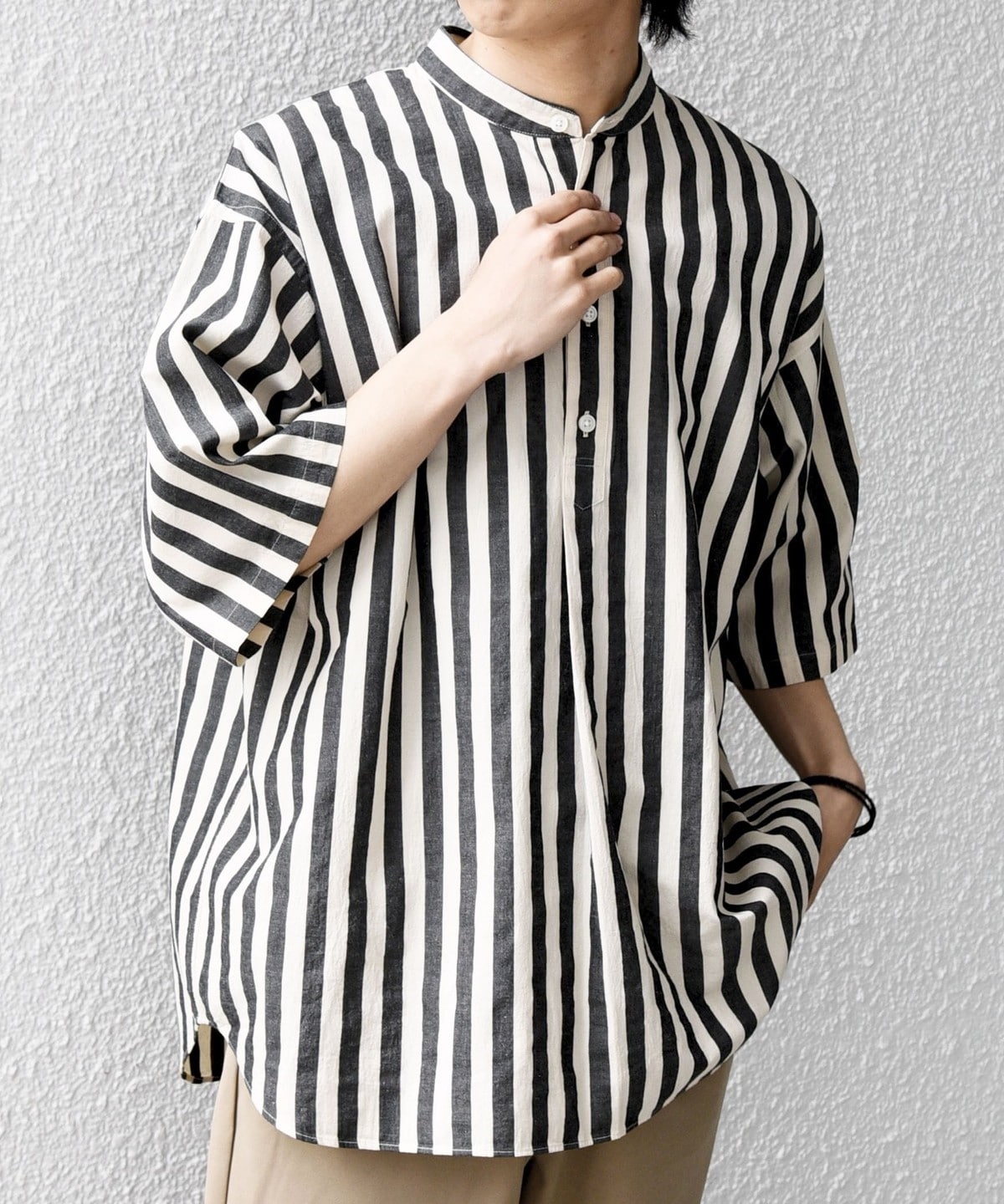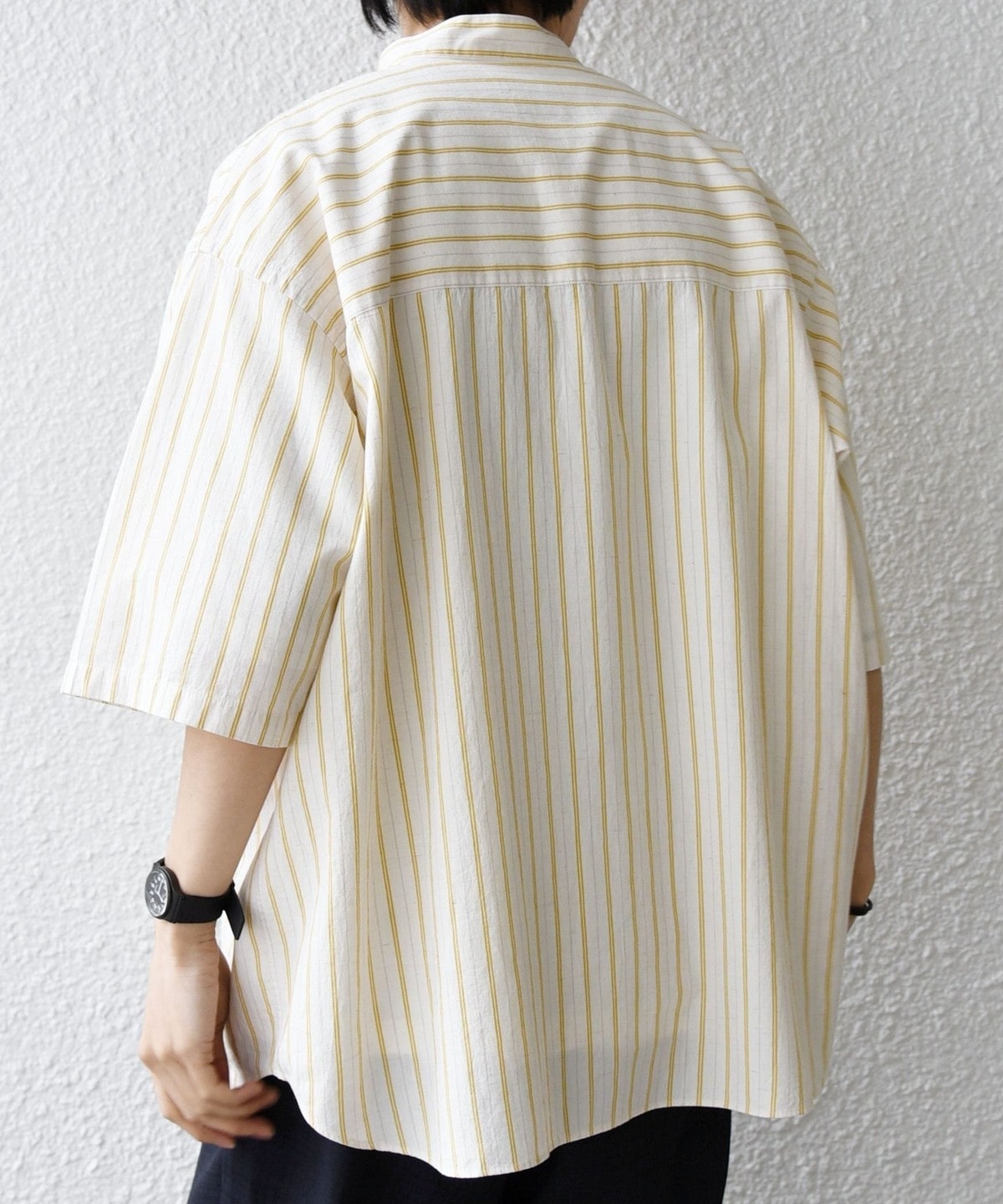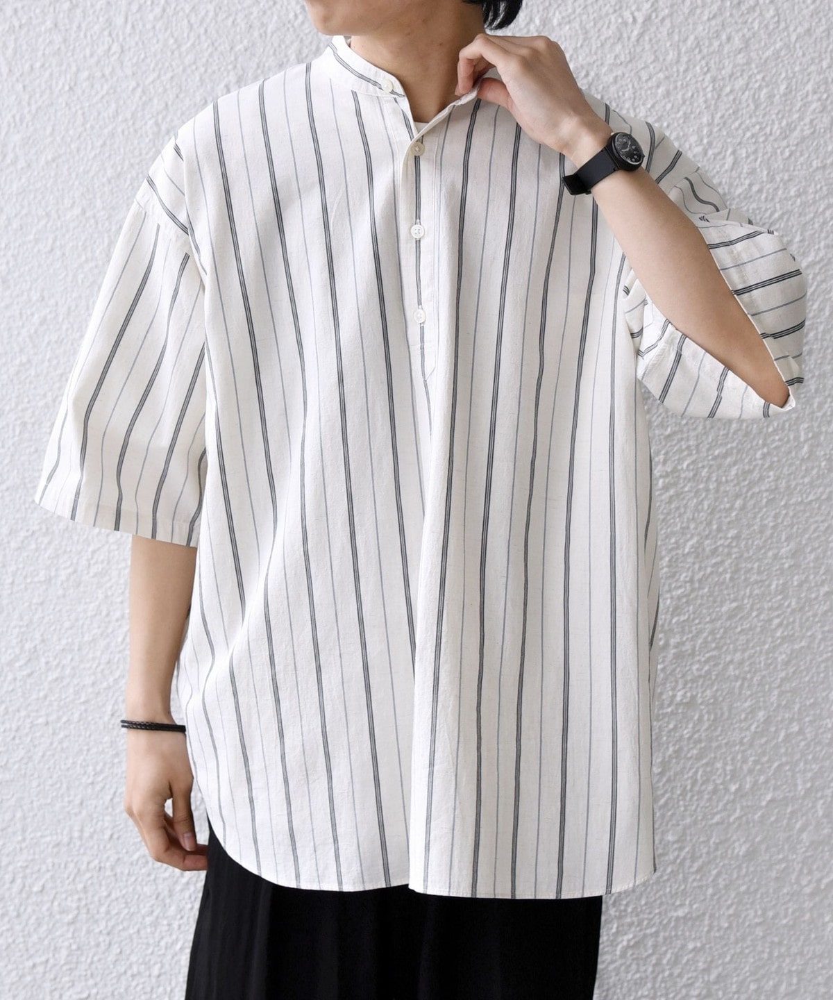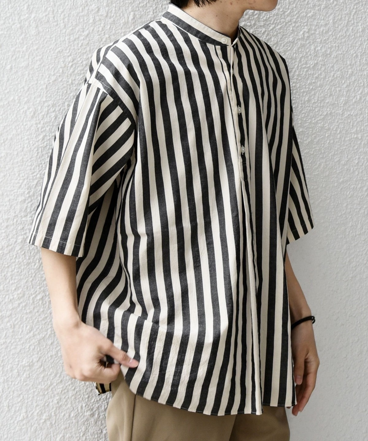 コットン×リネン素材で春夏にピッタリ!カラー毎に異なるストライプ柄を採用したバンドカラーシャツ