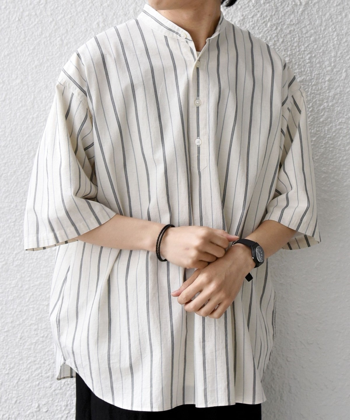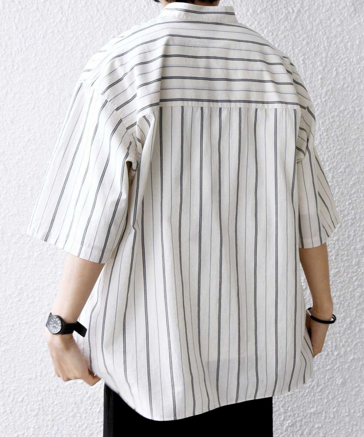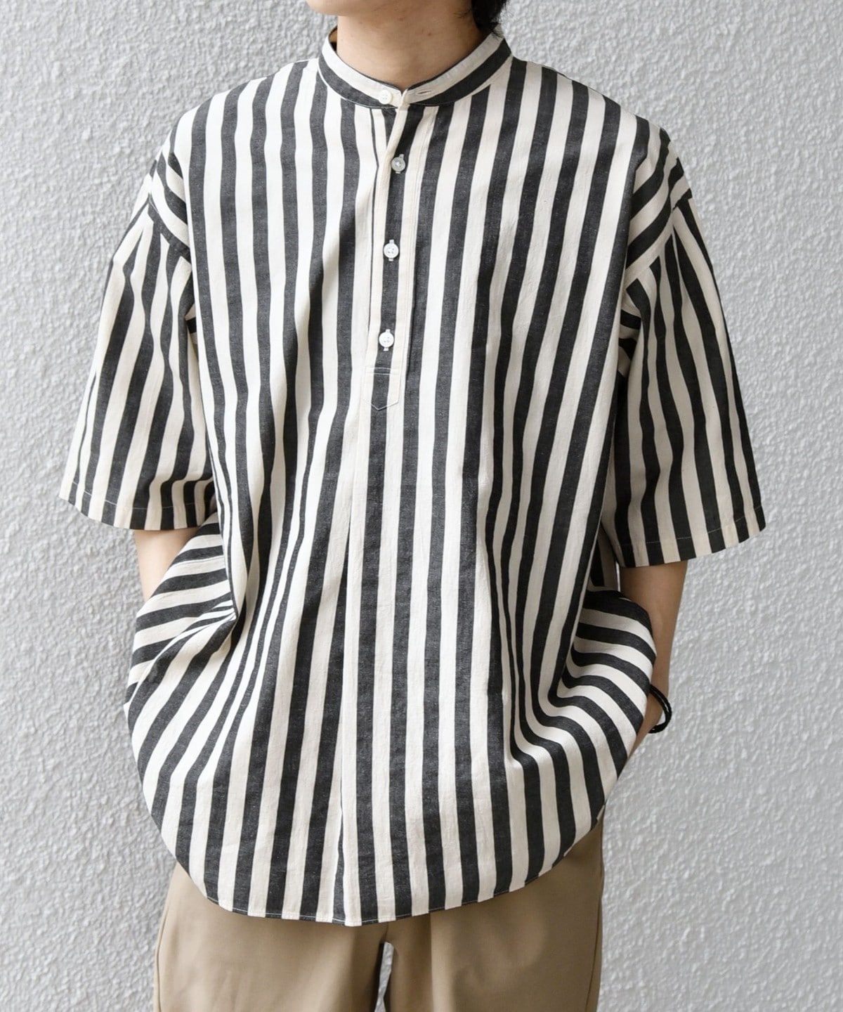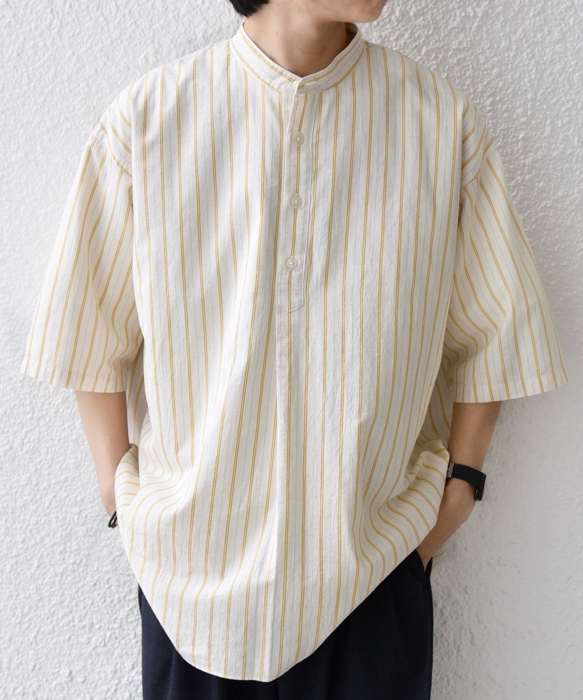 コットン×リネン素材で春夏にピッタリ!カラー毎に異なるストライプ柄を採用したバンドカラーシャツ
