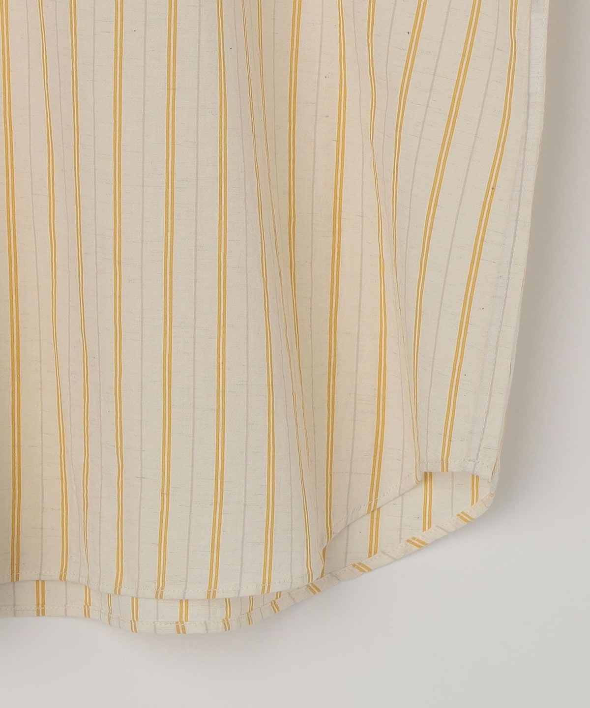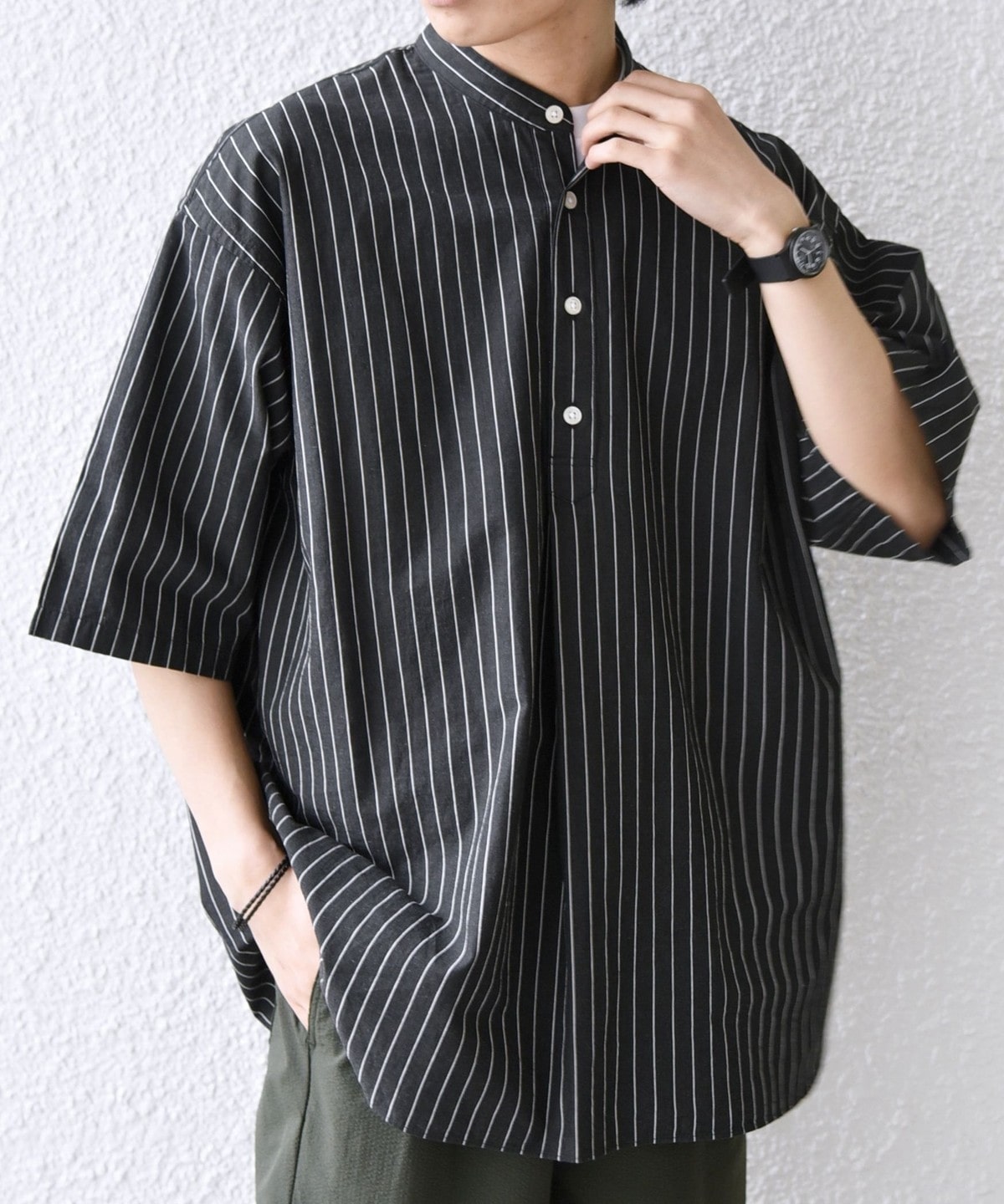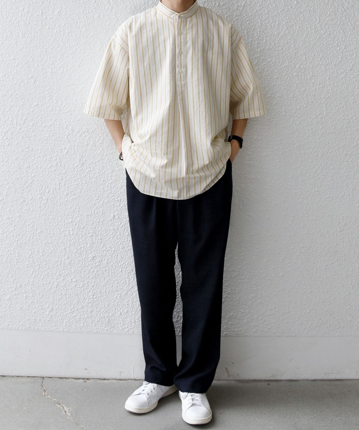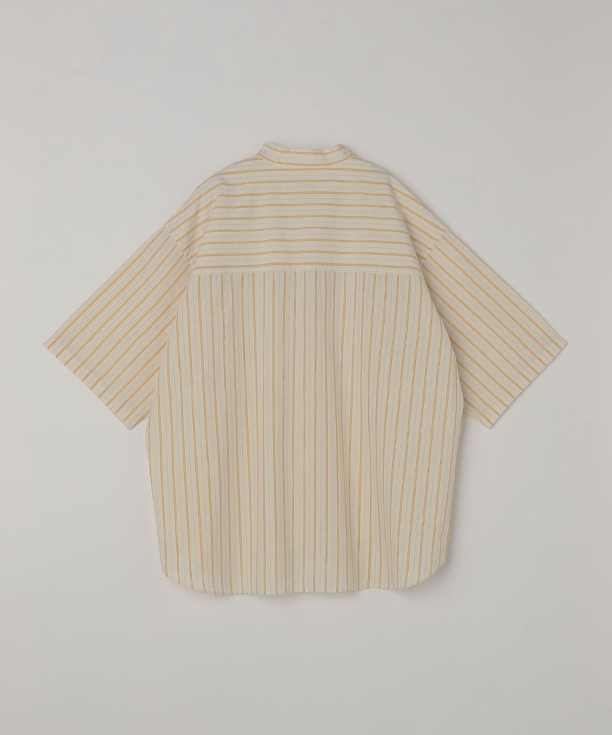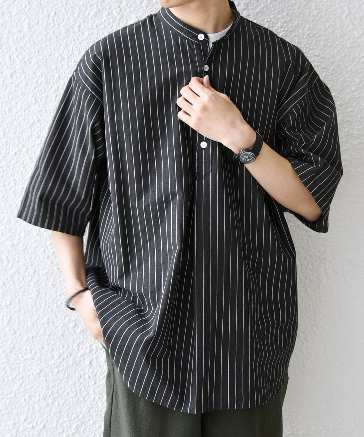 コットン×リネン素材で春夏にピッタリ!カラー毎に異なるストライプ柄を採用したバンドカラーシャツ