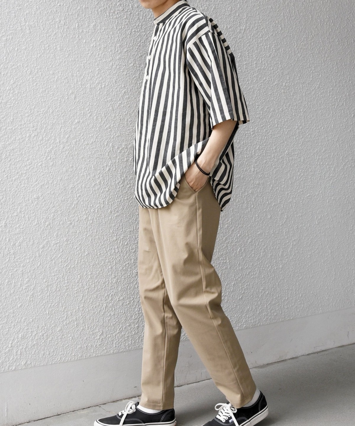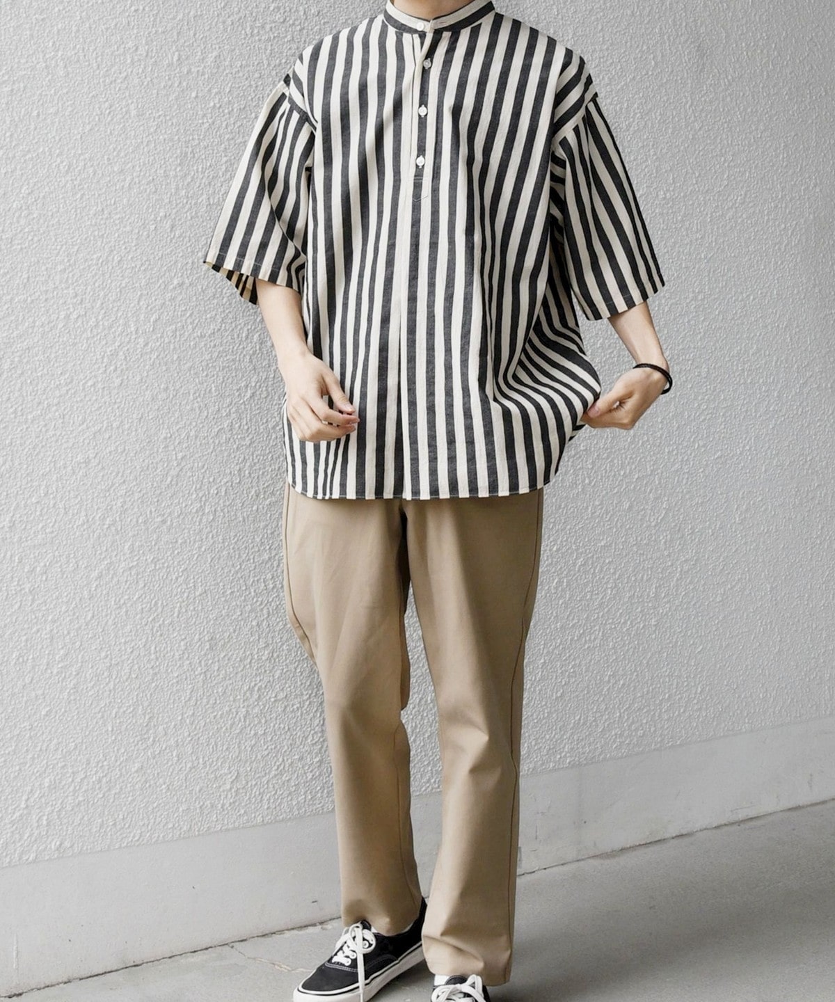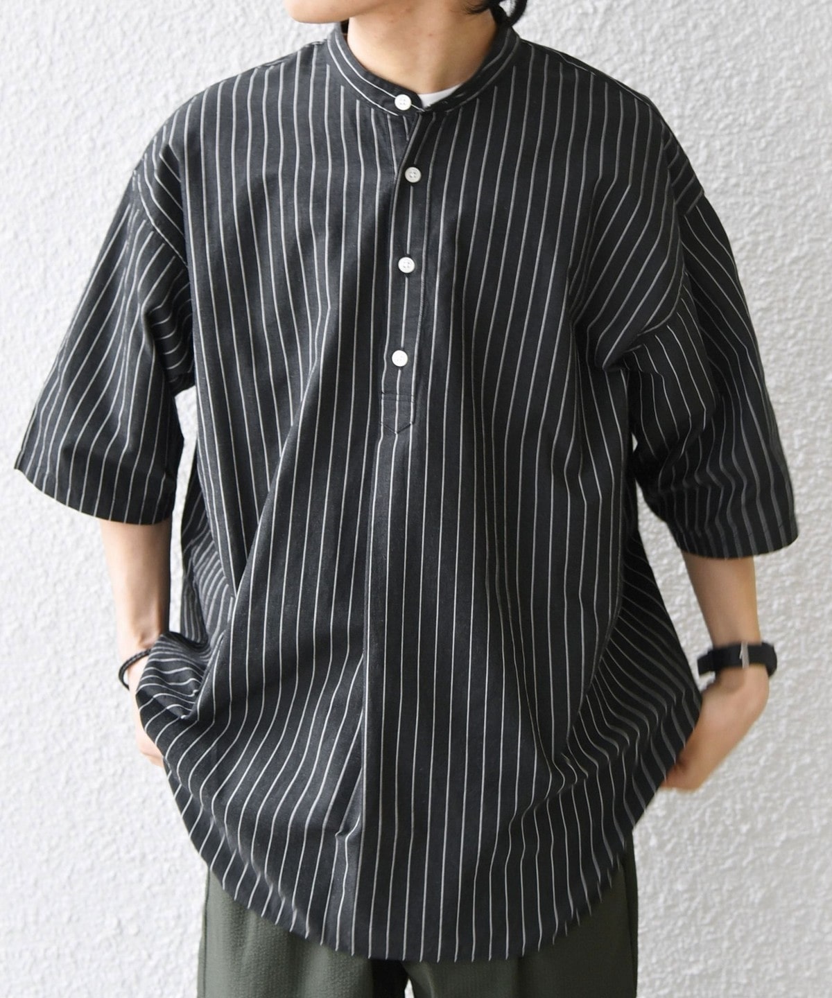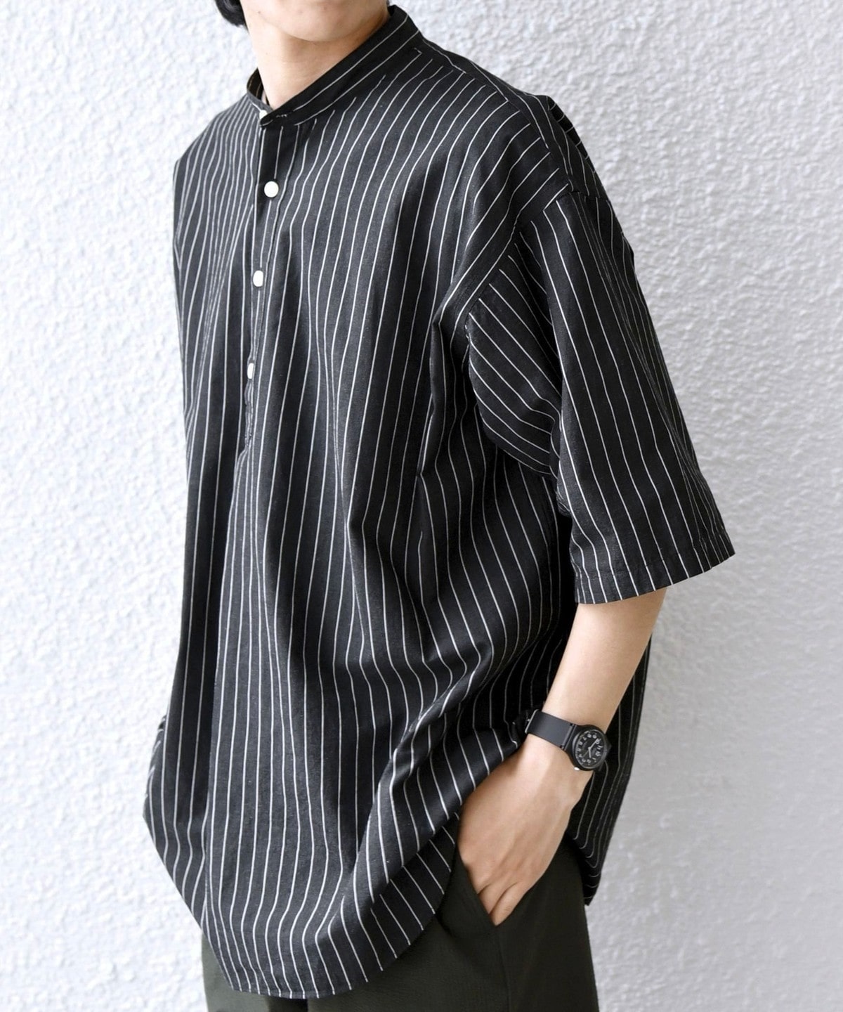 コットン×リネン素材で春夏にピッタリ!カラー毎に異なるストライプ柄を採用したバンドカラーシャツ