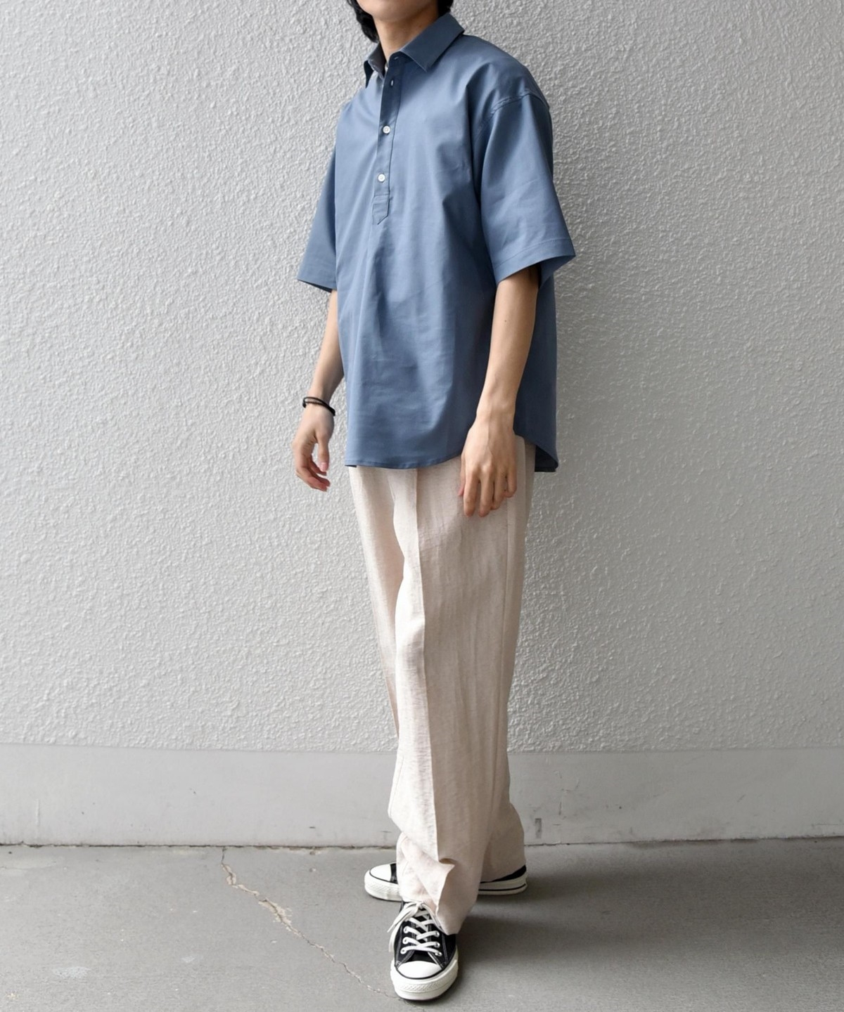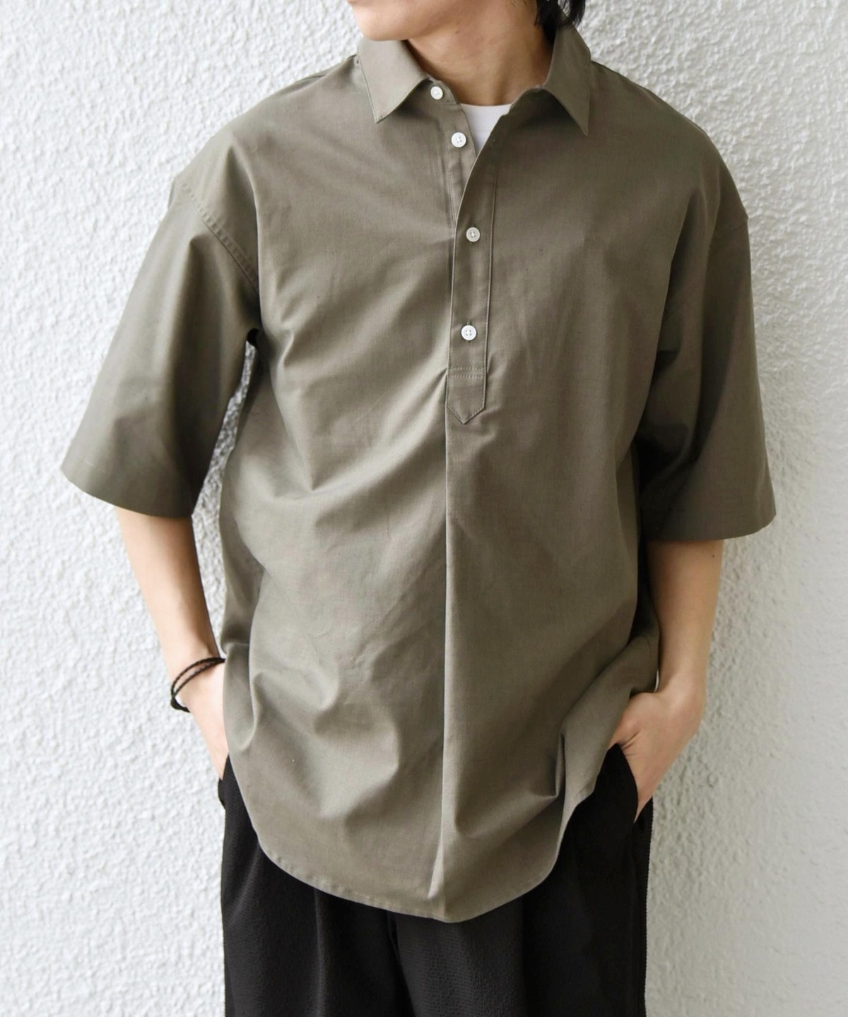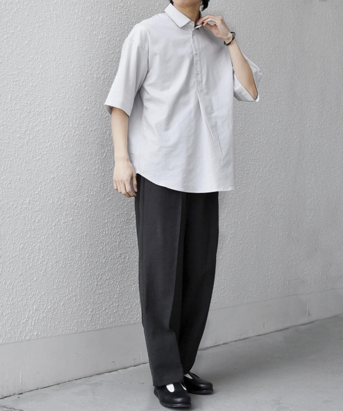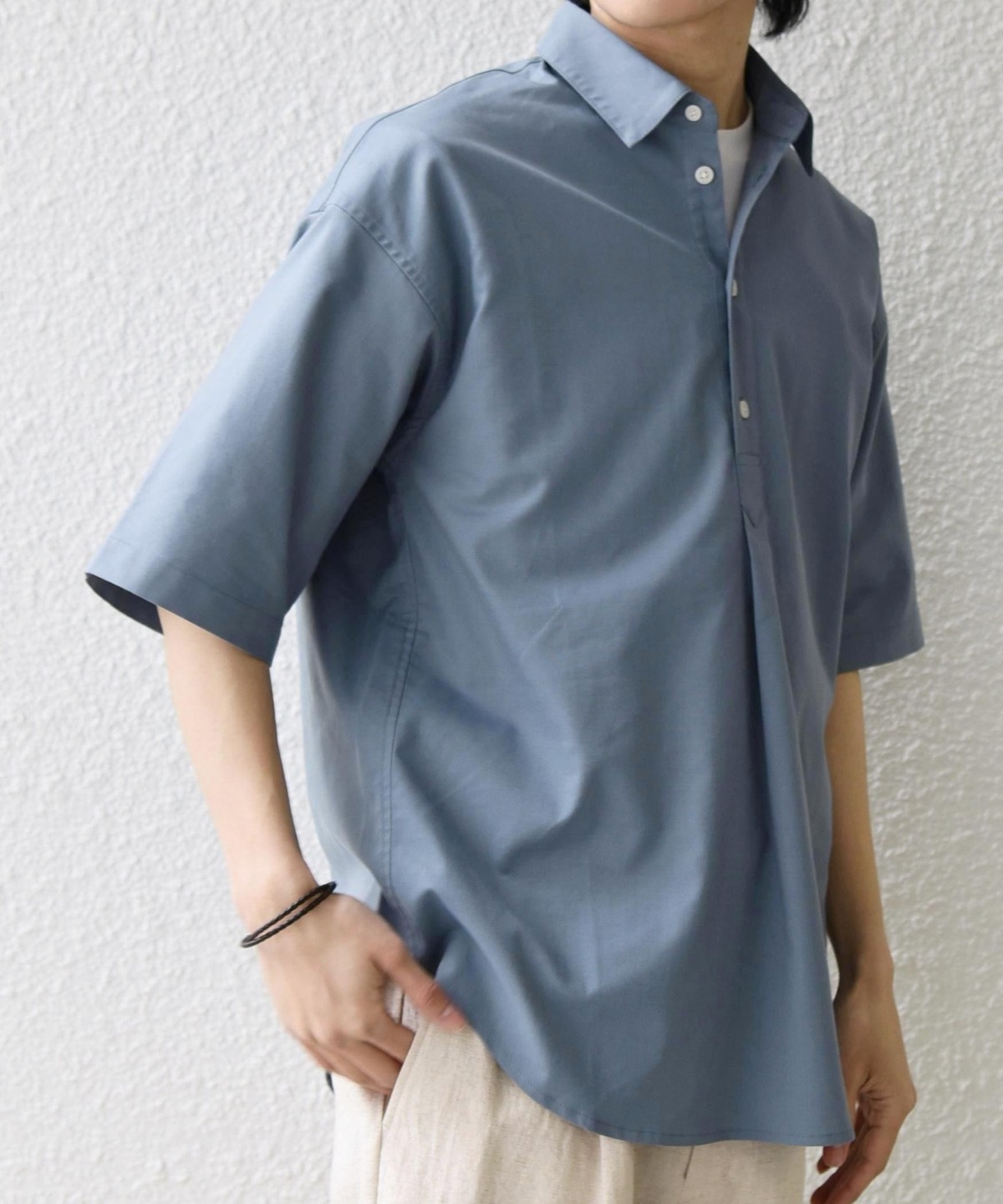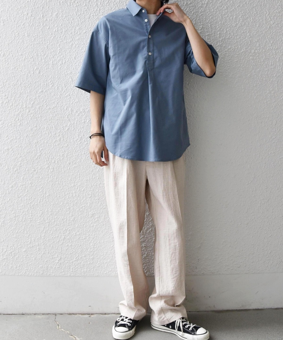 衿の開き具合でスキッパーのように見える、こなれた雰囲気に仕上げています。