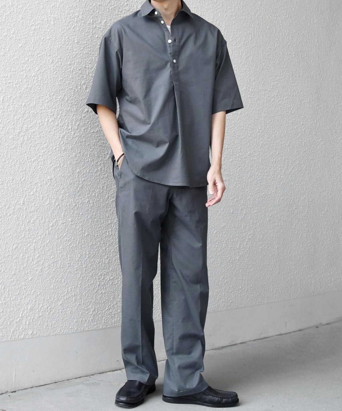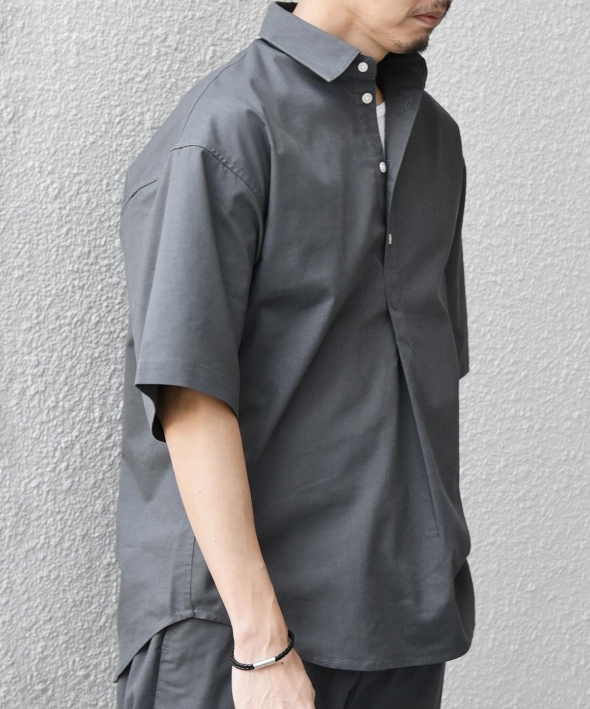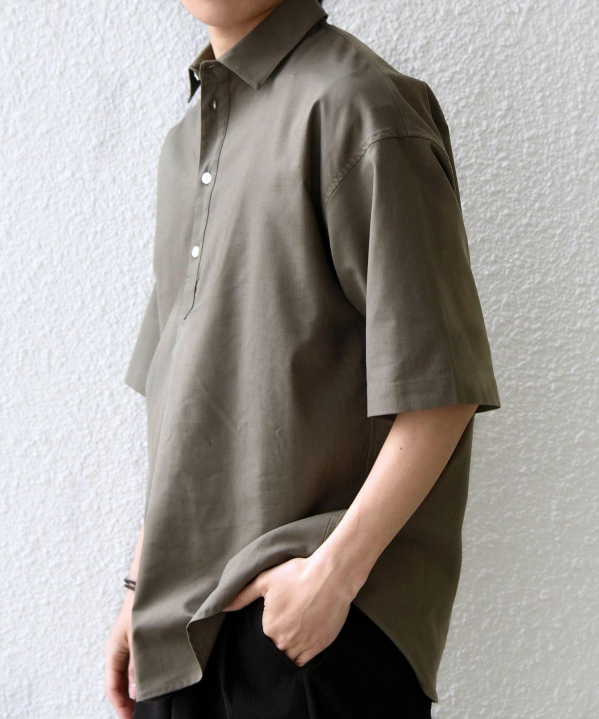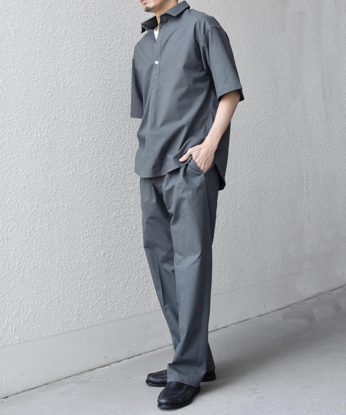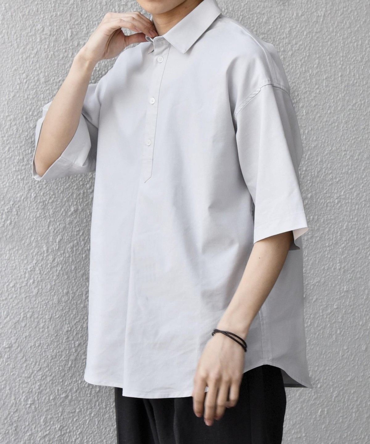 衿の開き具合でスキッパーのように見える、こなれた雰囲気に仕上げています。