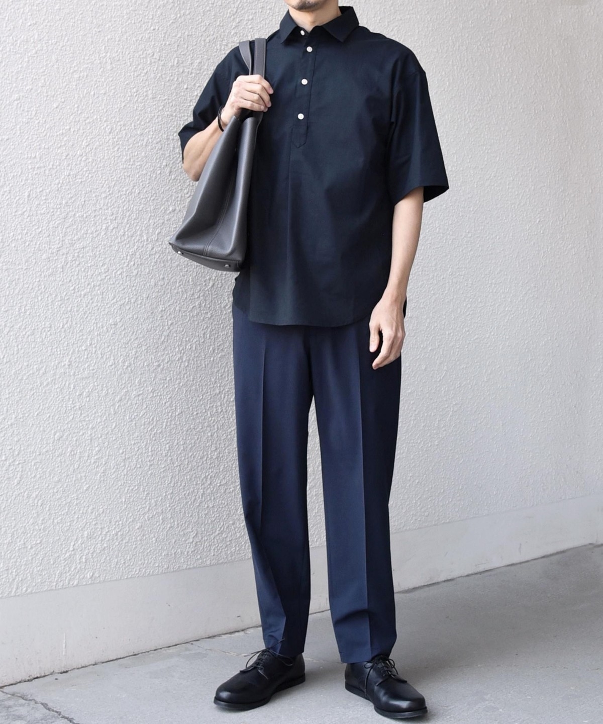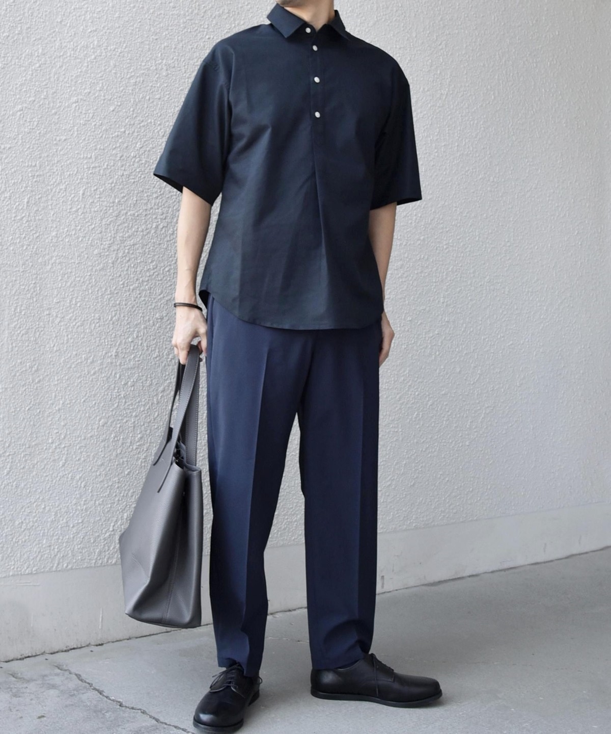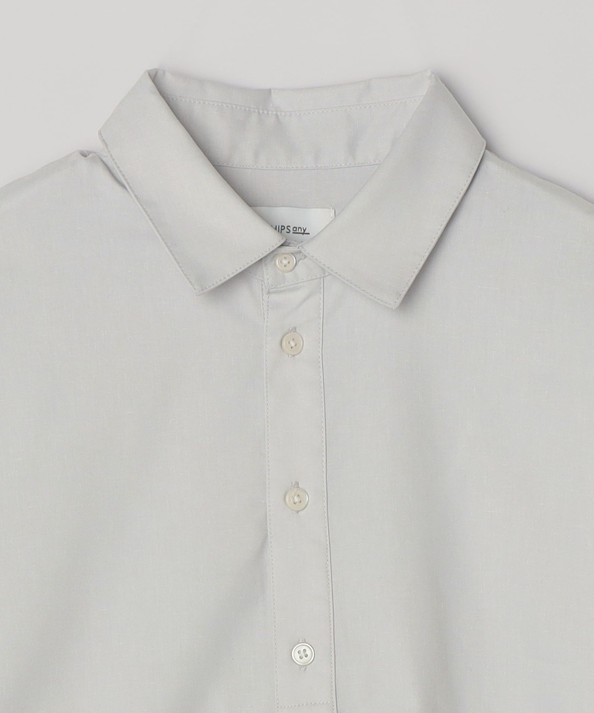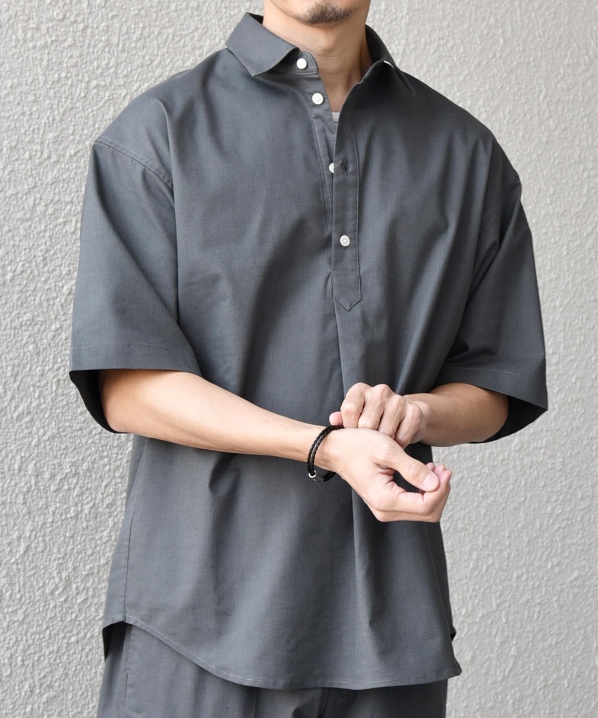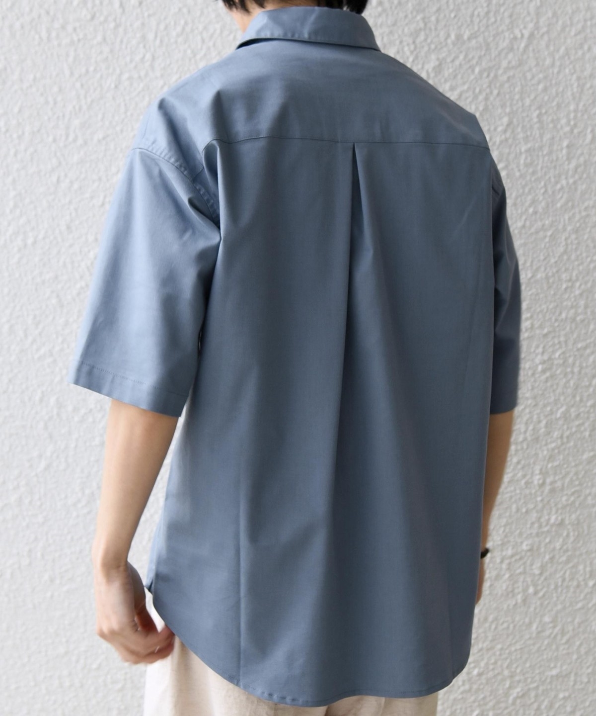 衿の開き具合でスキッパーのように見える、こなれた雰囲気に仕上げています。