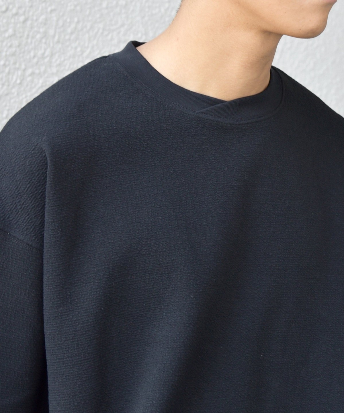首元のリブを重ねたデザインがポイント!表情感のあるフクレジャガードのダンボール生地を使用したプルオーバー